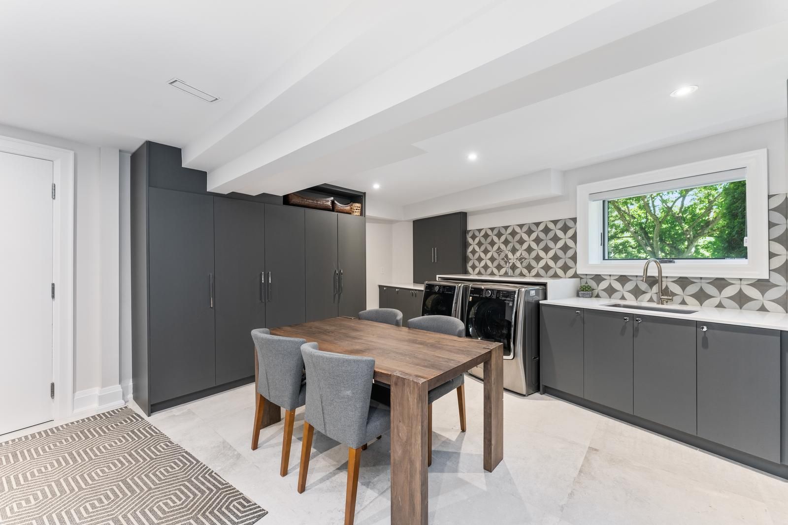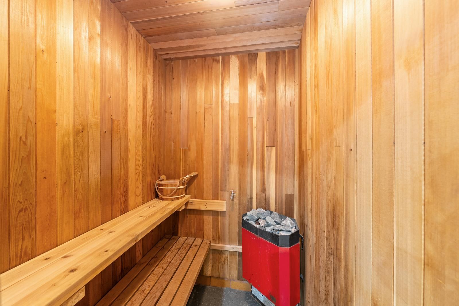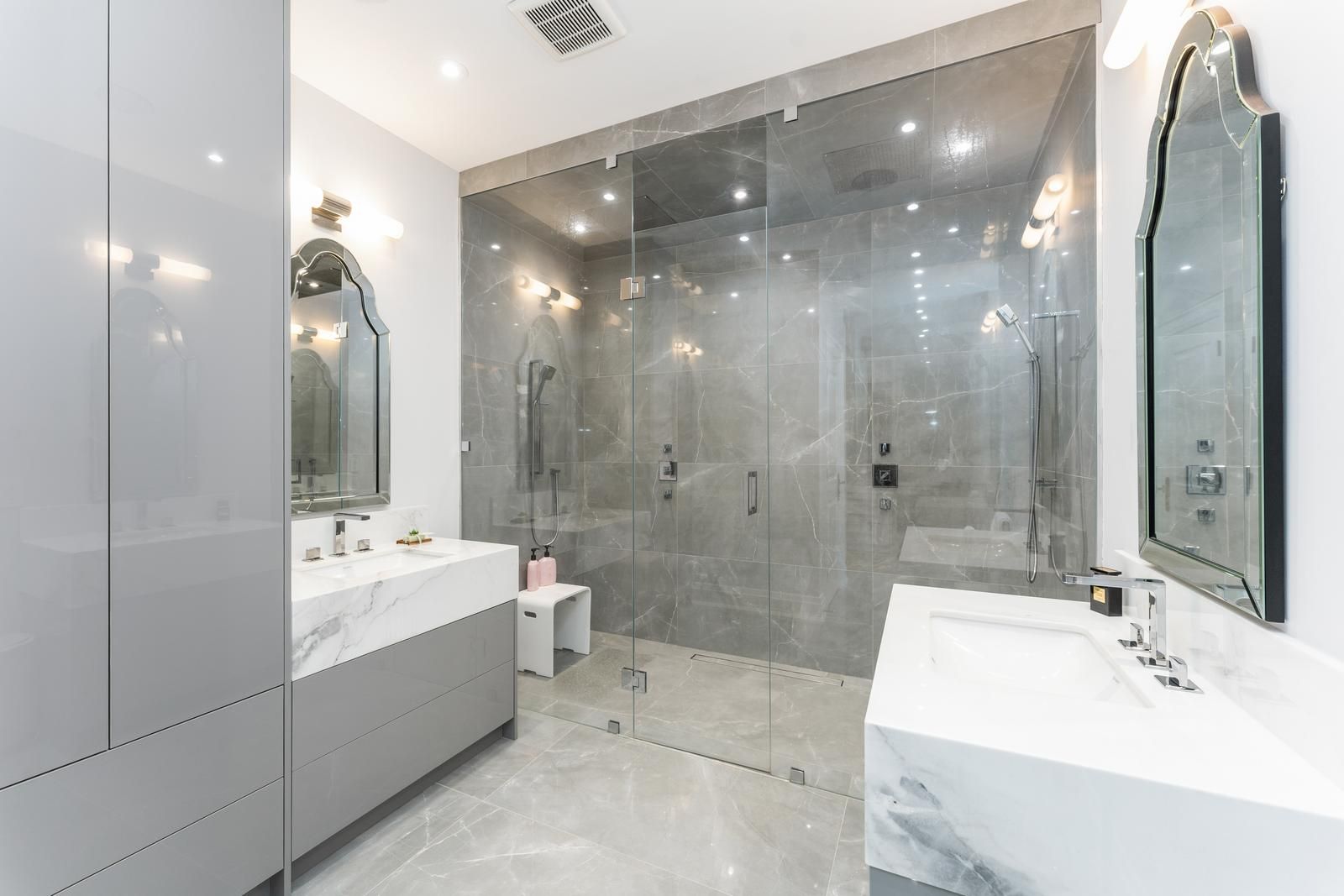 • Features modern amenities like sauna, steam room, and two kitchens.