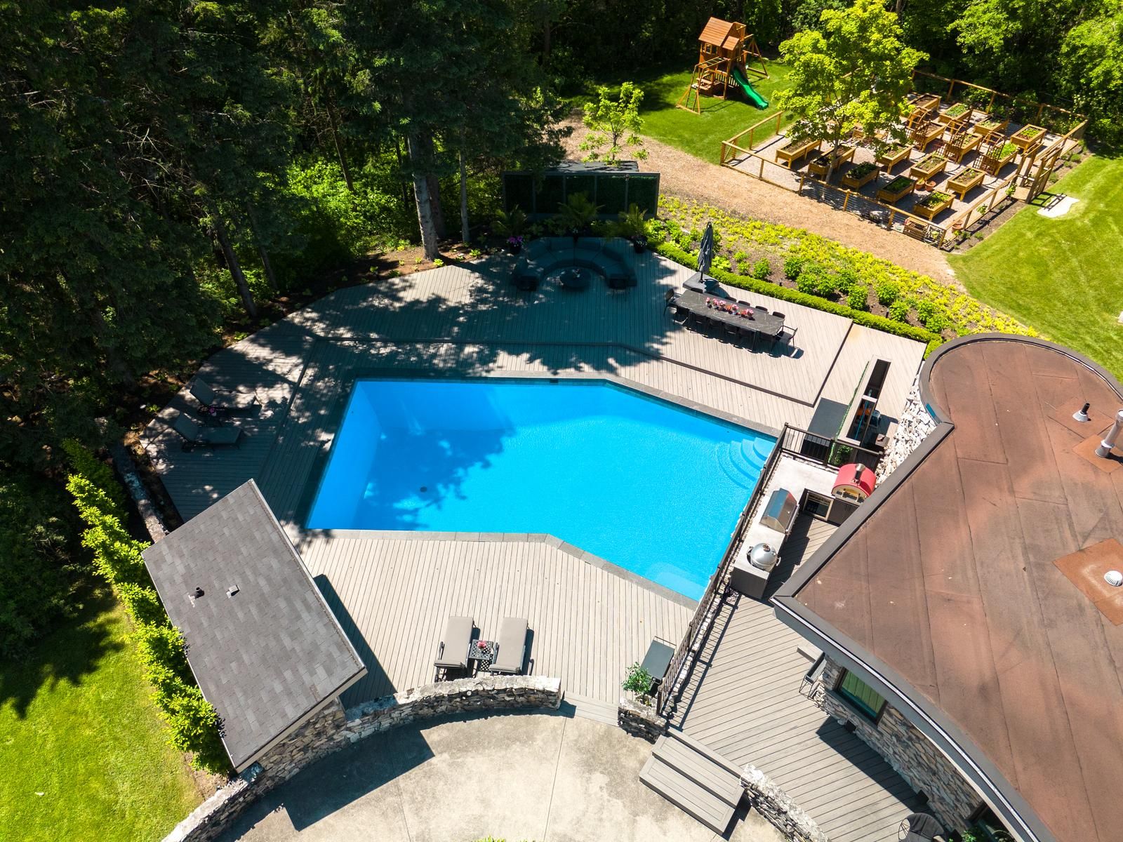 • Outdoor concrete pool with deck, bathroom, and shower for convenience.