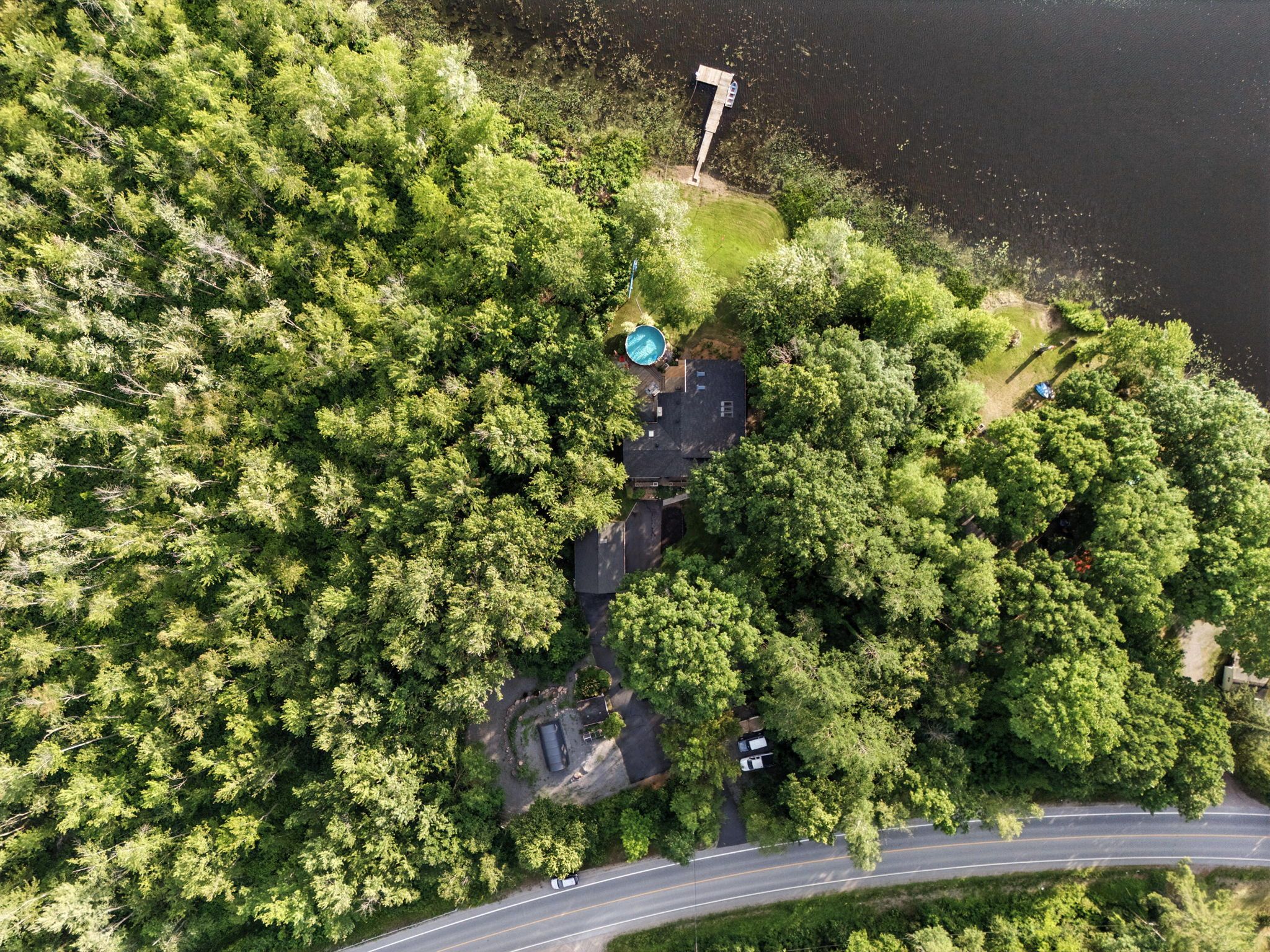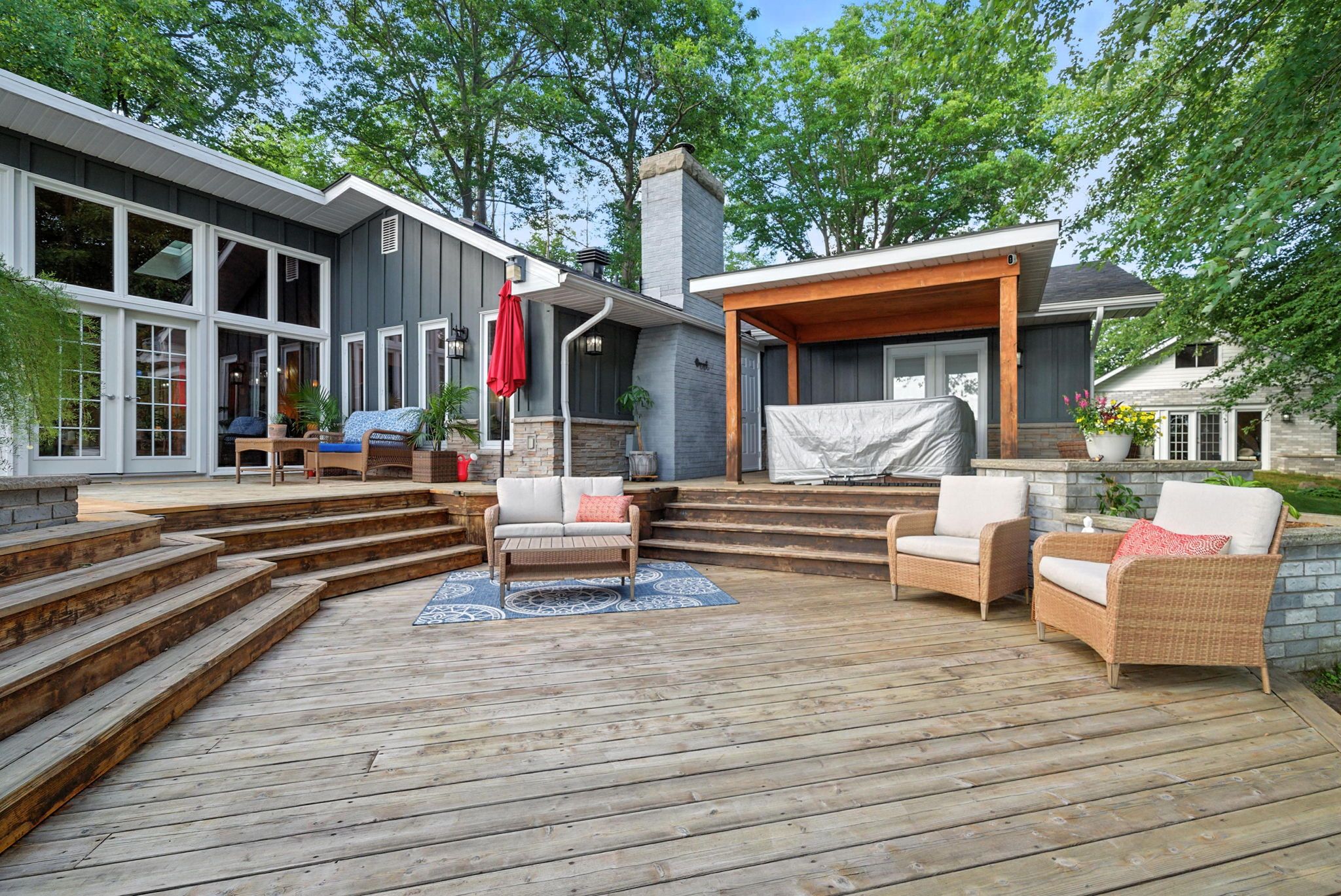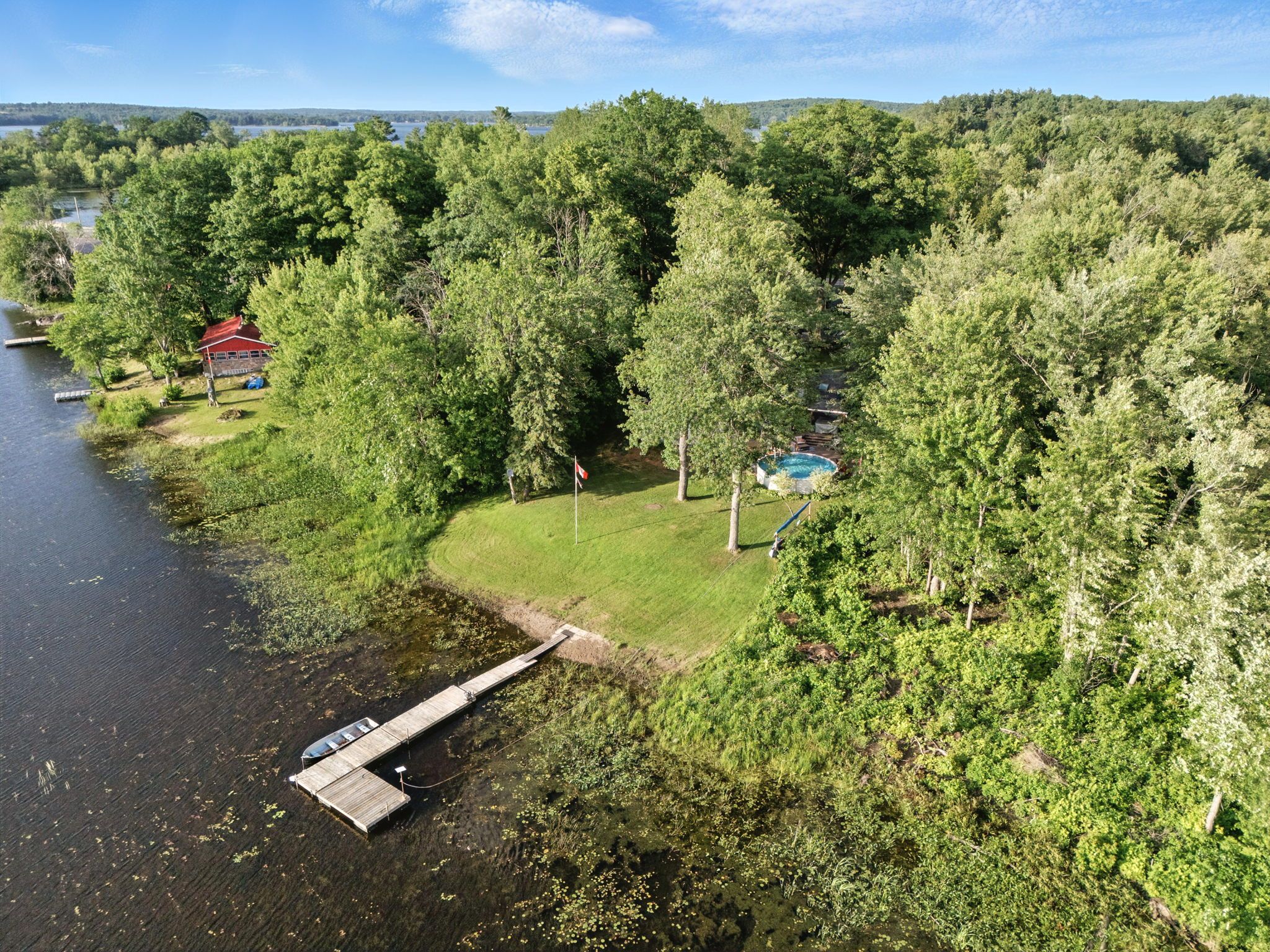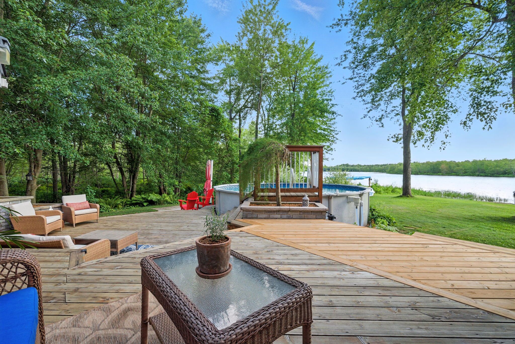 • Large back deck, above-ground pool, hot tub, and direct dock access.