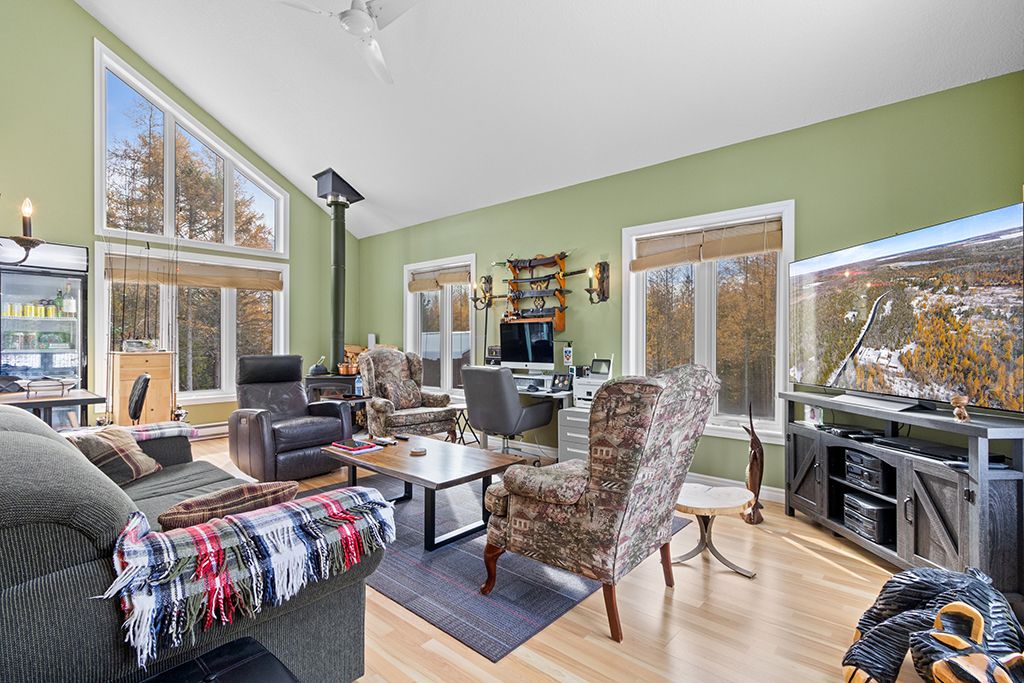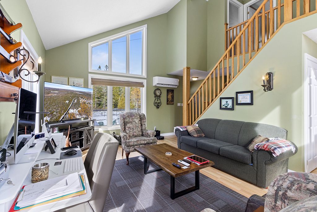 • Bright living room with vaulted ceilings and oversized windows for natural light.