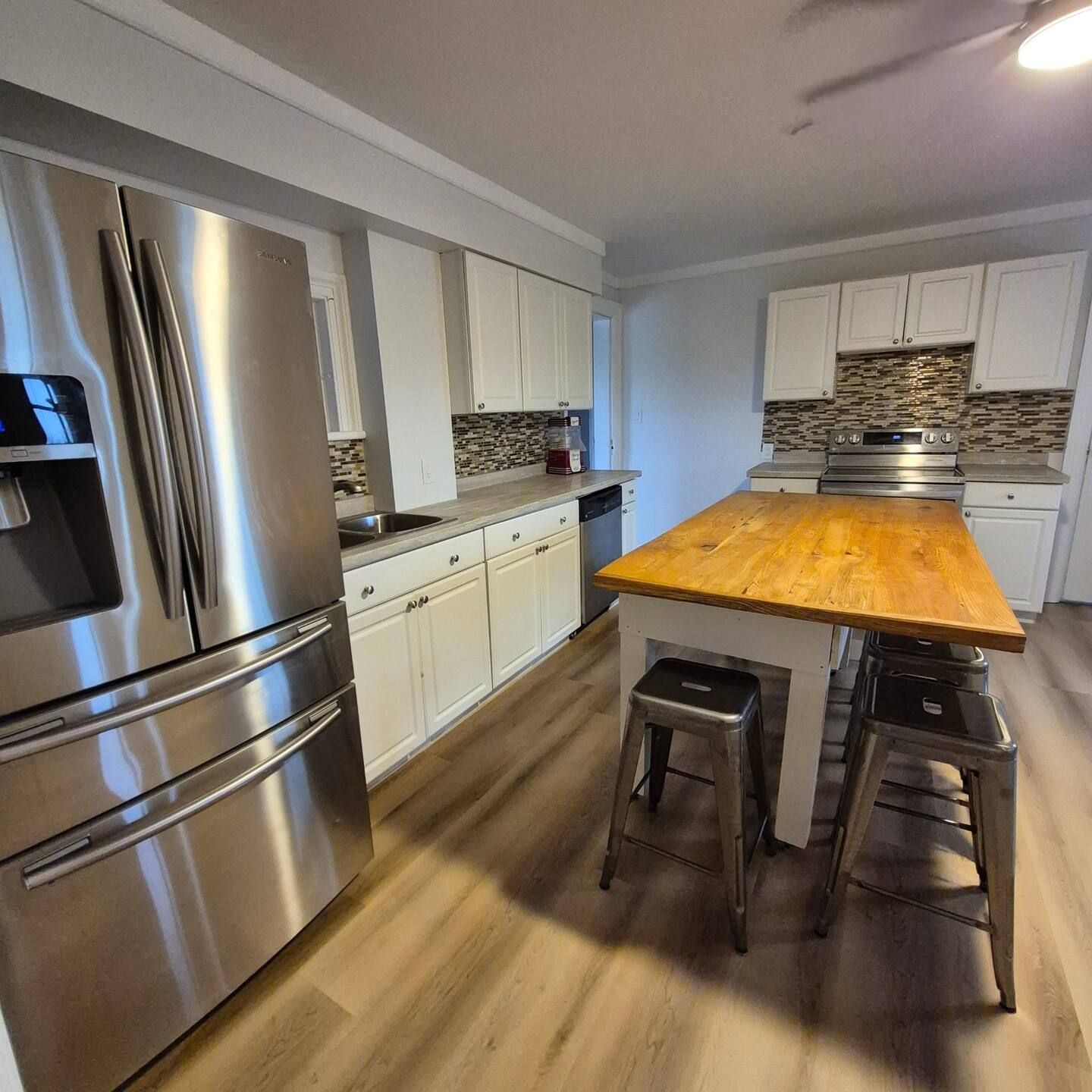 • Dining room seats eight, with a large kitchen island for extra seating.