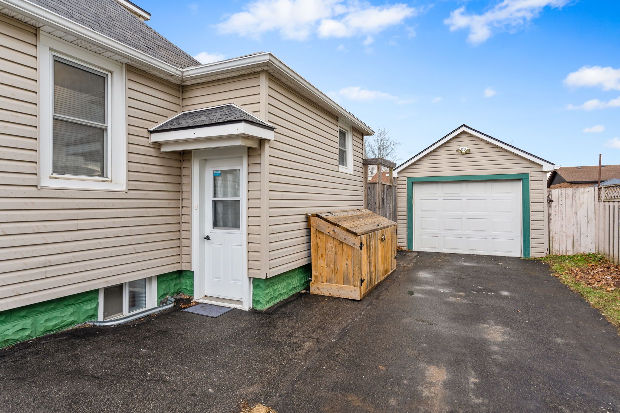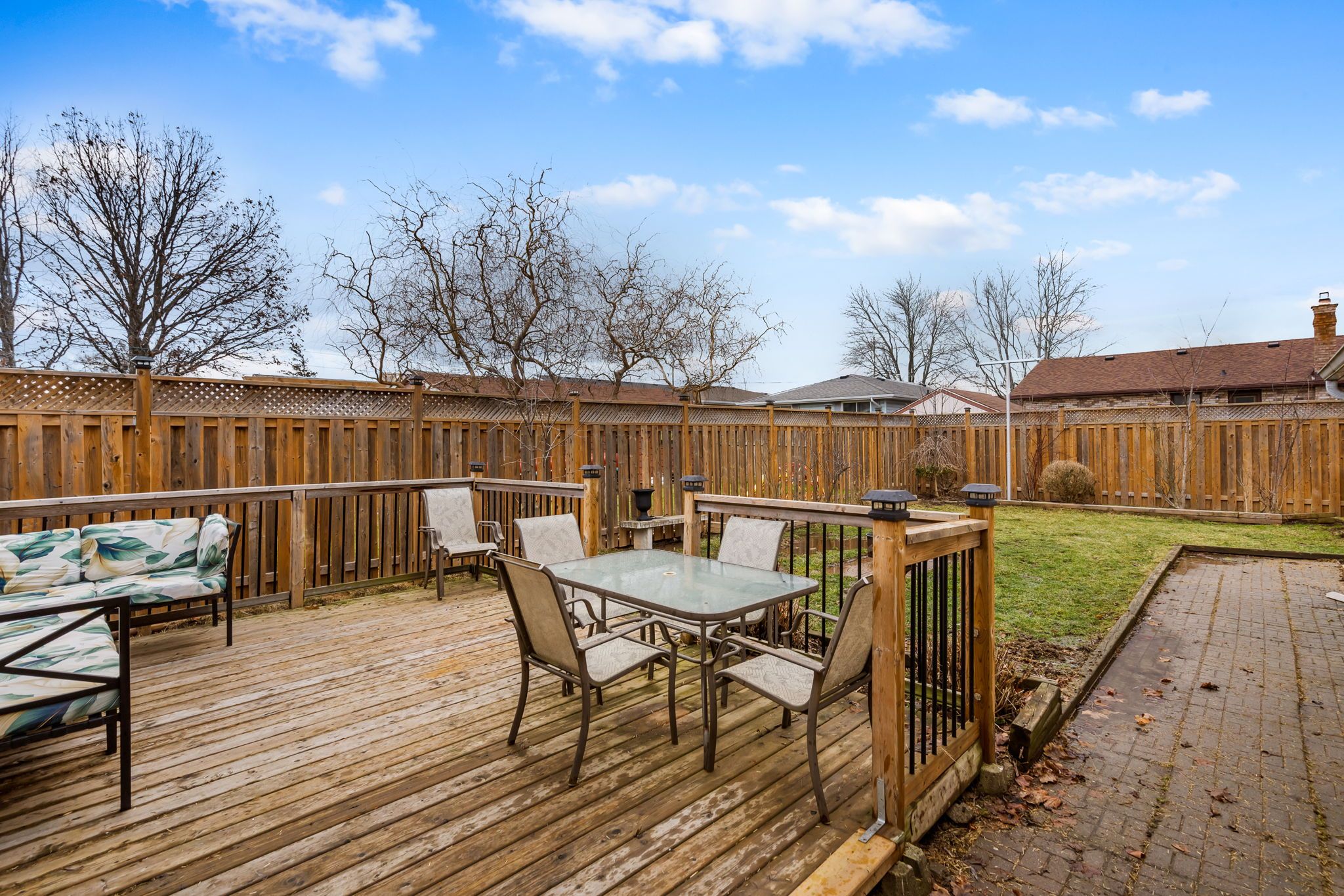 • Fully fenced backyard with a deck, garden space, and detached garage.