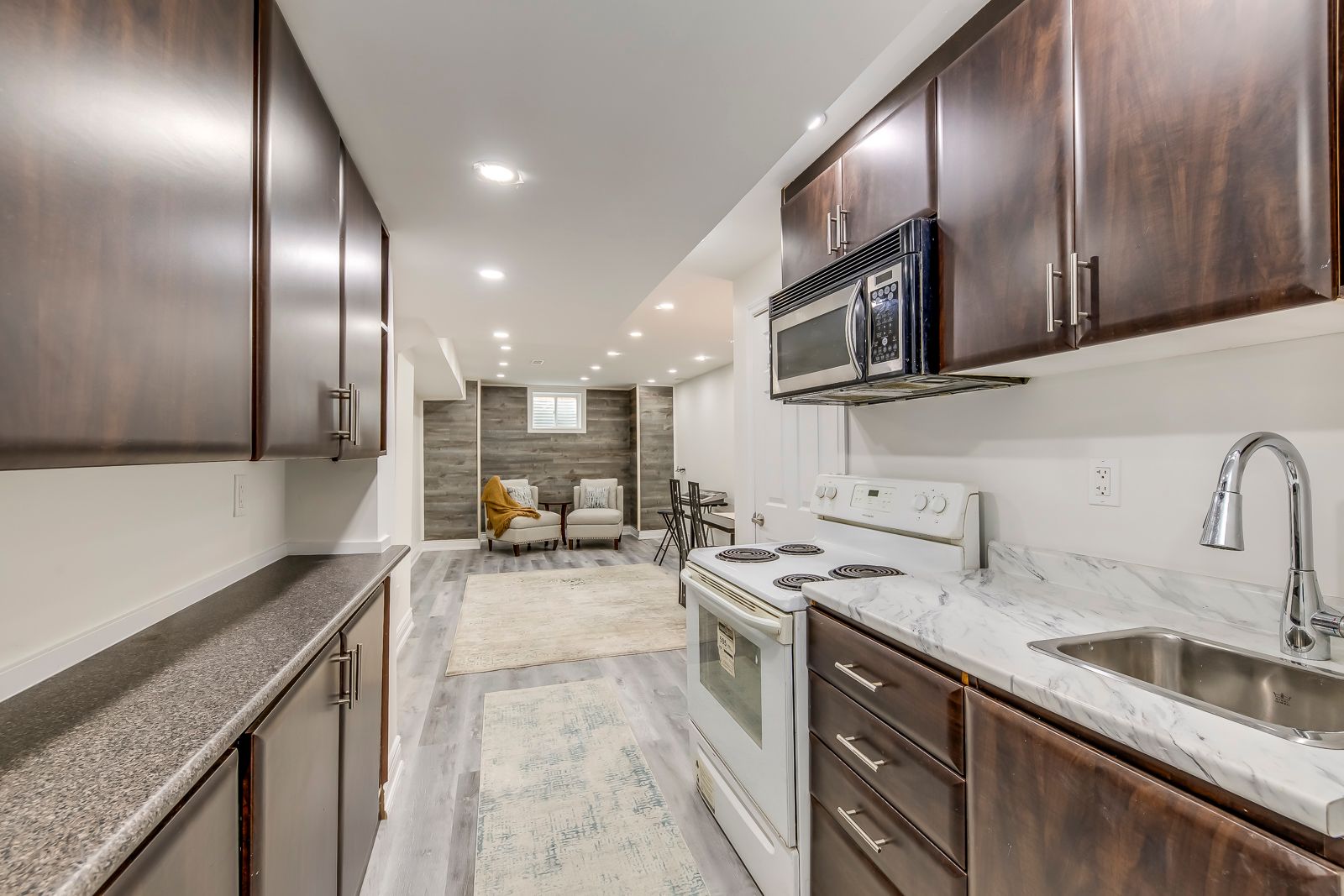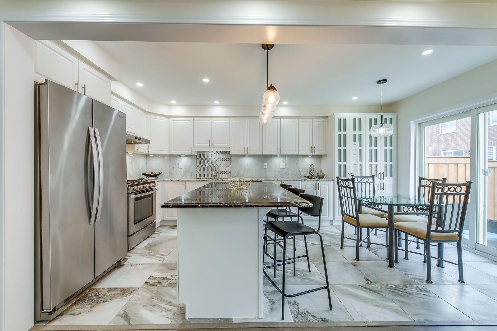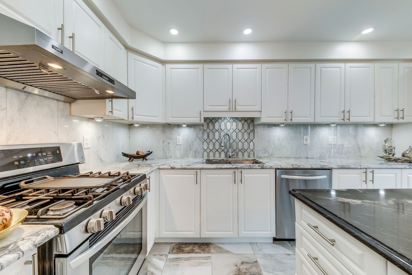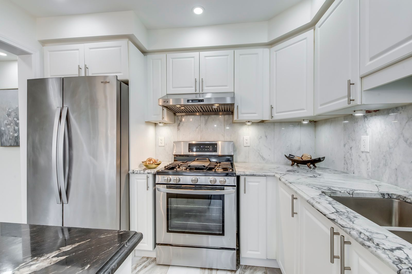 • Modern kitchen features marble countertops, stainless steel appliances, and large island.