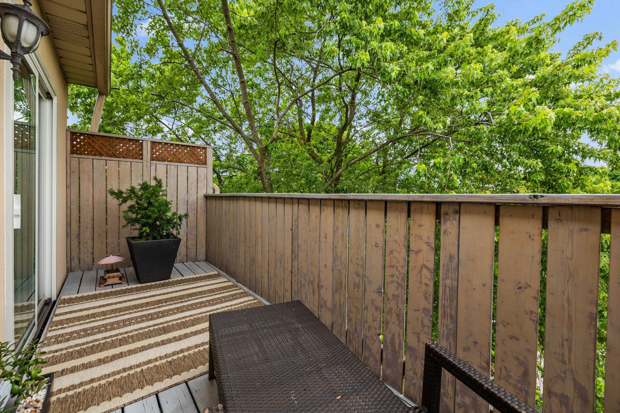 • Two private patios and a wide garage enhance functionality and convenience.