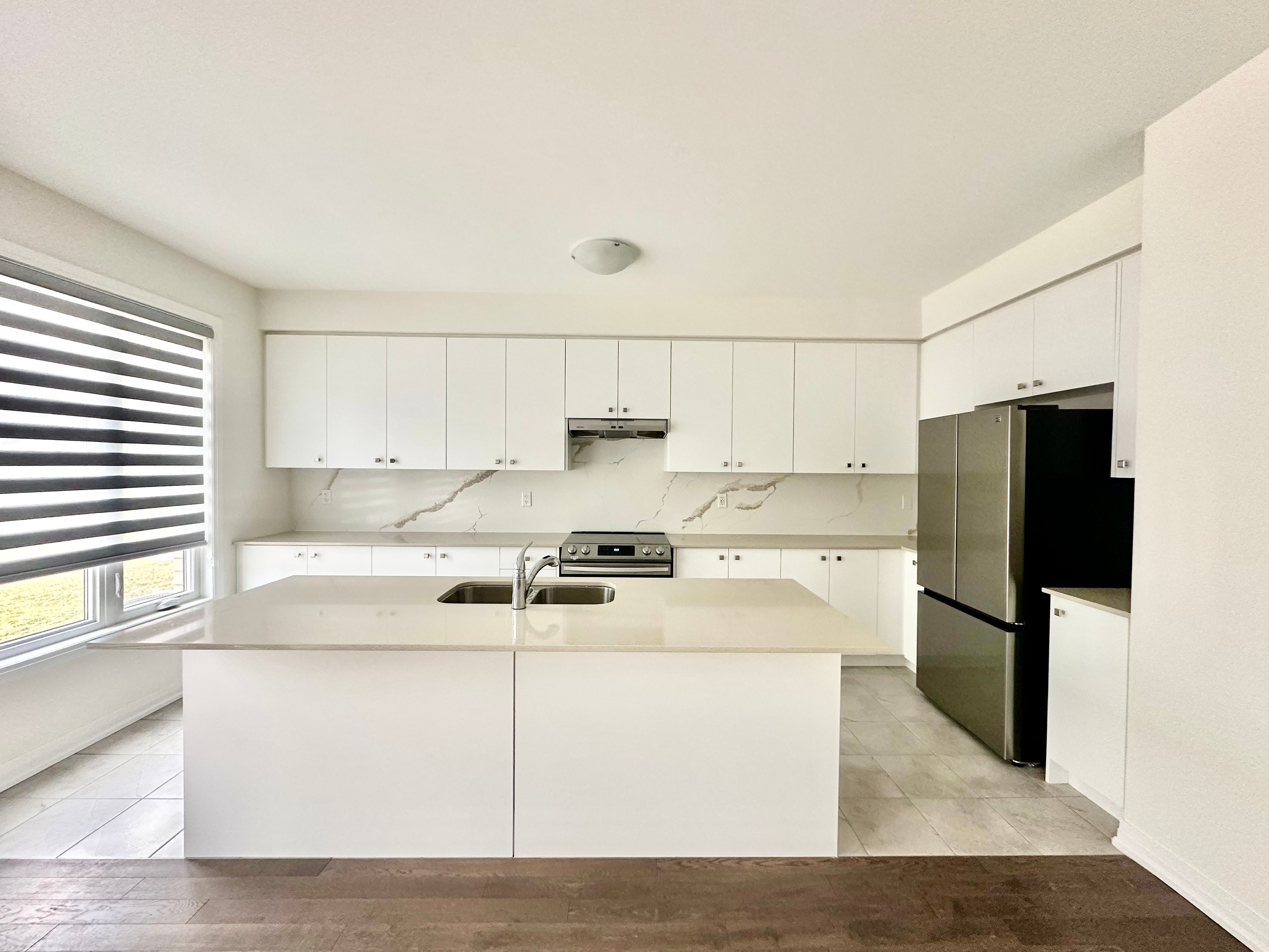 • Modern kitchen with quartz countertops and stainless steel appliances.