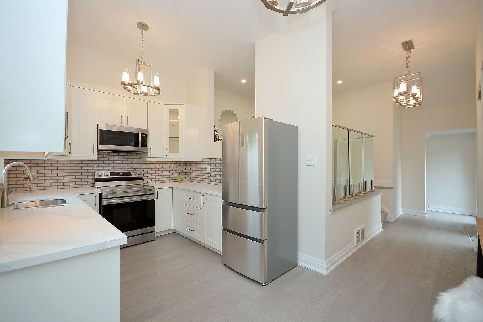 Stunning! Upgraded top to bottom with quality workmanship and material. Gleaming engineered hardwood floorthroughout. Pot lights and upgraded chandeliers. Soaring ceiling in gourmet kitchen with brand new ss appliances, granite counter, undercabinet lighting and custom backsplash. Bright, sunfilled home. Master retreat with private ensuite. Tons of storage space. Large backyard with interlock patio for summer entertaining and family enjoyment. Convenient entrance to drive -through garage. Gdo. Finished basement with 3pc bath and kitchenette rough-in. Seller can assist in converting the basement into private in-law suite with separate entrance if buyer requires. Fantastic neighborhood and neighbors. Great schools. Quiet family street just minutes shopping plazas,highway, go, and all amenities.