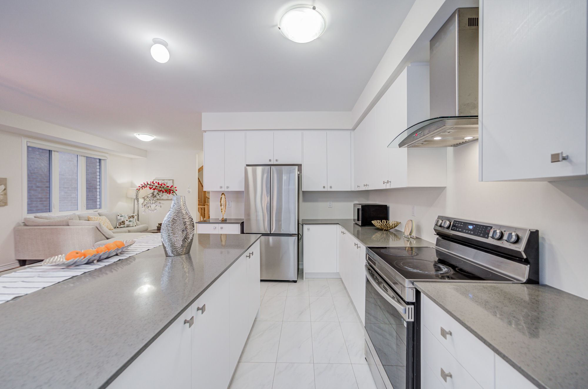 • Open concept kitchen with a large quartz countertop for ample workspace.