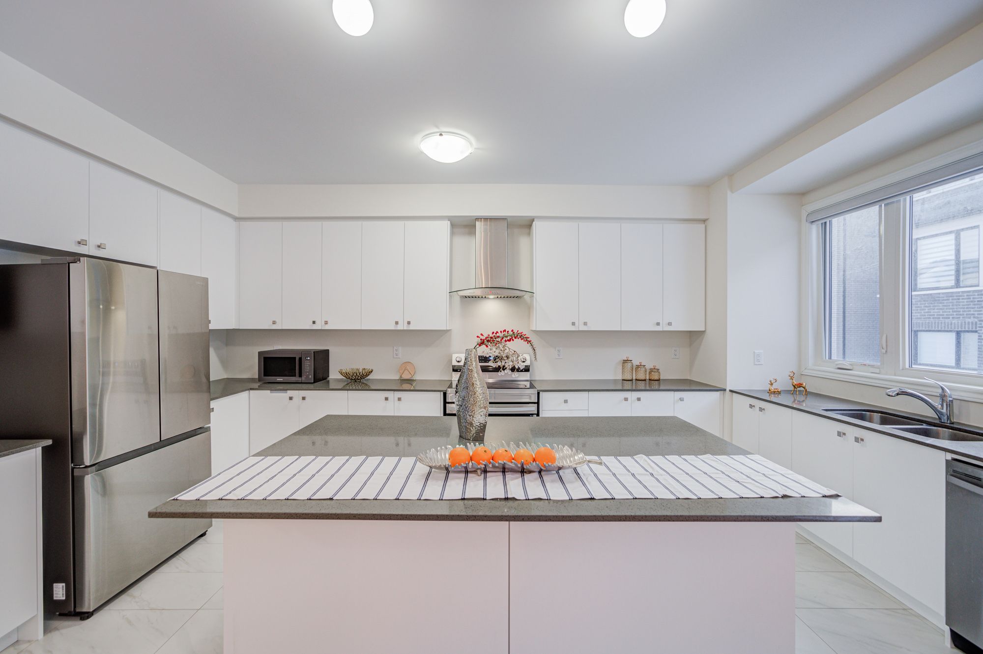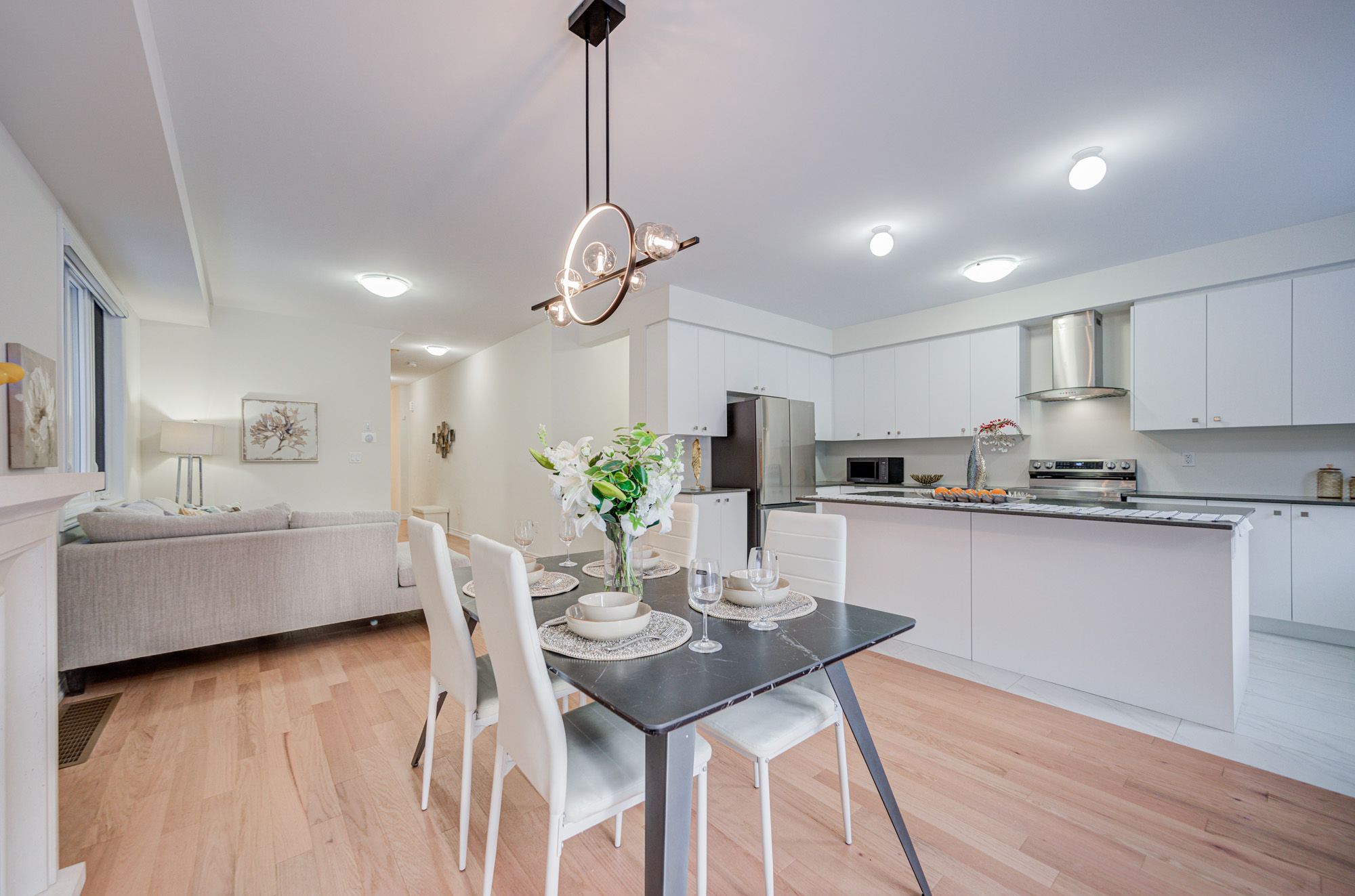 • Open concept kitchen with quartz counters and stainless steel appliances.