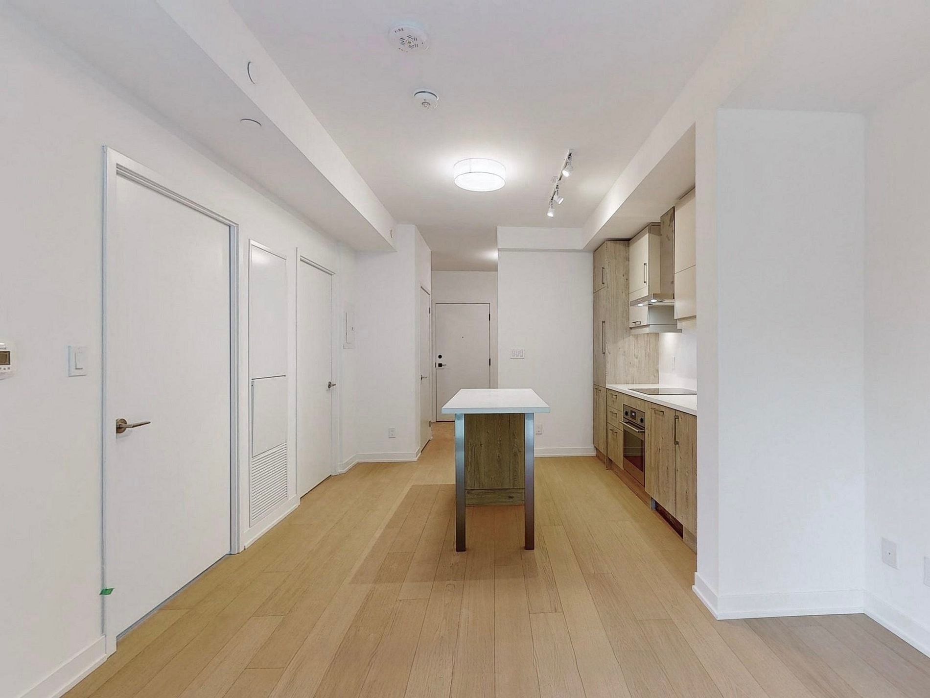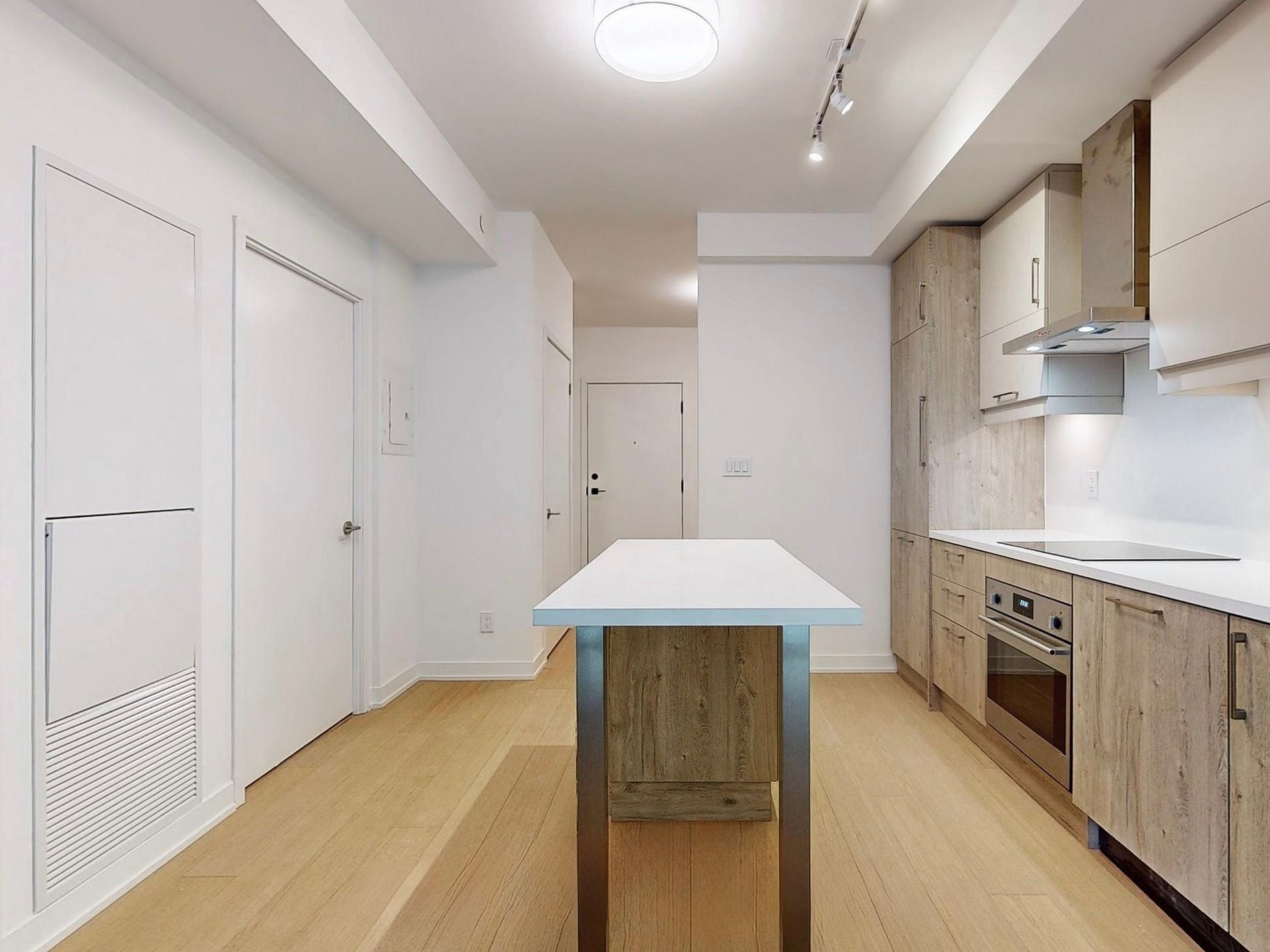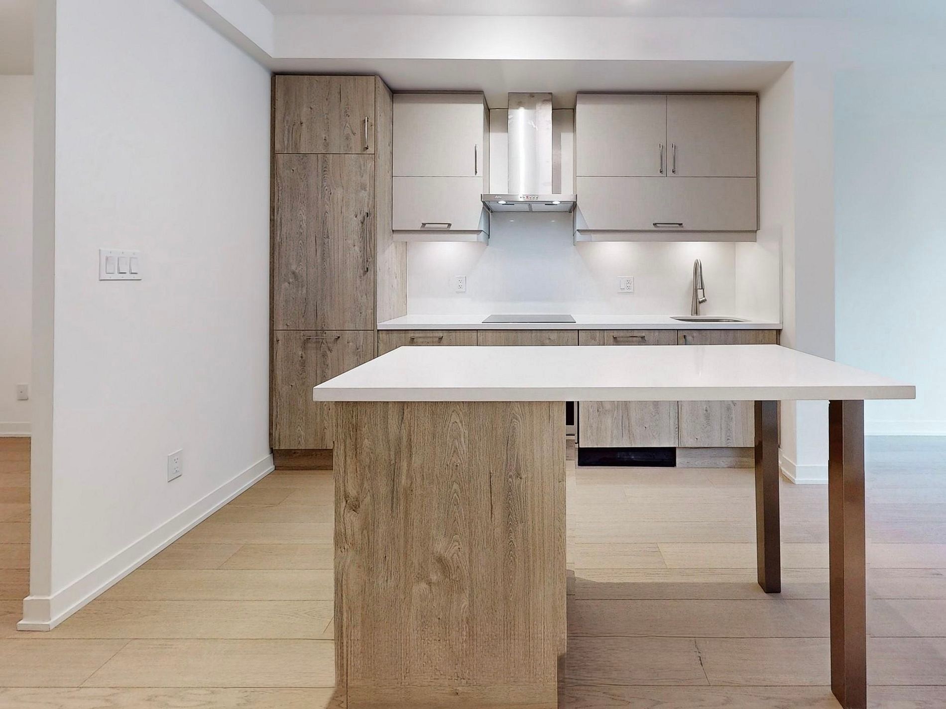 • Open-concept layout with integrated appliances and quartz countertops.