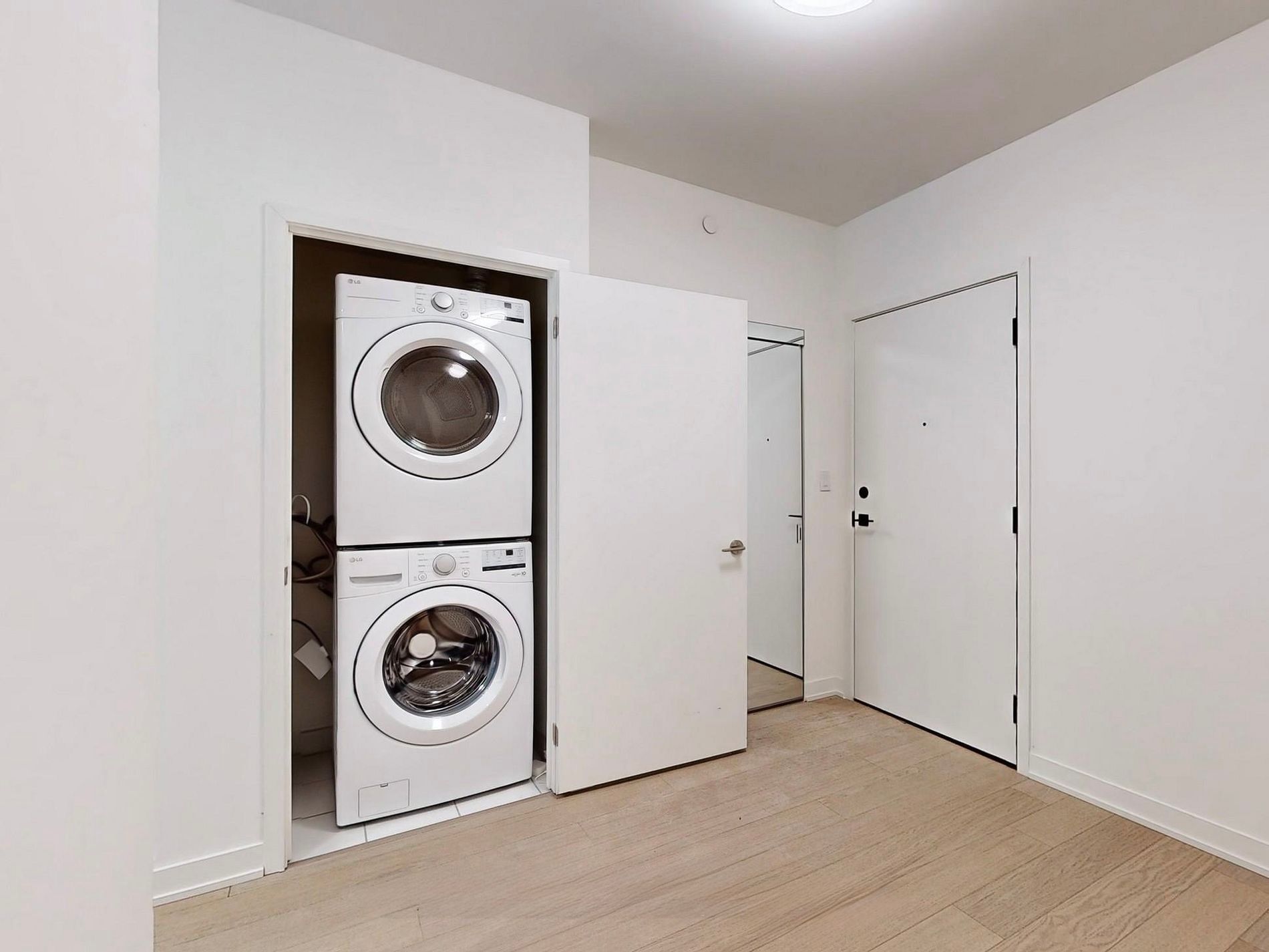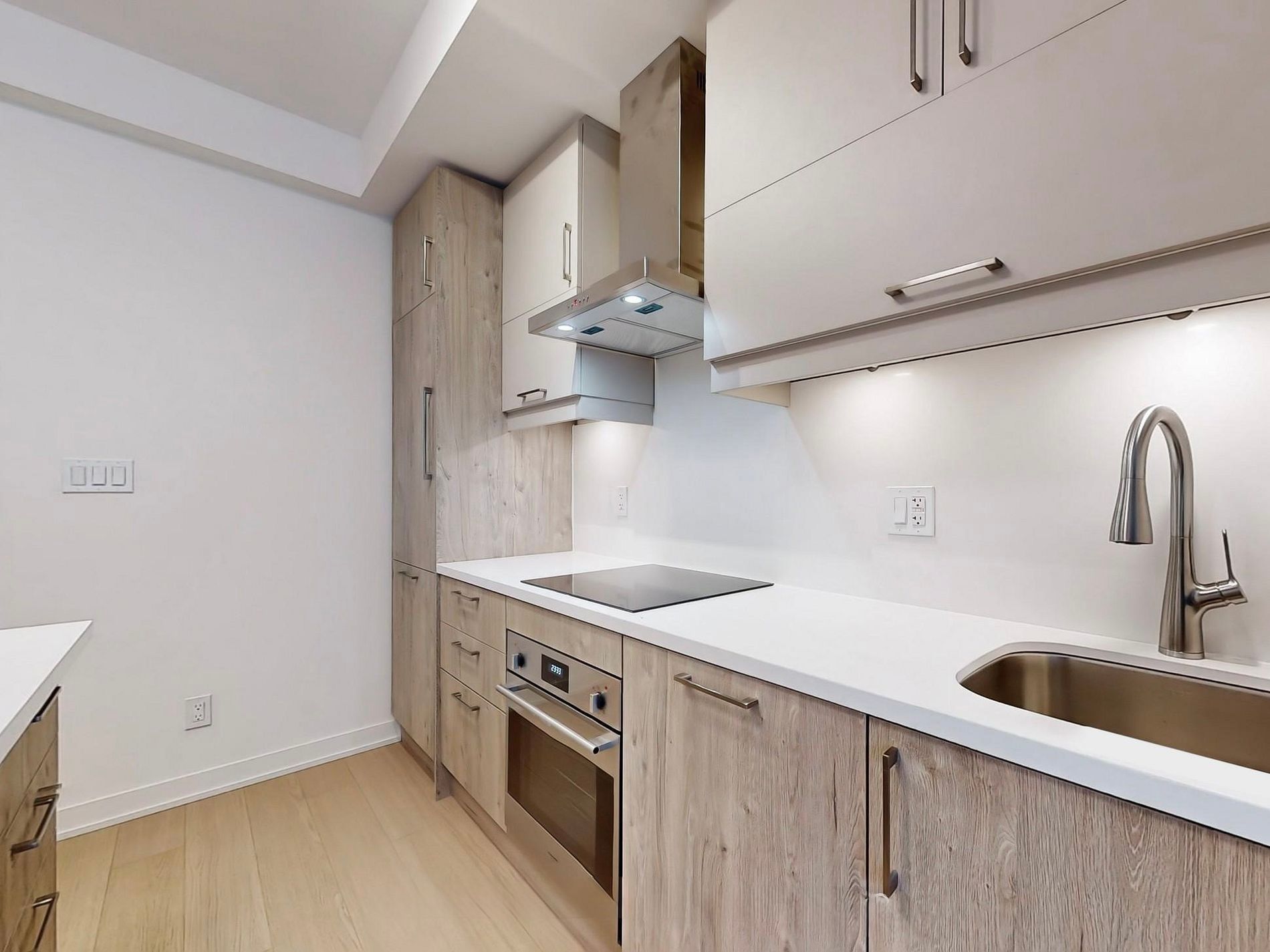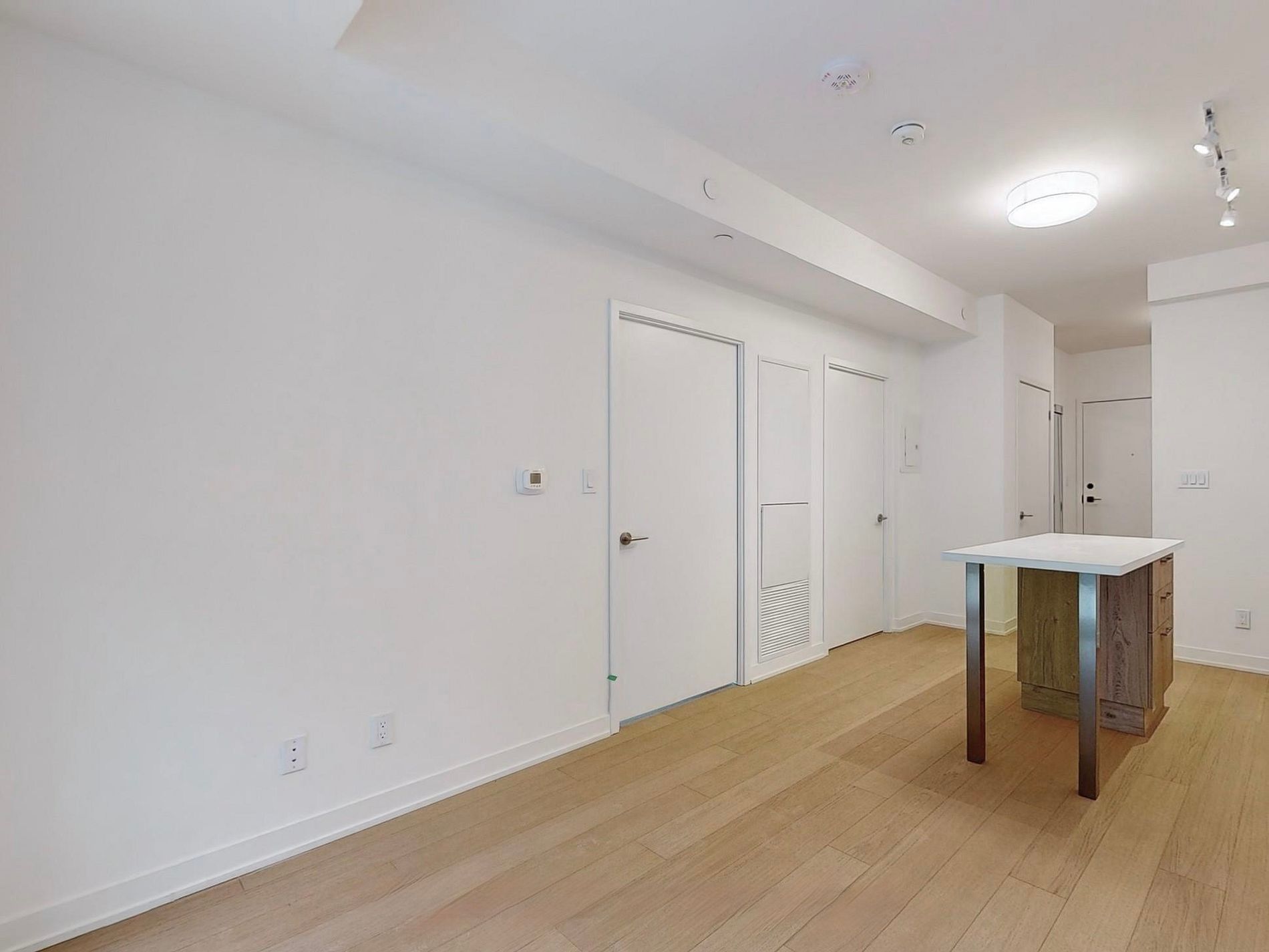 • Open-concept layout with integrated appliances and quartz countertops.
