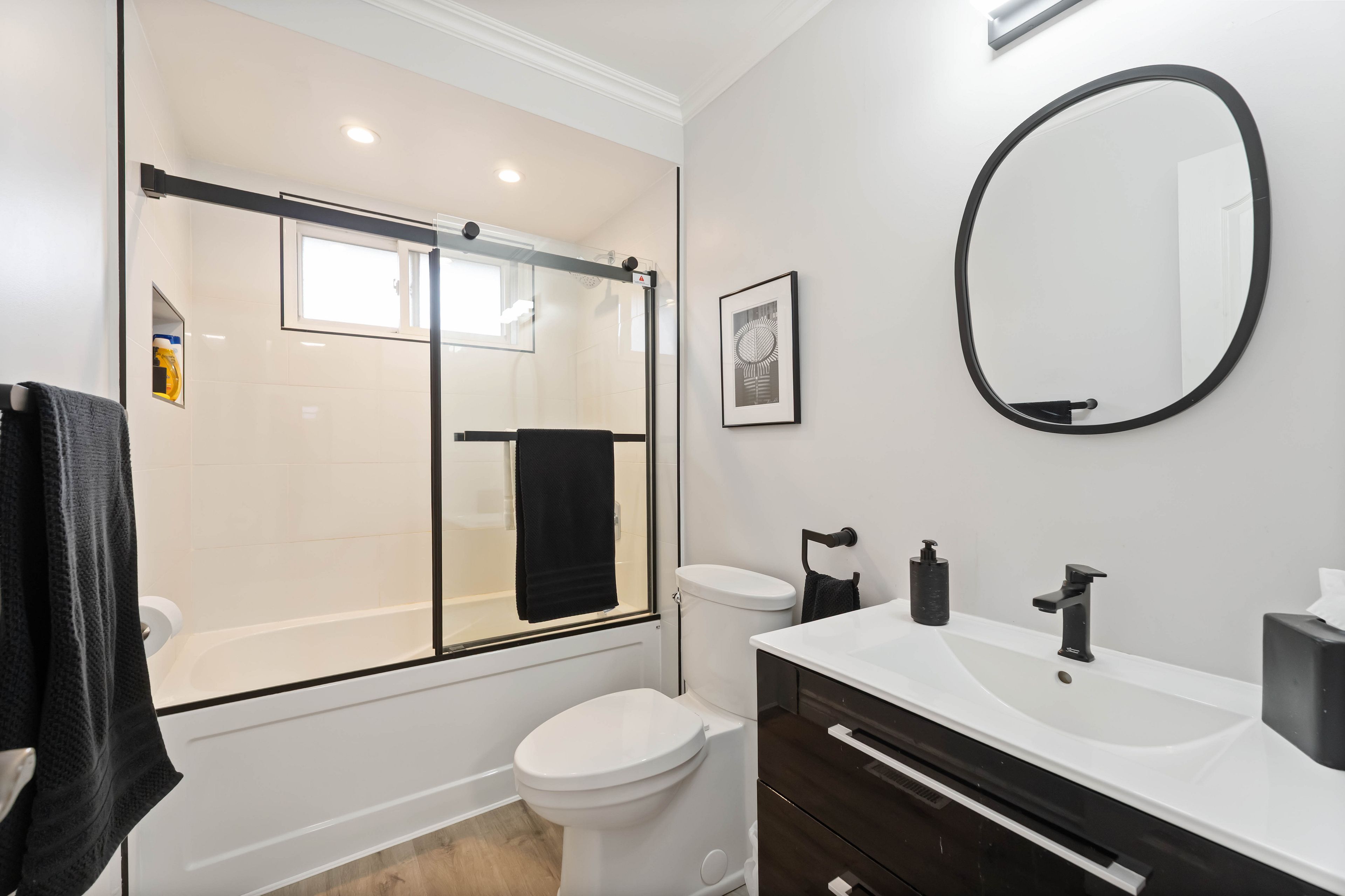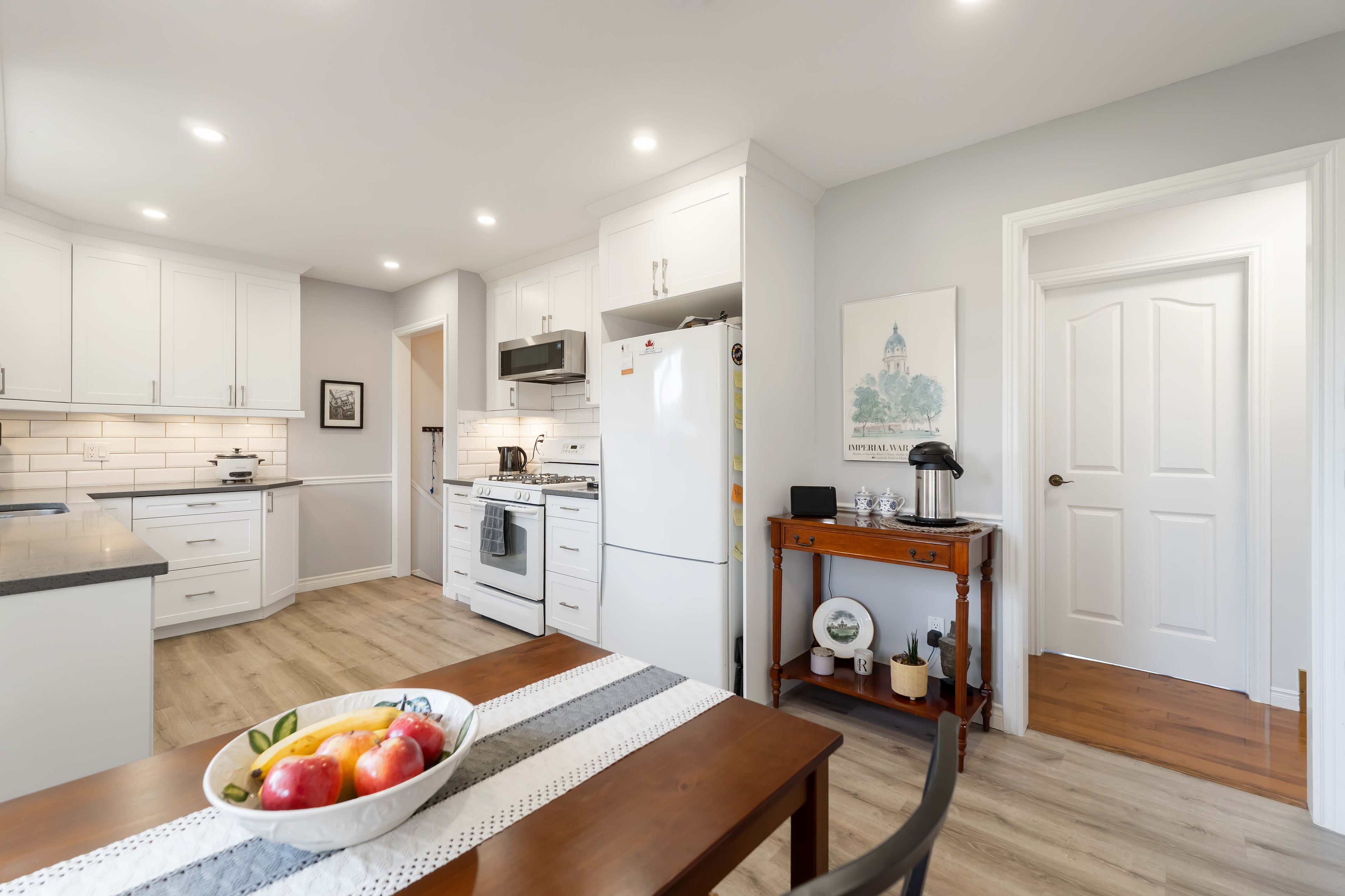 • Modern eat-in kitchen and renovated bathrooms add contemporary touches.