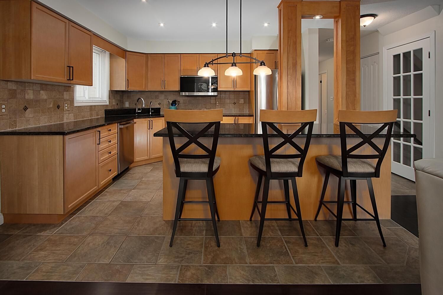 Beautifully renovated family home with bright dining room addition on a quiet crescent! Welcome to this move-in-ready, updated single detached home with a large garage, located on a quiet crescent in one of kitchener's most sought-after family neighbourhoods. Just a short walk to excellent schools, parks, playgrounds, and trails, this home is perfect for growing families. The open concept main floor features a renovated maple kitchen with granite counters, stone backsplash, breakfast bar, and wine bar fridge. A stunning, professionally built dining room addition showcases high ceilings and large windows that fill the space with natural light, which is ideal for family meals and entertaining. The spacious living room features engineered hardwood flooring and flows to a fully fenced backyard with a pressure-treated deck and shed. A convenient 2-piece powder room completes the main level. Upstairs are three generous bedrooms with engineered hardwood flooring, an updated 4-piece bath with granite counters, and a built-in linen closet. The primary bedroom offers cathedral ceilings, california shutters, and a private 3-piece ensuite with quartz counters and glass shower. The finished basement includes a cozy rec room with a gas fireplace and stone mantel, a 2-piece bath, office or den, laundry room with cabinetry, utility room, and a fruit cellar. The spacious attached garage includes lots of bonus overhead storage. Located minutes from the boardwalk, costco, medical centres, movie theatres, transit, and expressway access -- this home has it all.