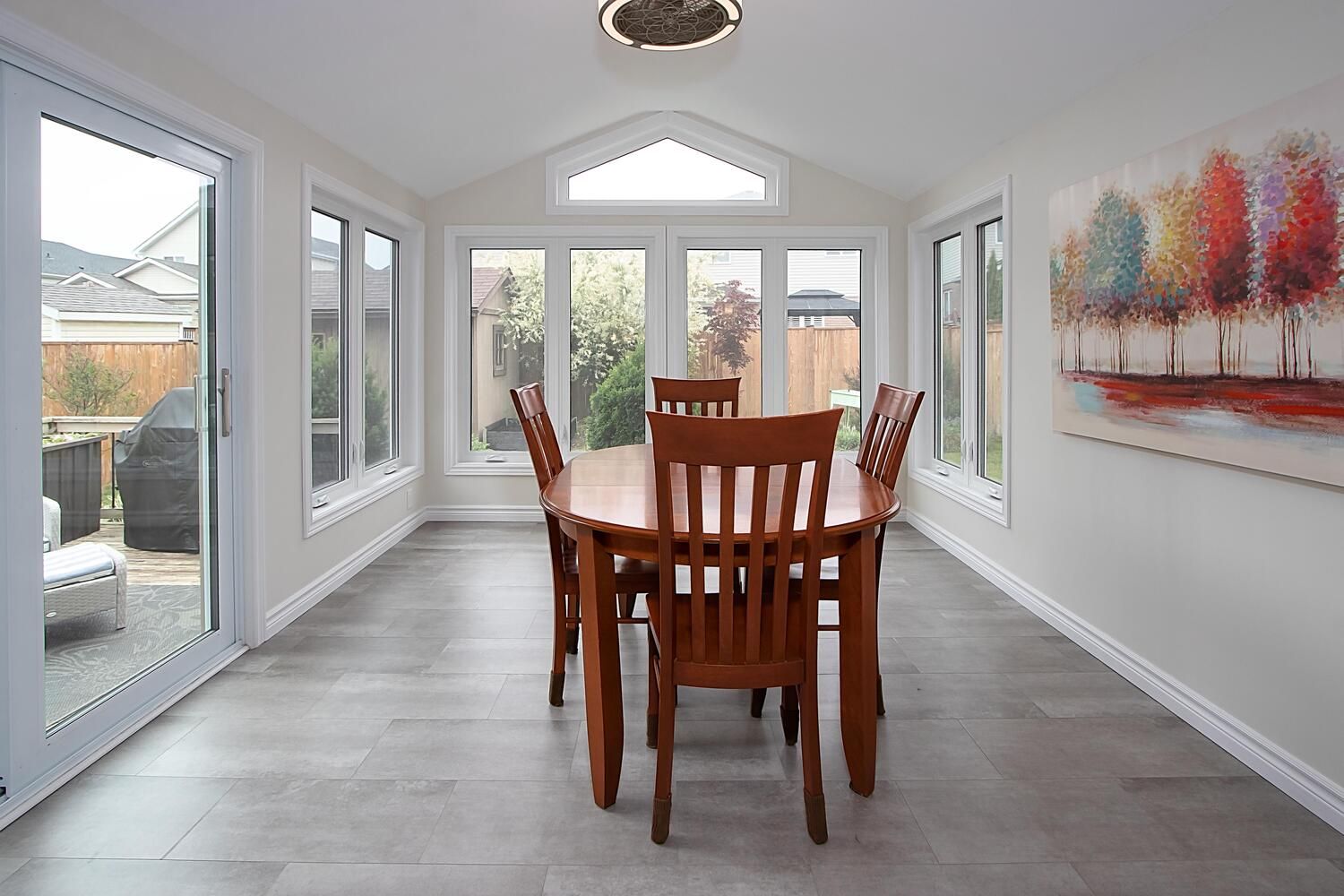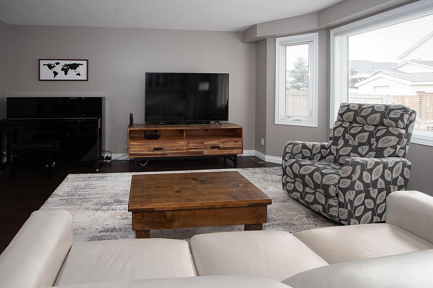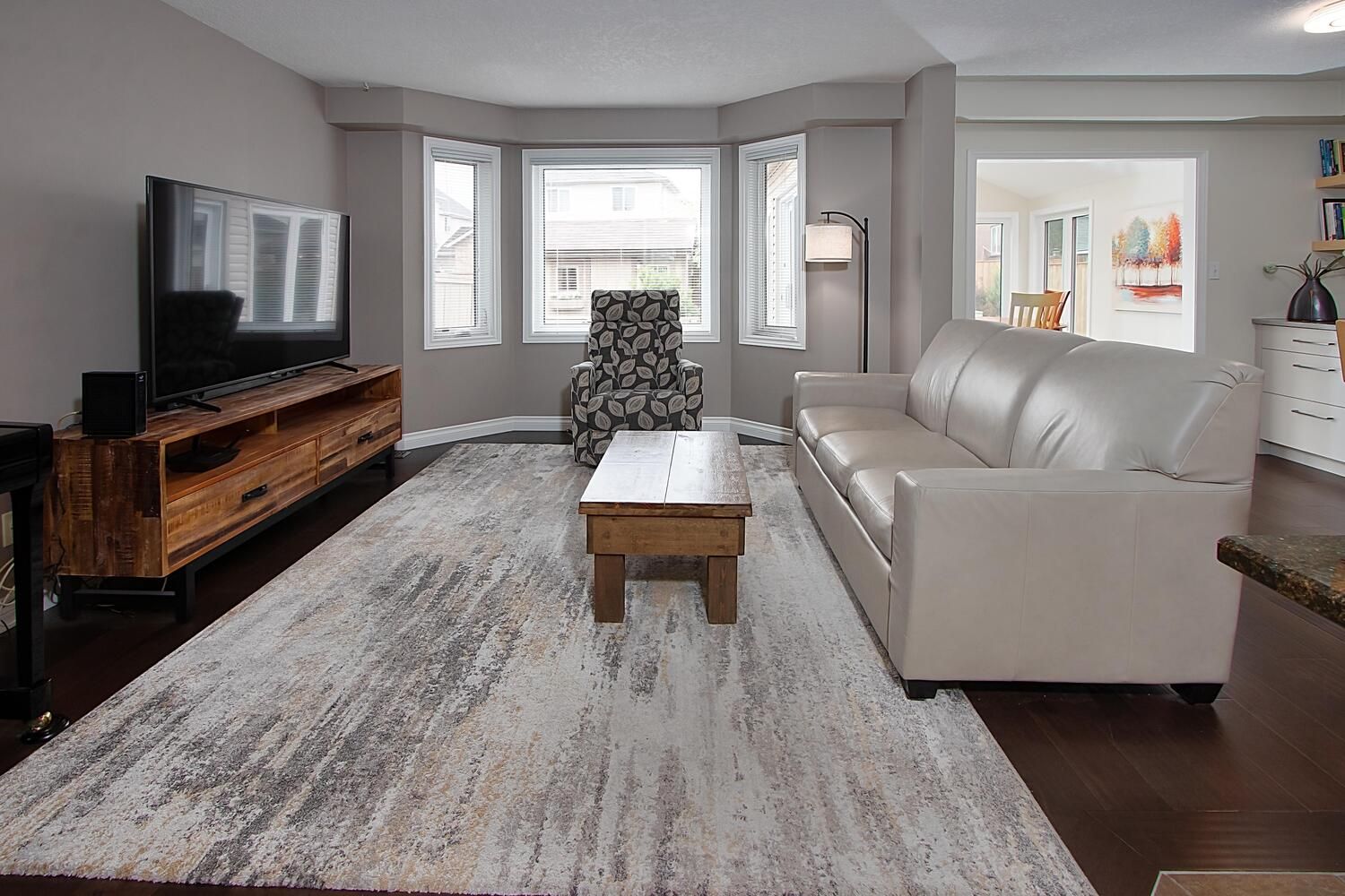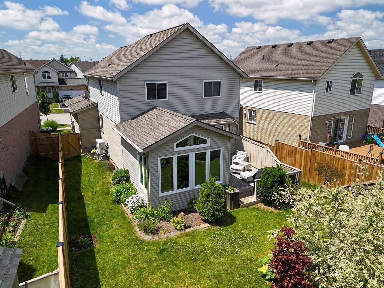• Spacious living room leading to a fully fenced backyard with a deck.