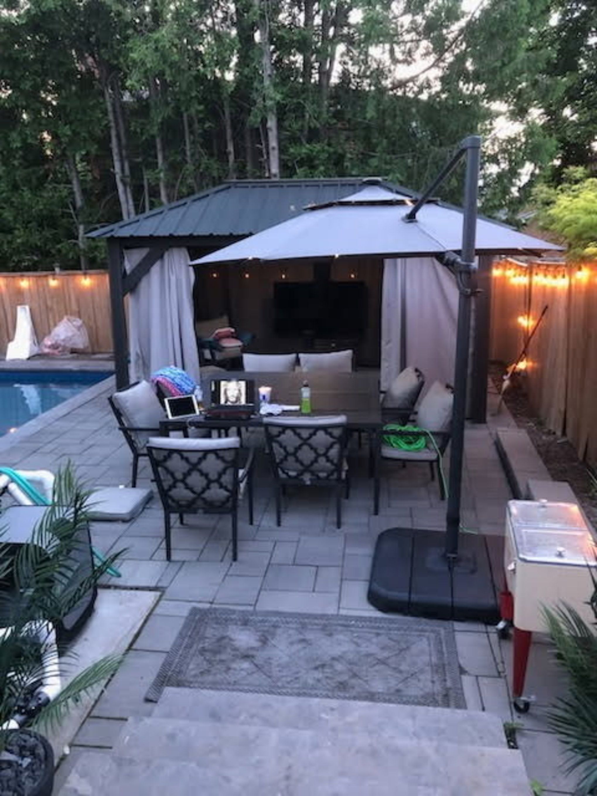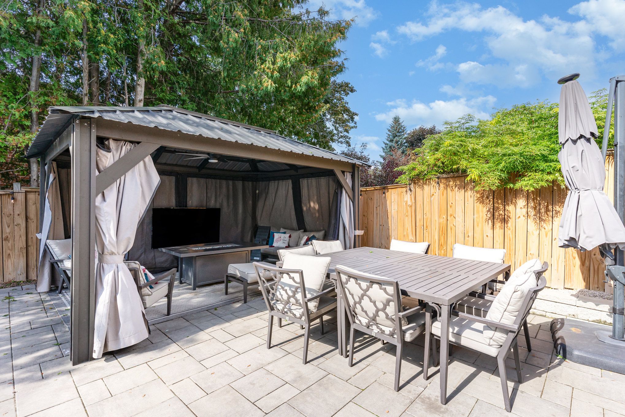 • Year-round gazebo with ceiling fan for relaxation outdoors.