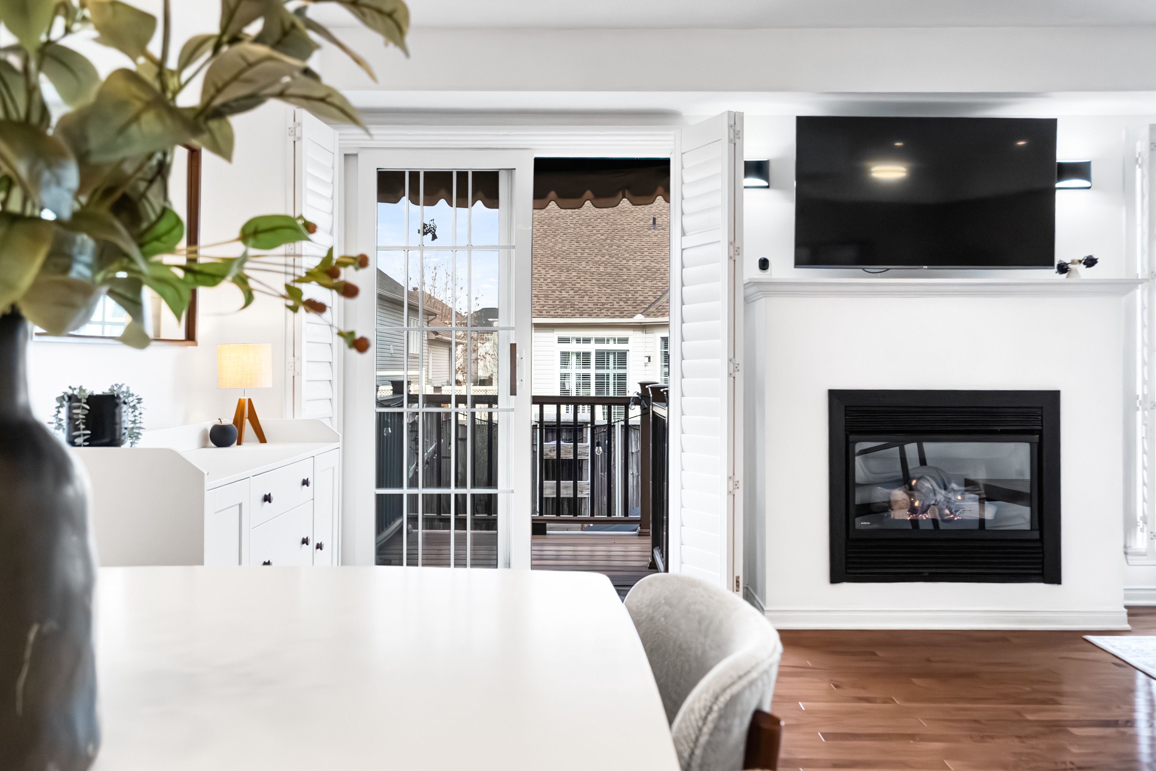 • Spacious main level living room with natural light and a cozy gas fireplace.
