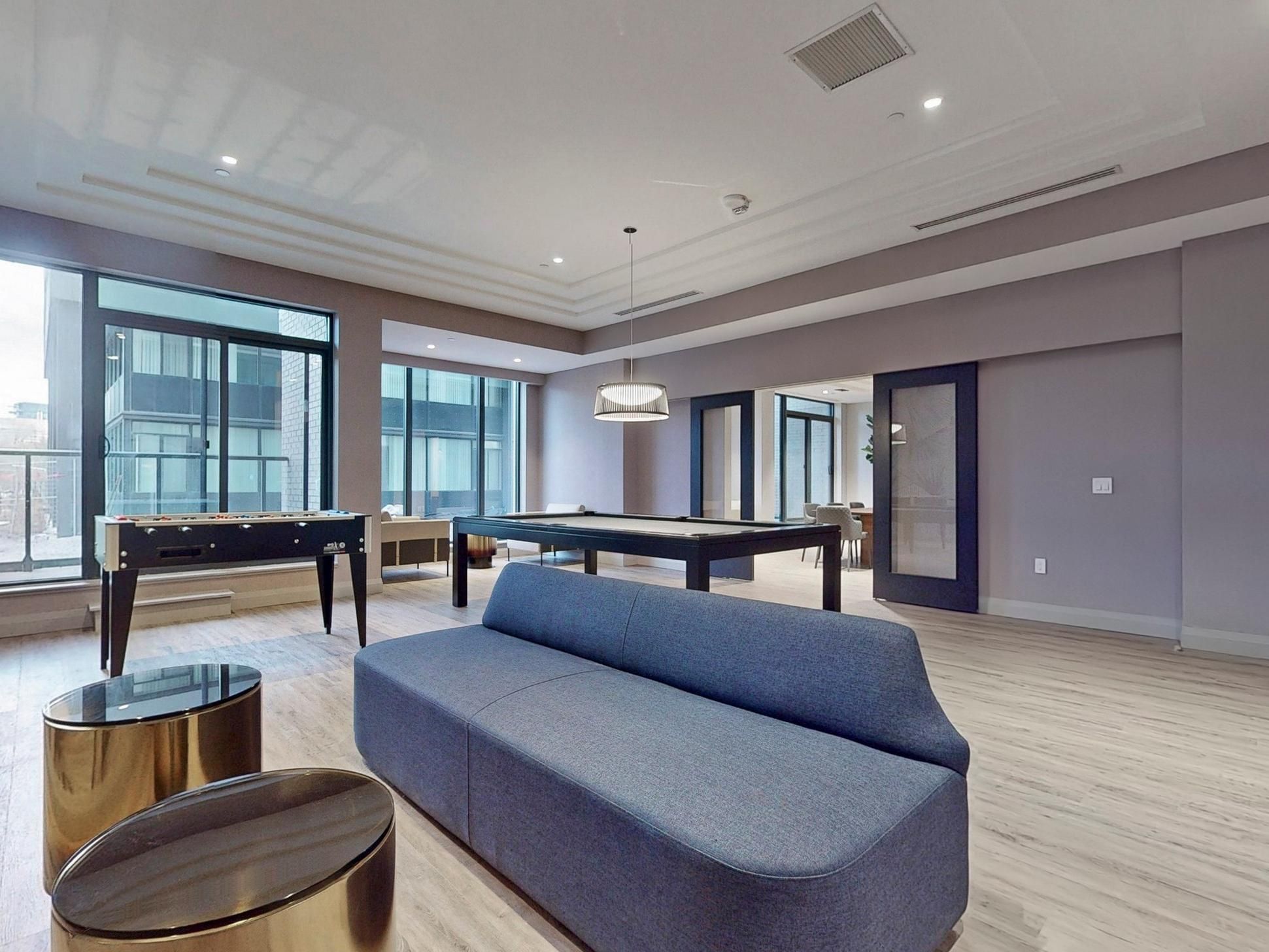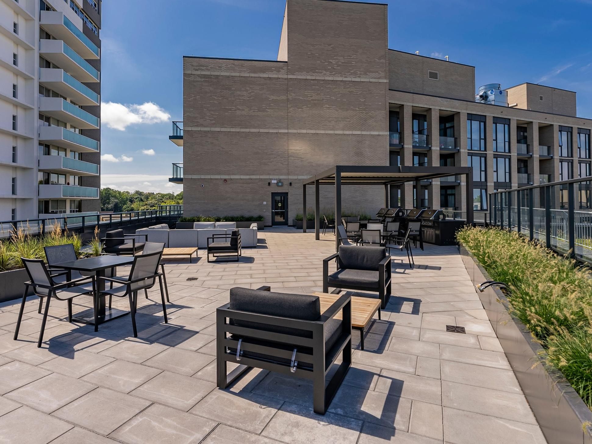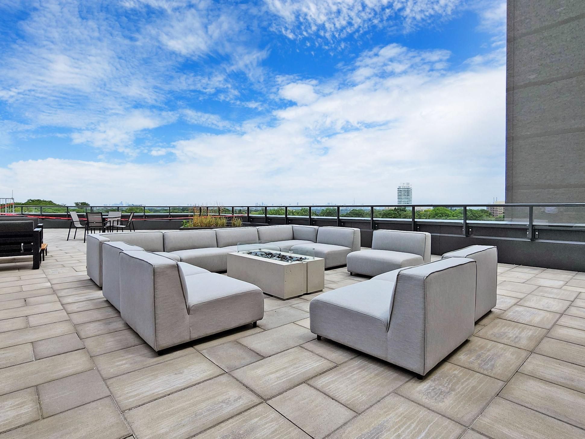 • Building amenities include a rooftop deck, fitness center, and pet spa.