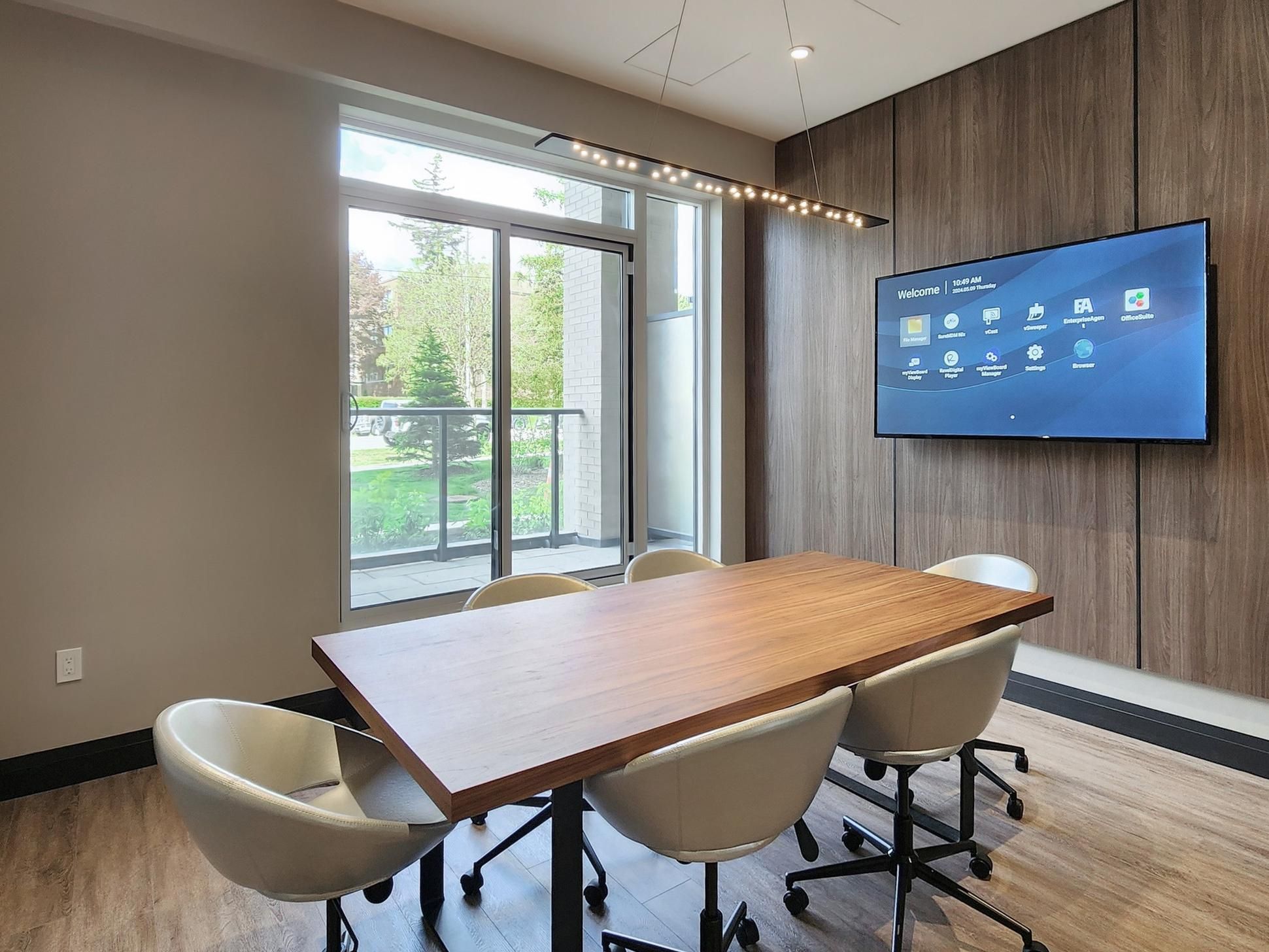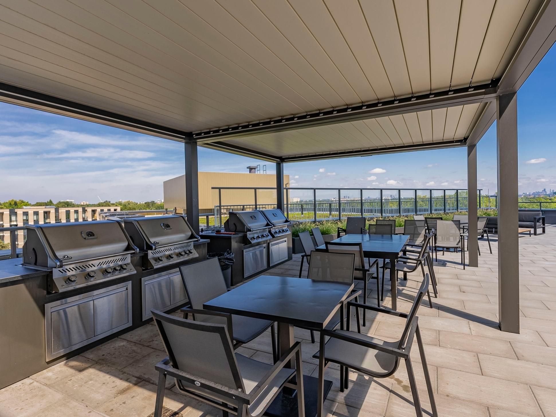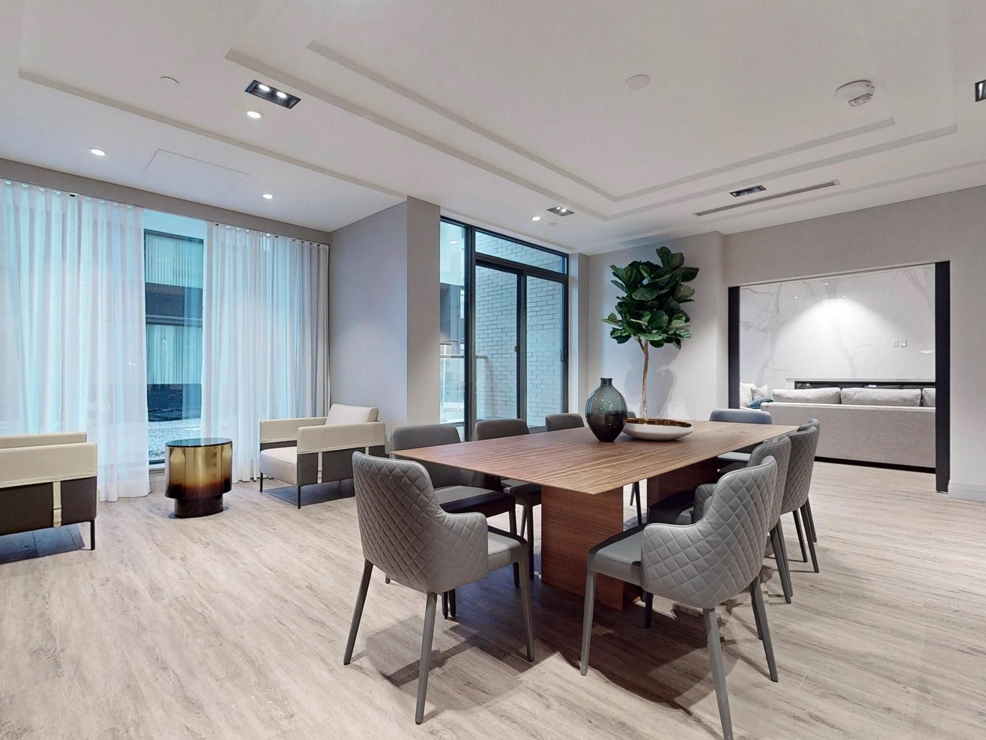 • Building amenities include a rooftop deck, fitness center, and pet spa.