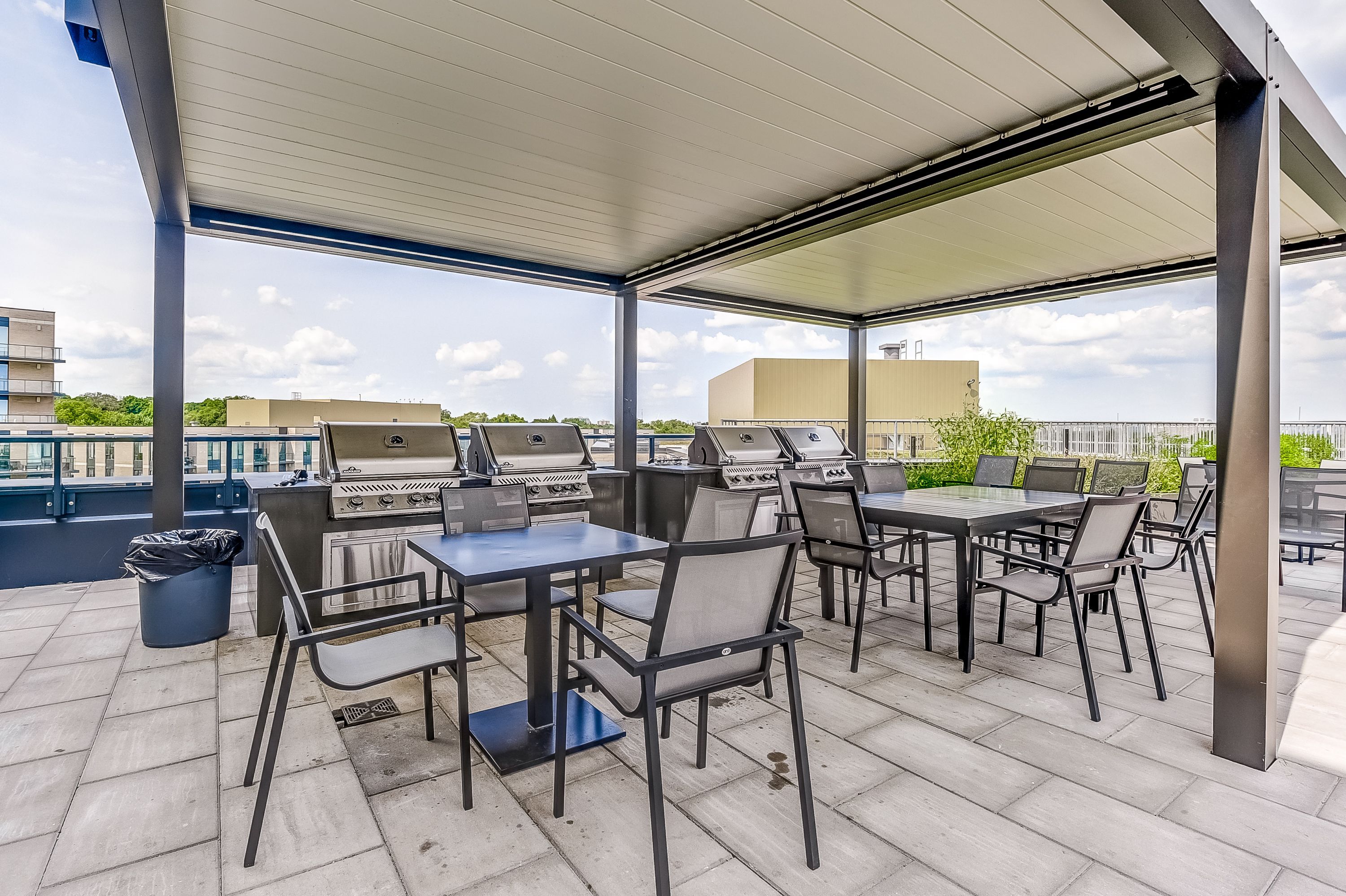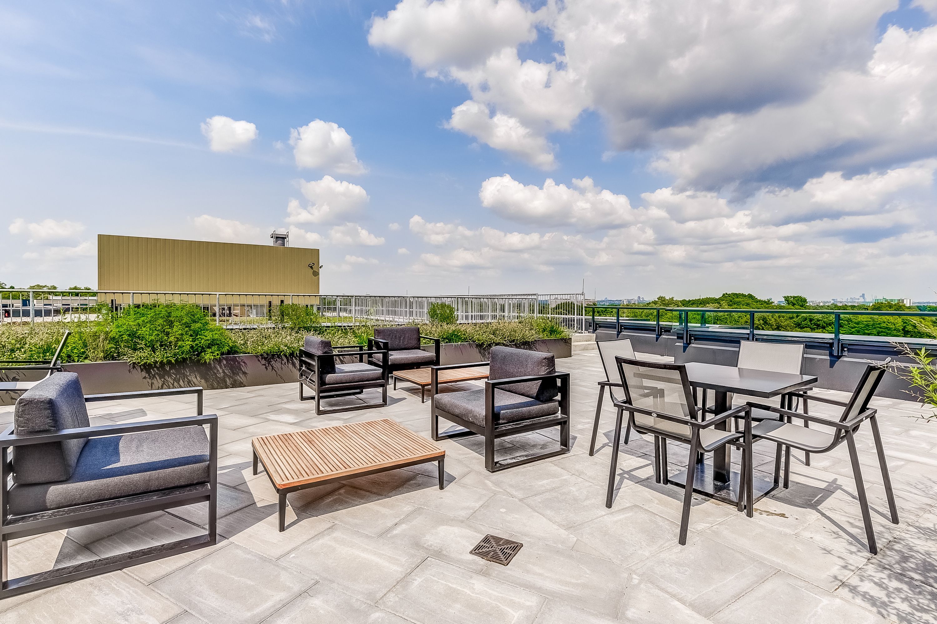 • Expansive rooftop terrace features firepit and lounge-style seating for gatherings.