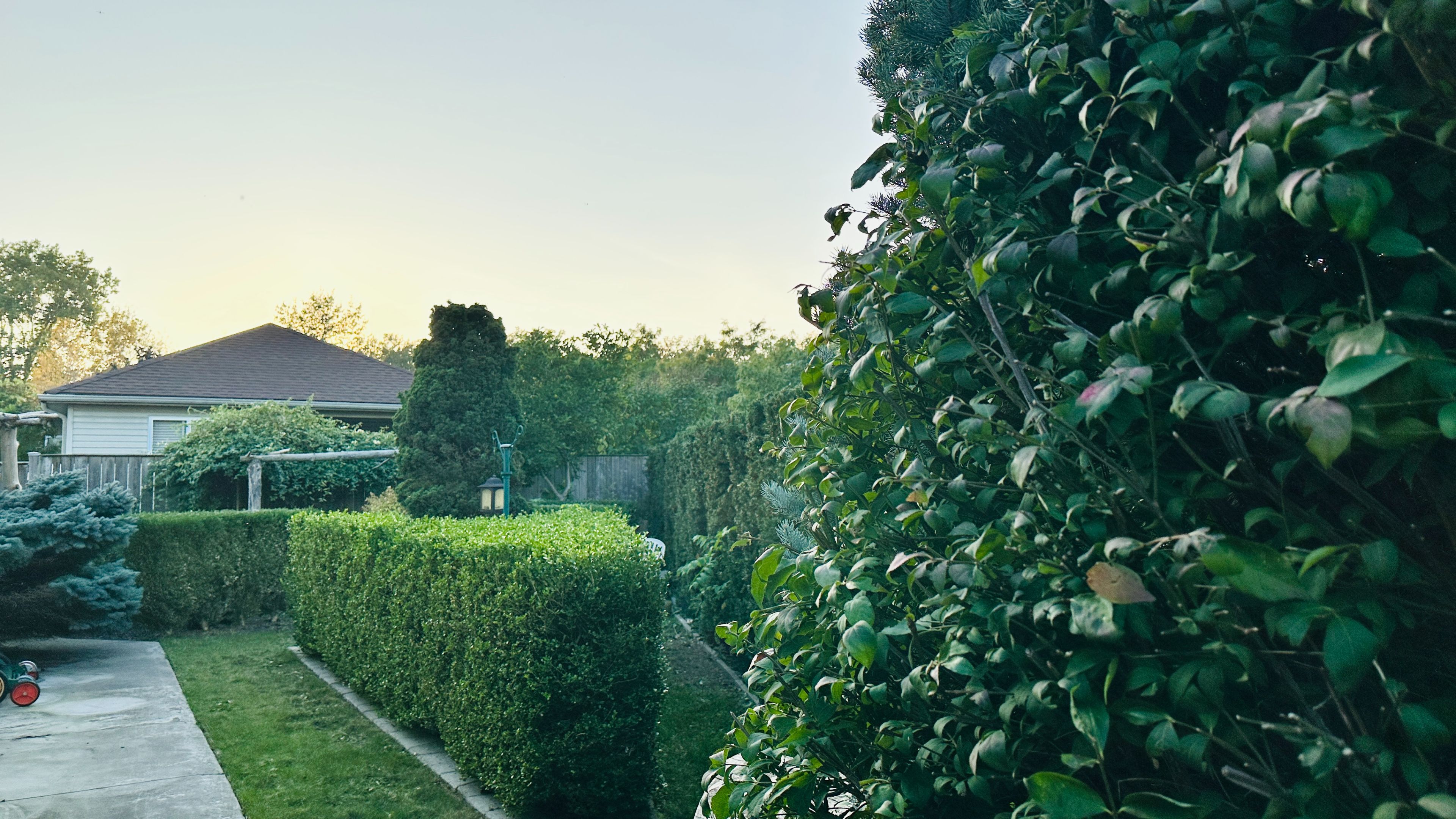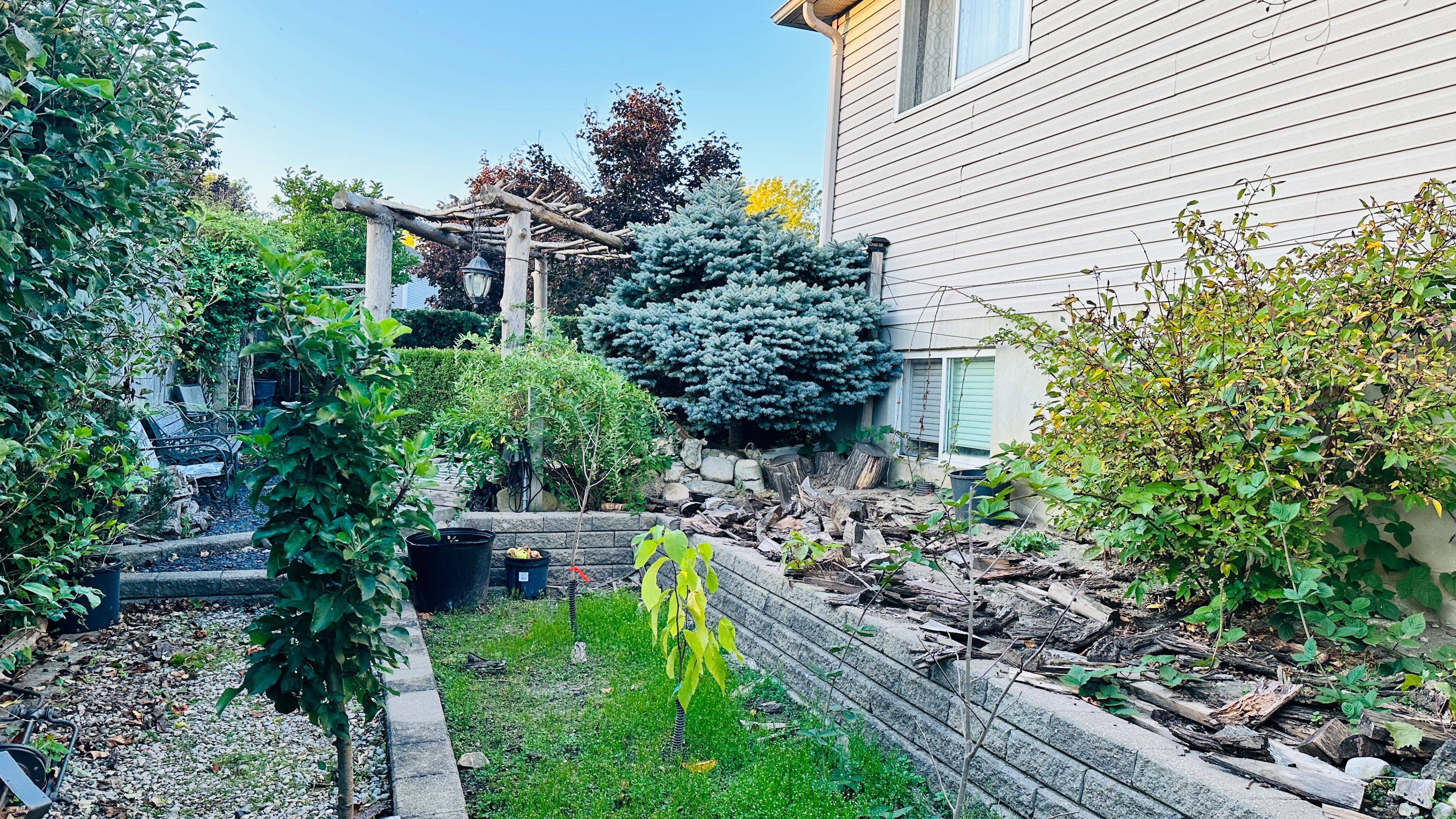 • Landscaped backyard with diverse trees, fire pit, and pond.