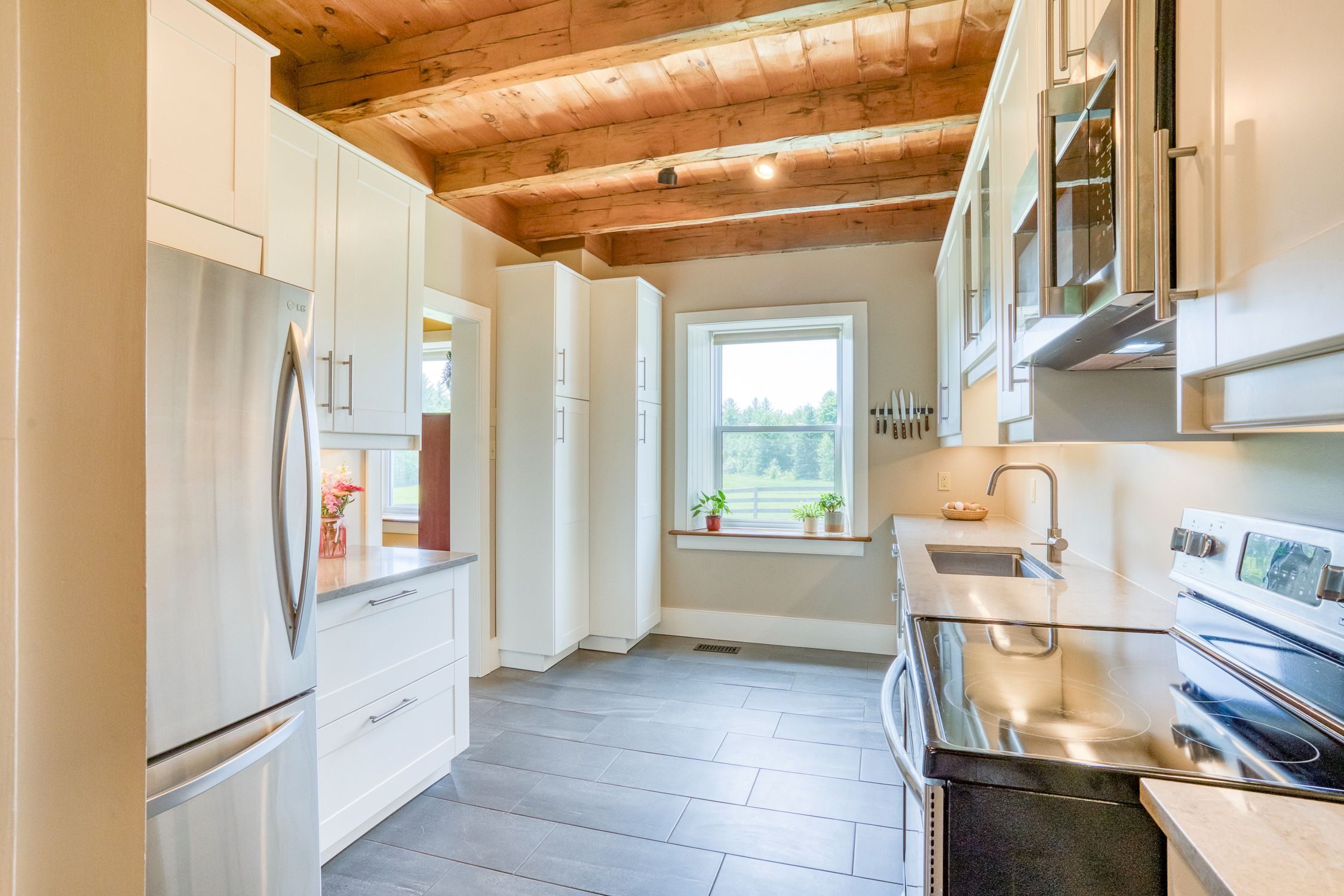 • Spacious kitchen with quartz counters and a sunny backyard view.