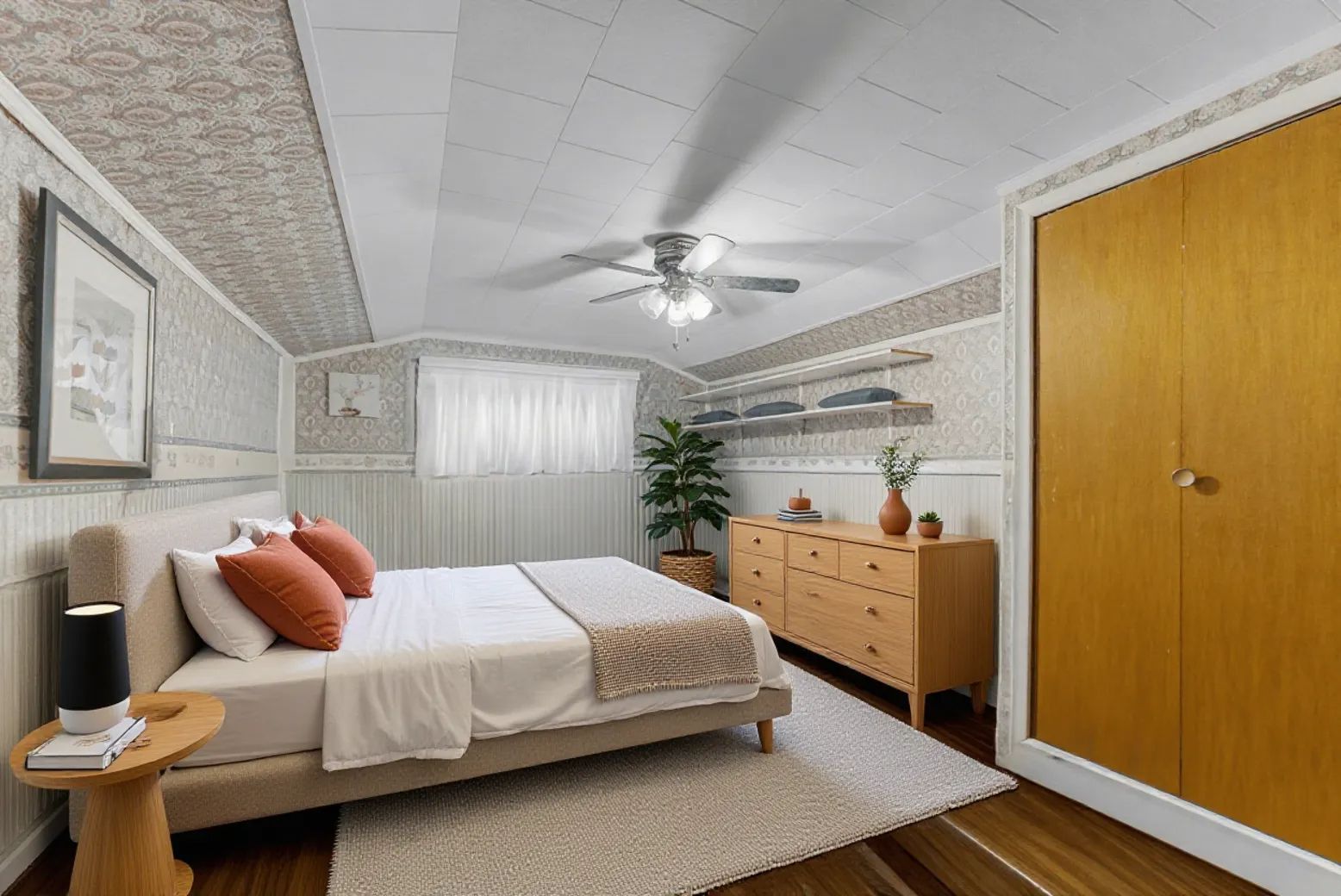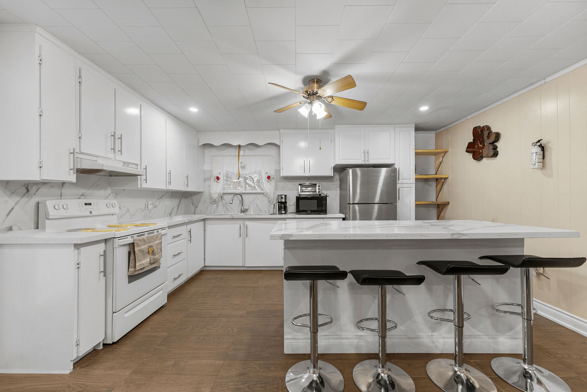 • Renovated kitchen with a carpet-free layout provides a modern, bright space.