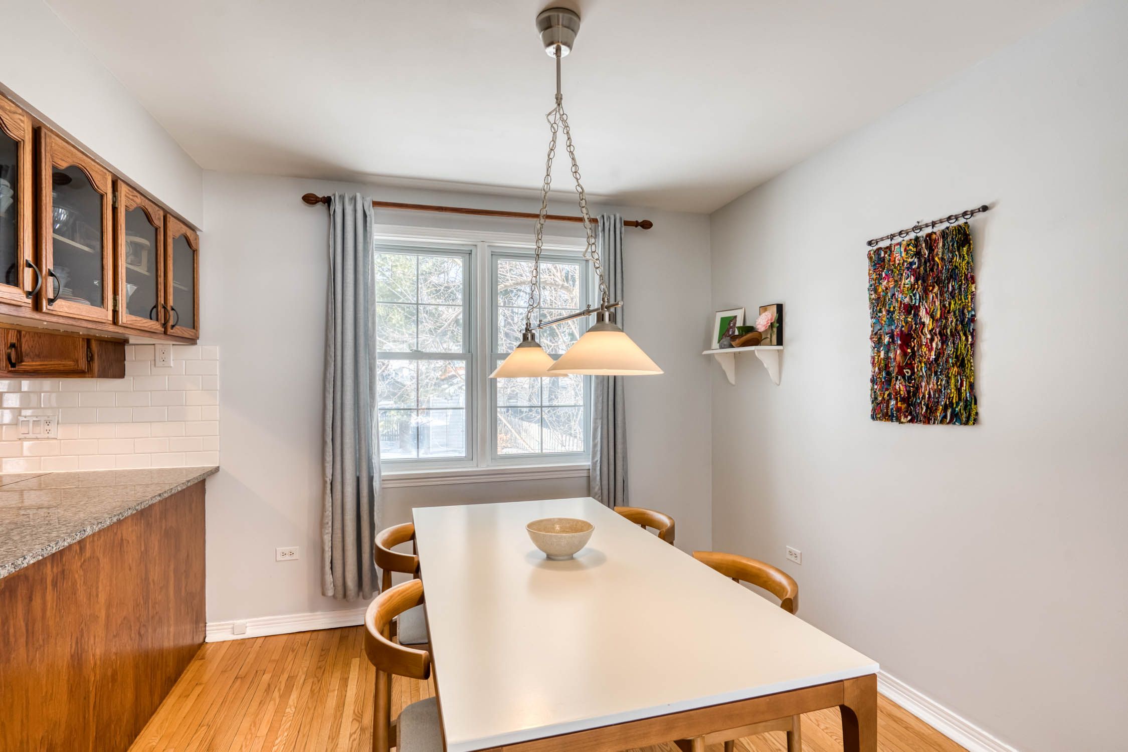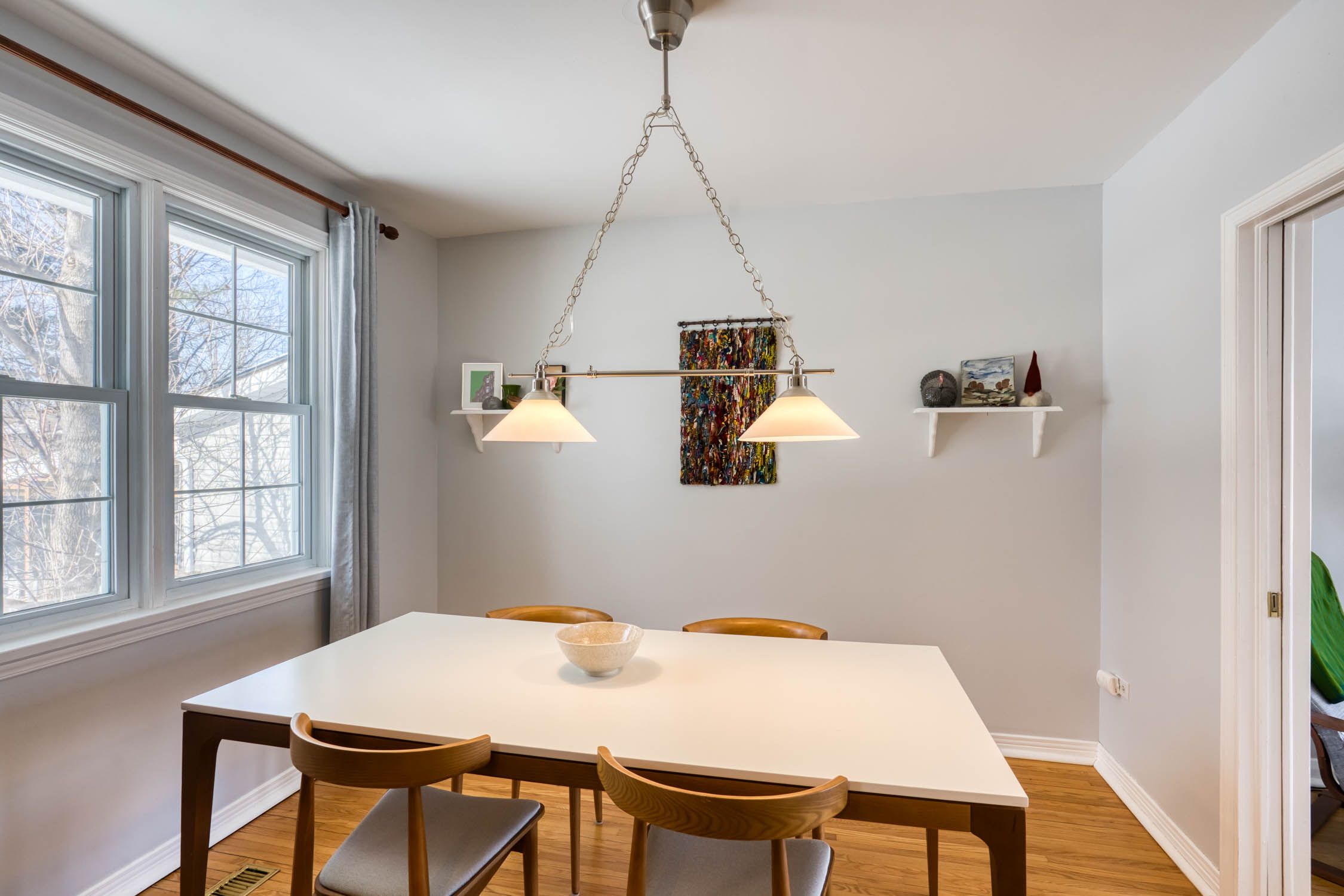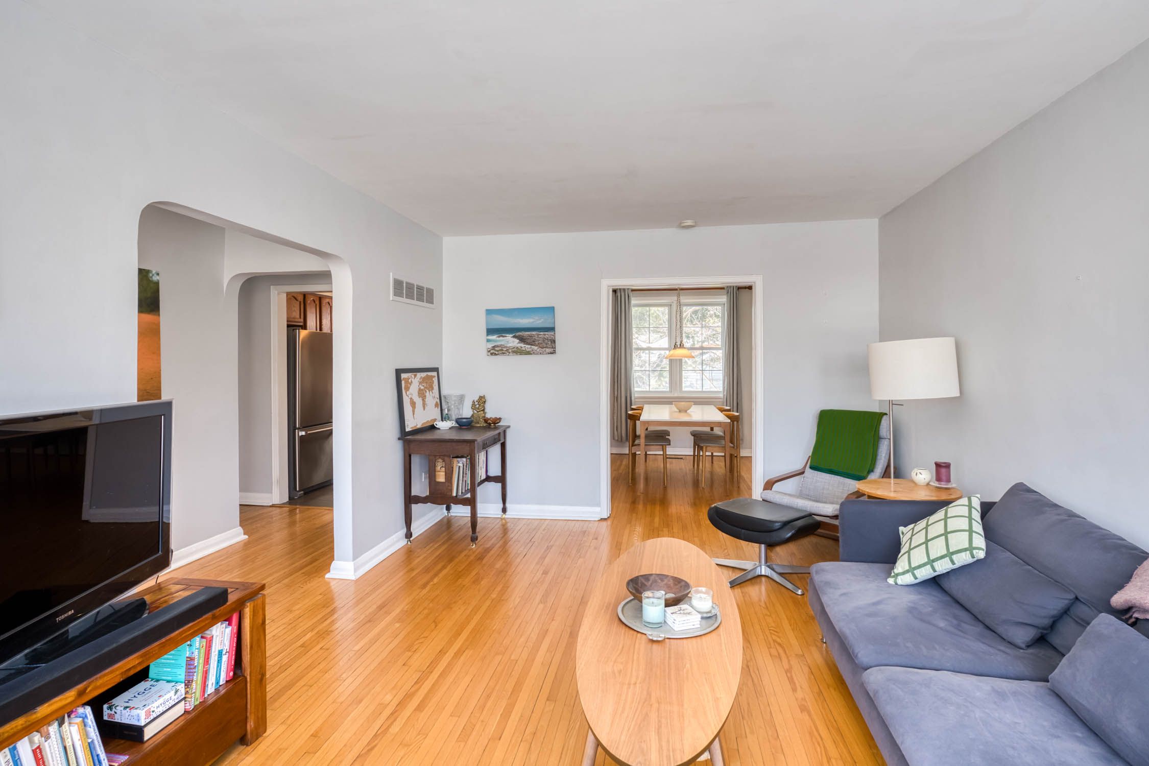• Sun-filled living room and eating area with hardwood floors throughout.