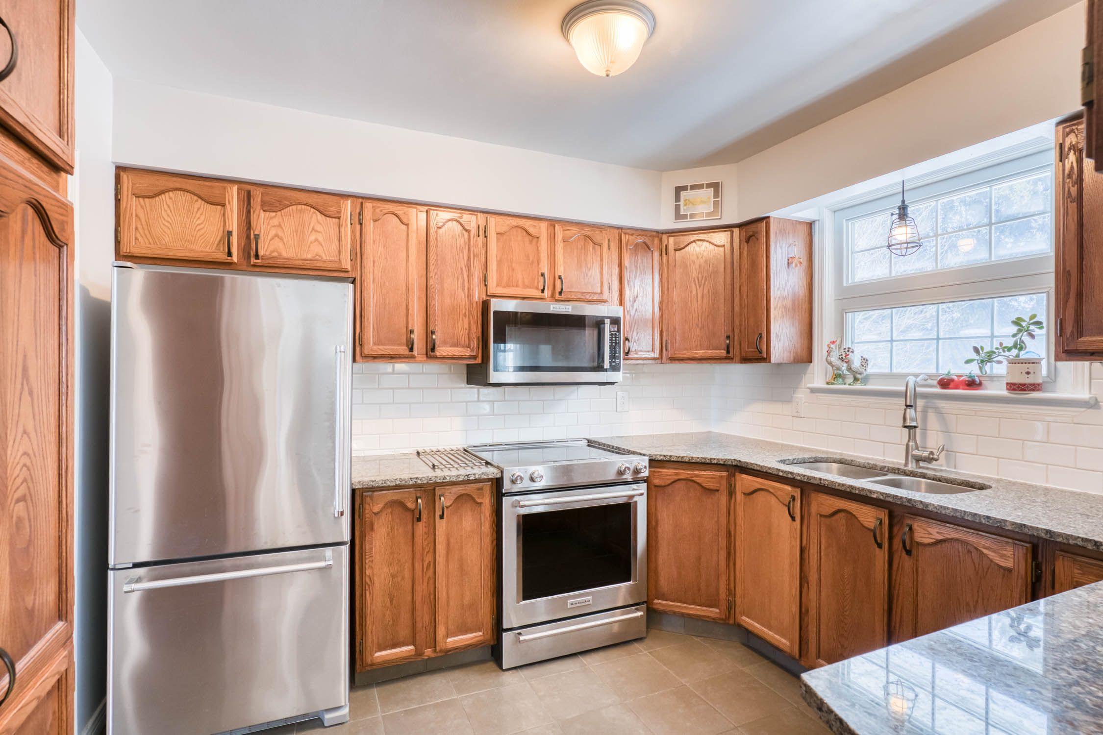 • Spacious kitchen with oak cupboards, quartz counters, and stainless steel appliances.