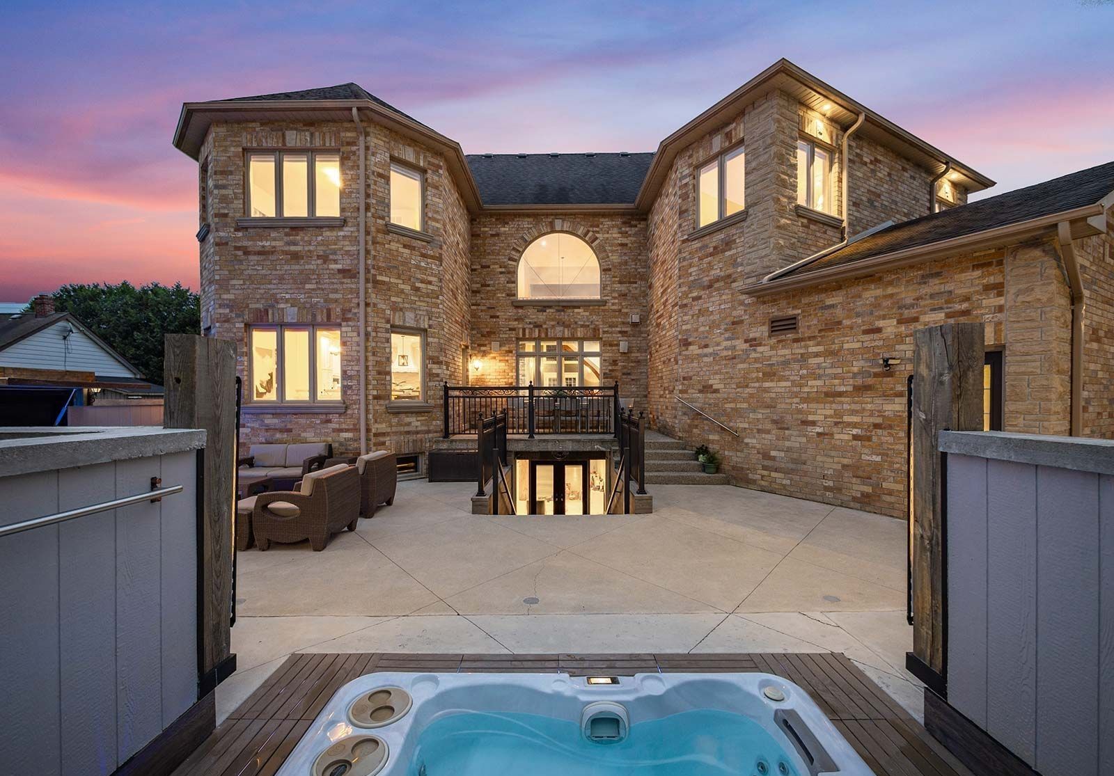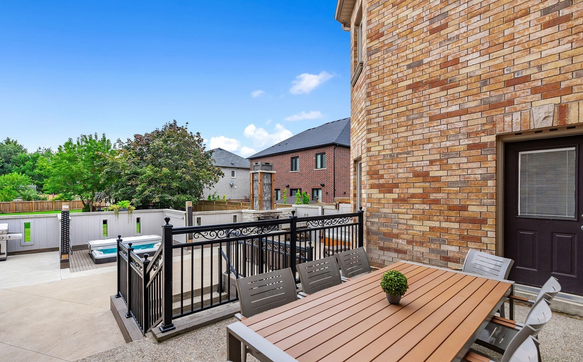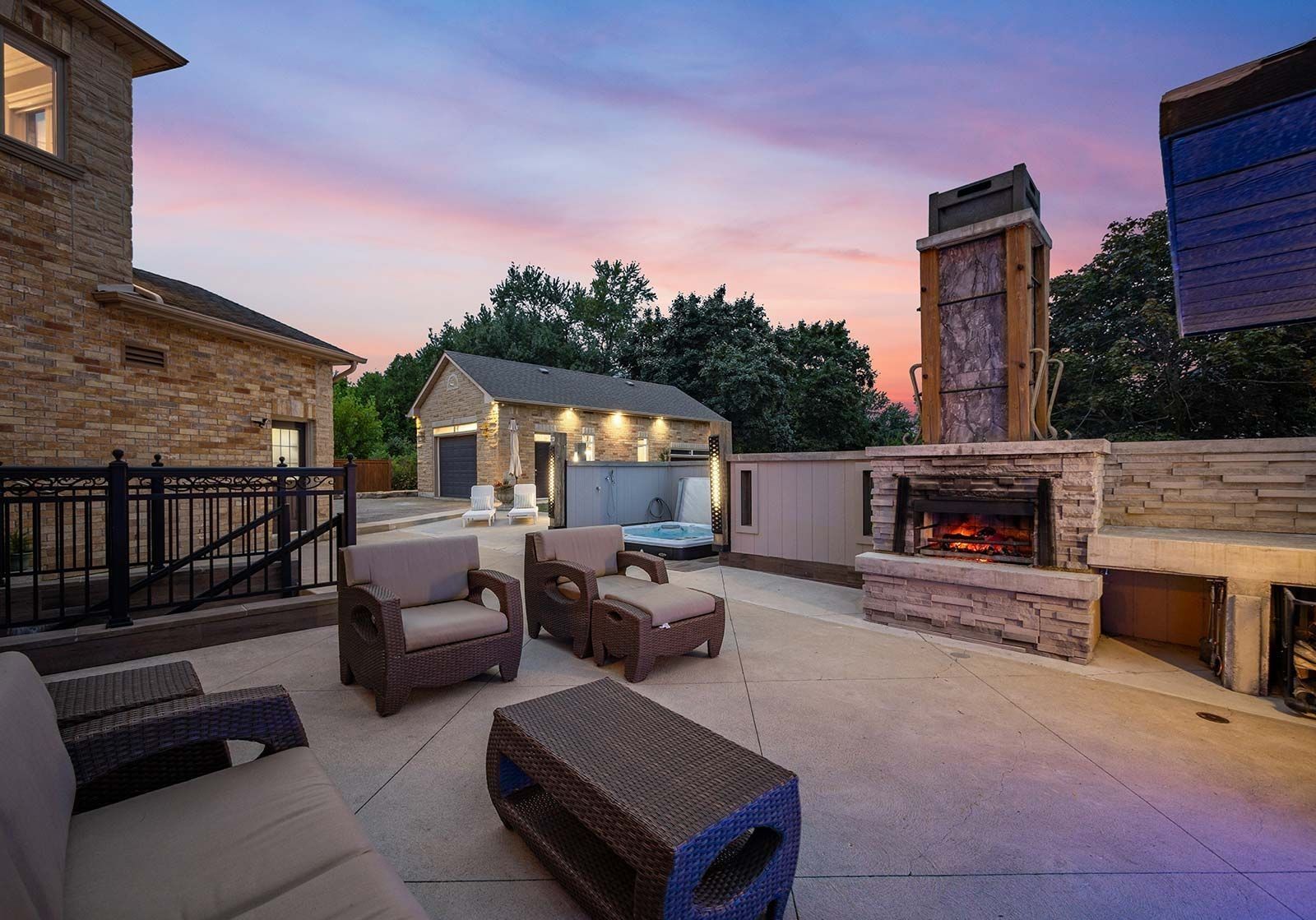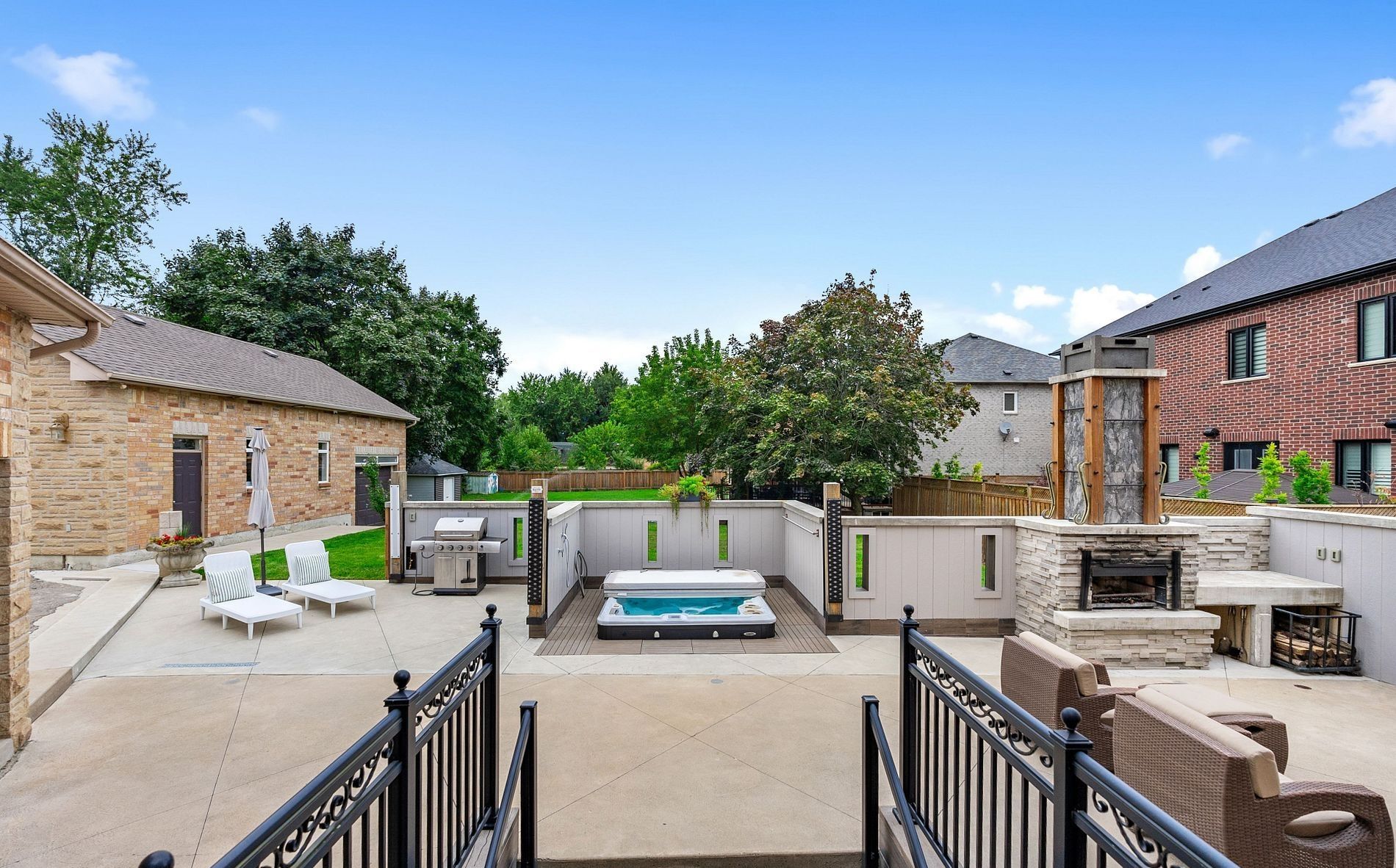 • Private backyard oasis featuring a stone fireplace and hot tub for relaxation.