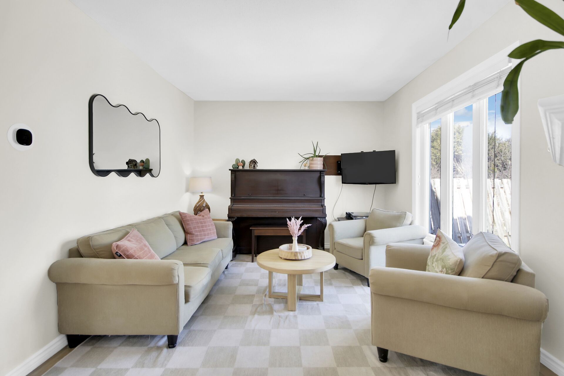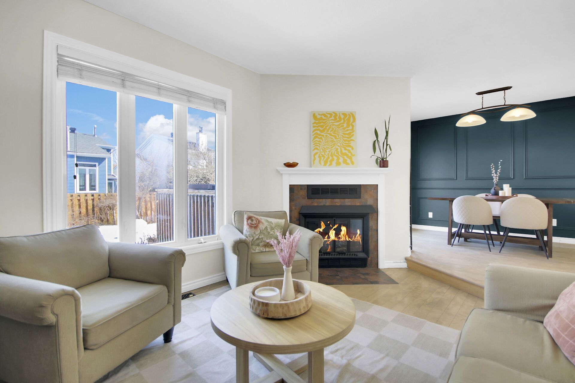 • Sunken living room with a cozy wood-burning fireplace for relaxation.