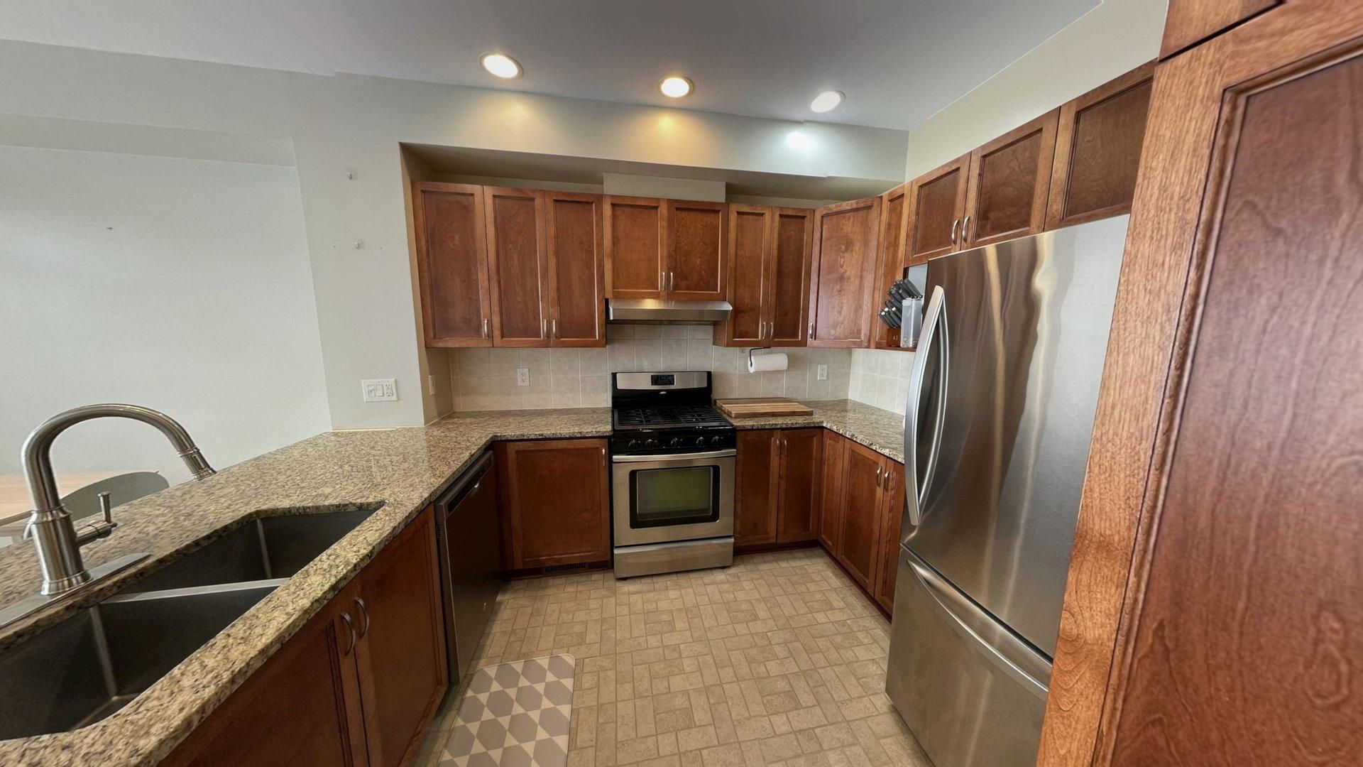 • Open kitchen layout with granite counters and stainless steel appliances.
