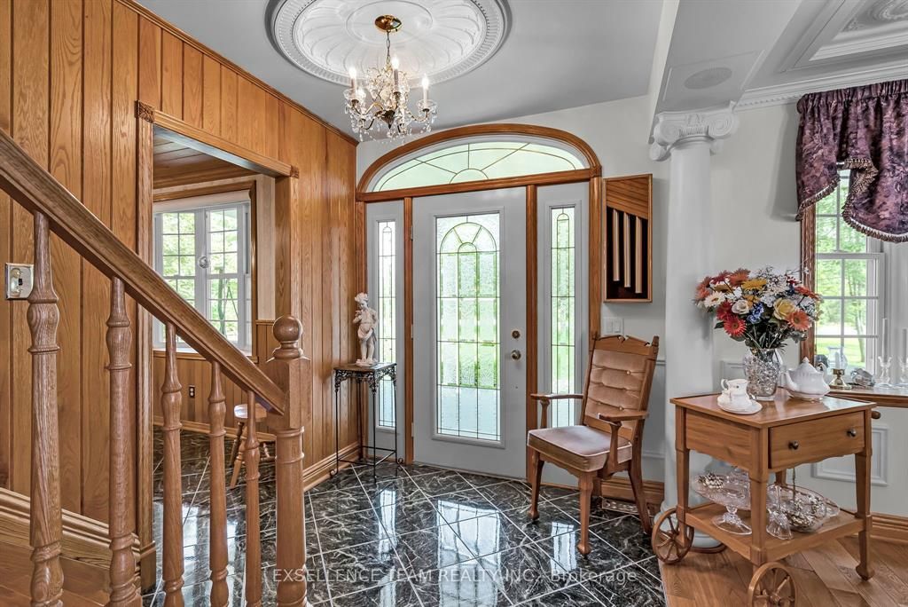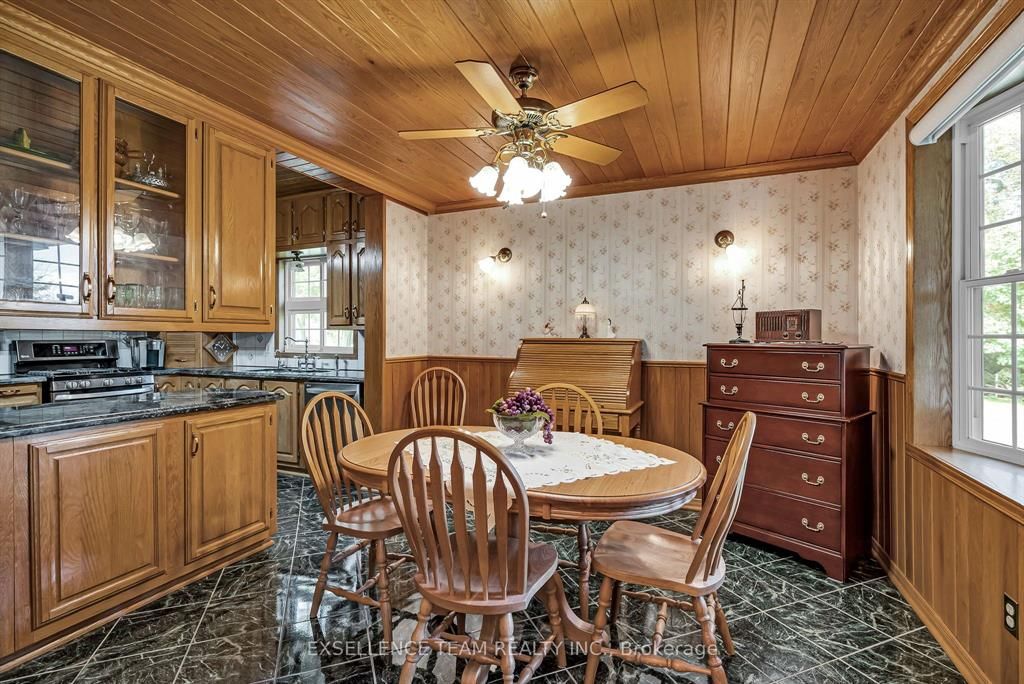 This 34 acres custom home can only be described as elegant. From the gorgeous family room that features distinctive ceilings imported from belgium and 3 inch hickory flooring. Patio doors that lead out to a covered porch, that flows into a beautiful landscaped backyard accented with a gazebo and stone waterfall. Great for family gatherings, or weddings. The gourmet kitchen boasting beautiful granite counter tops, lots of cupboard and stainless steel appliances. Formal dinning room that features distinctive ceilings that were imported from italy. This home features 4 bedroom, 4 bathroom. Master bedroom has ensuite bathroom and walkout balcony. Lower level features a kitchen, bathroom and laundry room that could be used as an in-law suite or office space. Newly refurbished barn all set up for horses complete with 4 box stall, corral, pasture, hay field, storage space. A wood area complete with trails for nature walks, hunting or 4 wheeling. No power no problem with 10,000 watt generac. Flooring: vinyl, hardwood, ceramic.