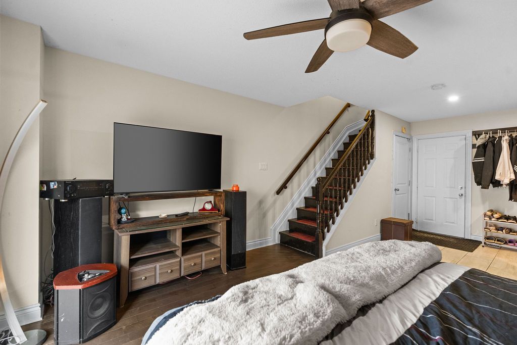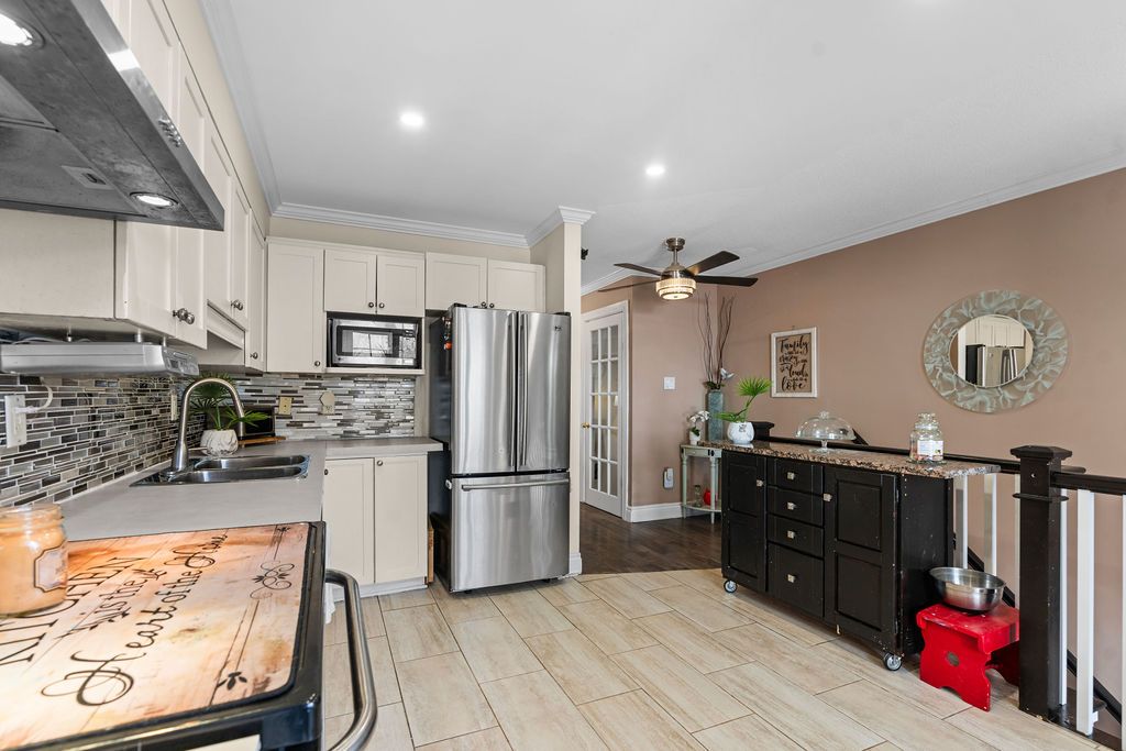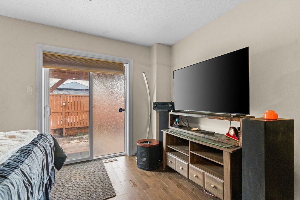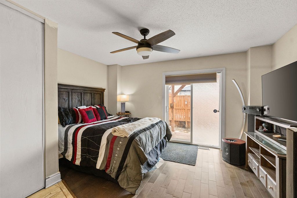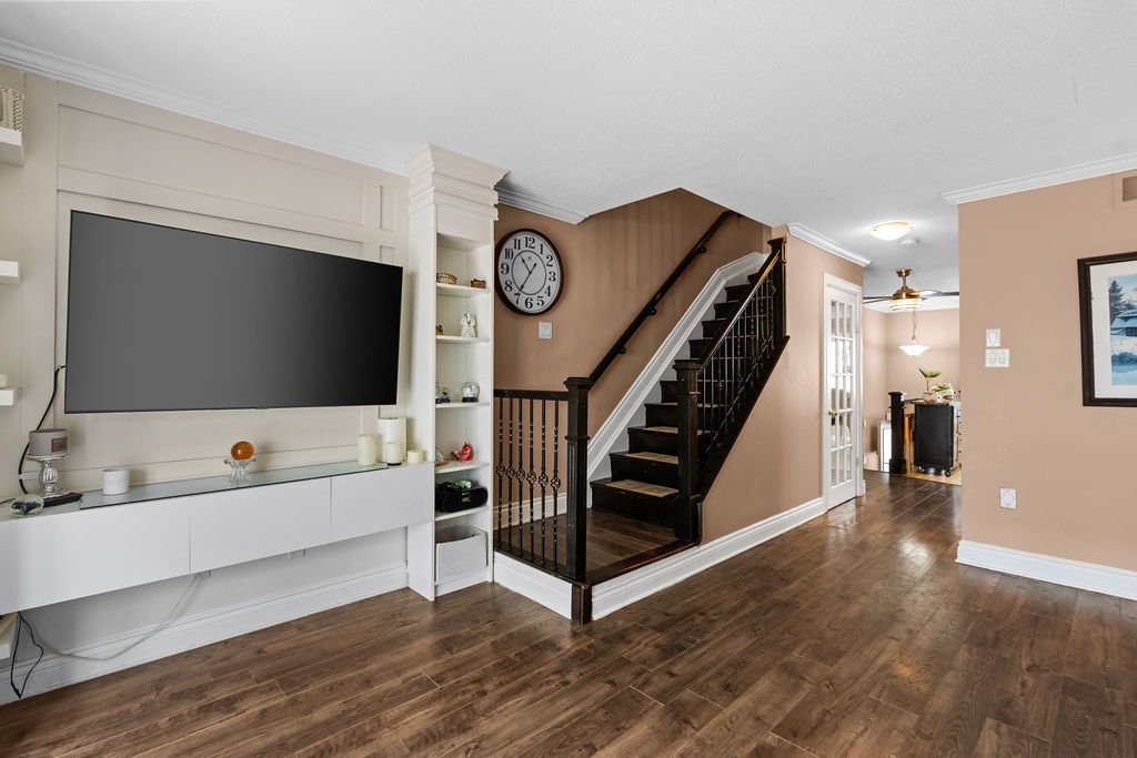 This 2-bedroom, 2-bathroom, 3-storey corner end-unit townhome has been thoughtfully updated for modern living. The main floor features an eat-in kitchen with ample cabinetry, potlights, and ceiling fans, flowing seamlessly into a living area with a fireplace and mantel. Sliding doors lead to a backyard deck with an awning, ideal for entertaining. Crown molding runs throughout, and a convenient powder room completes this level. Both bathrooms have been renovated with updated flooring. Upstairs, the spacious primary bedroom is complemented by a second bedroom and a 4-piece bathroom. The walkout basement offers additional living space, laundry, and direct access to the rear yard. Additional upgrades include a new central vacuum, new furnace, french doors, front railing installation, and updated laminate flooring throughout. The fenced yard is beautifully landscaped with perennials and stone accents along the side of the house. This turnkey home is ready for you to move in and enjoy.