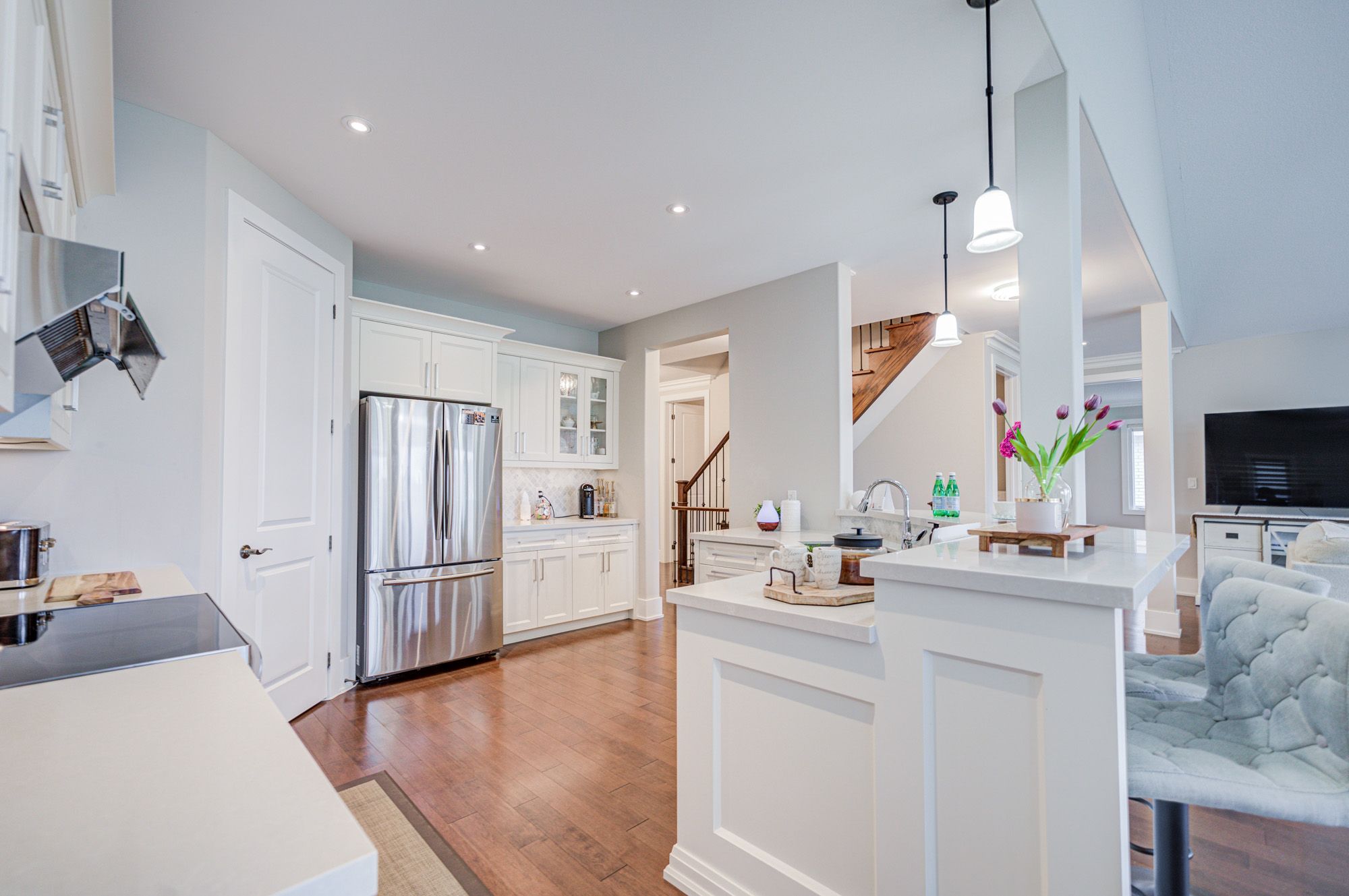 • Beautiful designer kitchen with large island and stainless appliances.