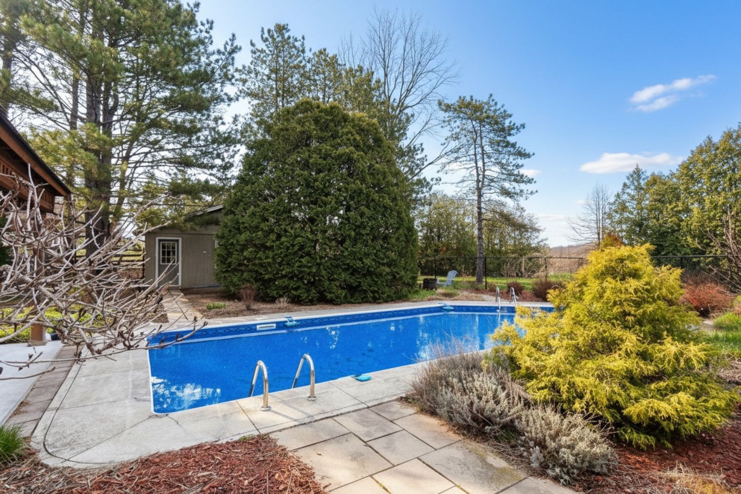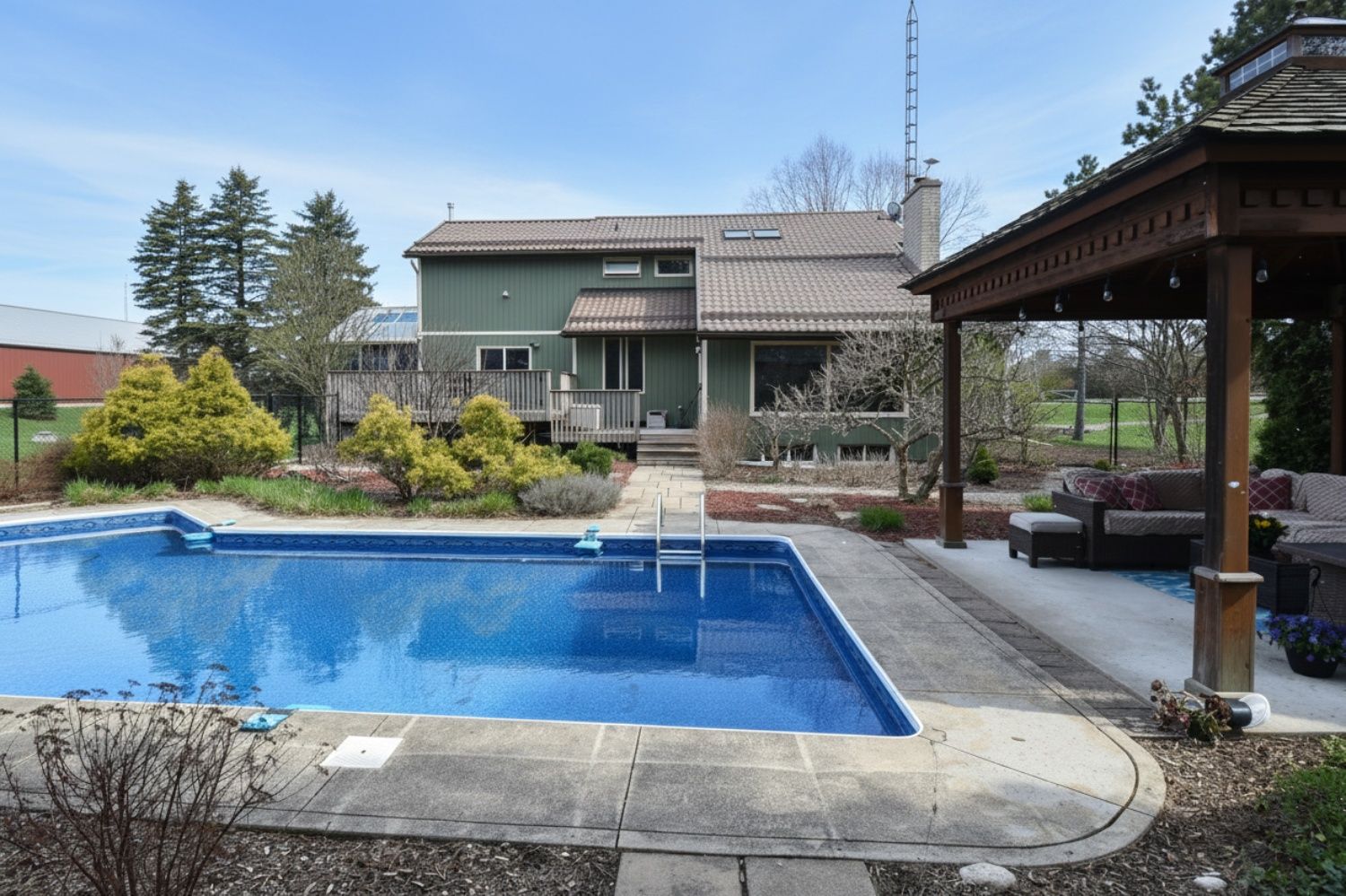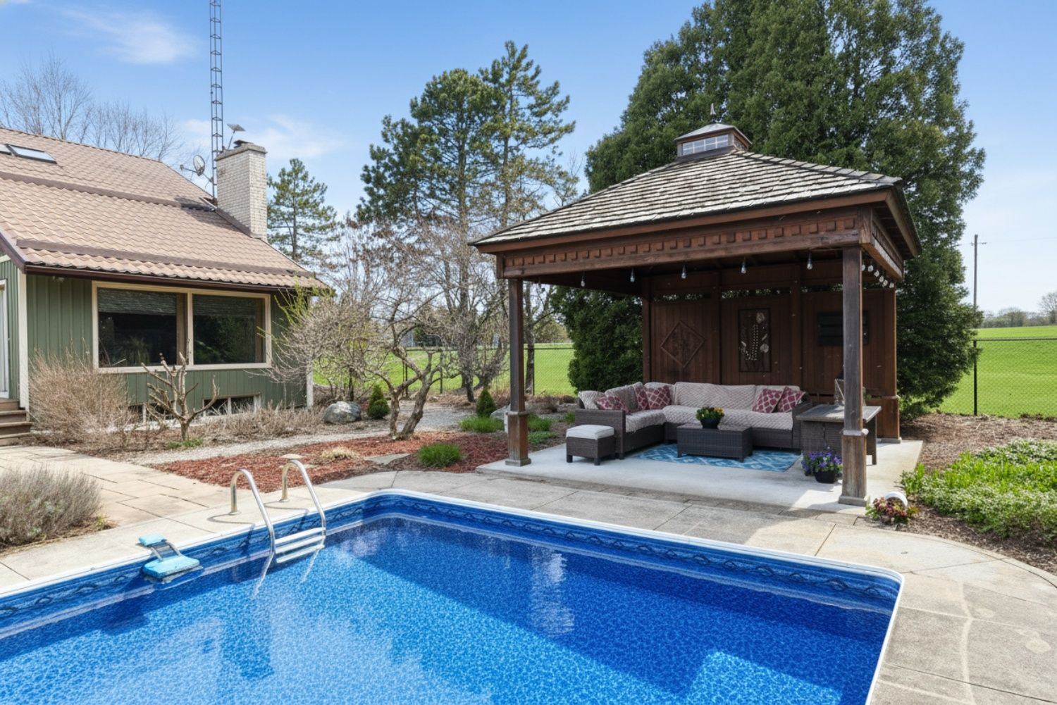Lovely 3-bedroom home with 2 full baths and 2 powder rooms set on a private, expansive 1. 5-acre treed country lot, surrounded by nature at every turn. Large picture windows throughout flood the home with natural light and offer peaceful views from nearly every room. The spacious primary suite features a fireplace, 3-piece ensuite, and walk-in closet with convenient laundry. A second bedroom offers its own 3-piece ensuite and walk-in closet, while the third bedroom provides flexible space for family, guests, or home office use. The open main floor offers generous living space, including a powder room and private office. The large country kitchen features abundant cabinetry, bonus pantry /coffee service area, and dinette with french doors leading to a multi-level deck. The sunken great room with vaulted ceilings, stone feature wall, and gas fireplace creates a warm gathering space with a walkout to the private yard. A formal living room with coffered ceiling and gas fireplace and a large, three-season sunroom add additional living and entertaining options. Inside entry from the double garage adds everyday convenience. The spacious, fully finished , partial basement provides additional living space with carpeted floors, a 2-piece bath, a hobby/bedroom area and second laundry rough-in in utility room. The utility room has laundry rough in . Step outside to a private backyard oasis featuring an in-ground pool, beautifully landscaped grounds, and a solid wood gazebo with metal roof for shaded enjoyment. This home is tastefully refreshed in neutral tones and move-in ready. Rsa.