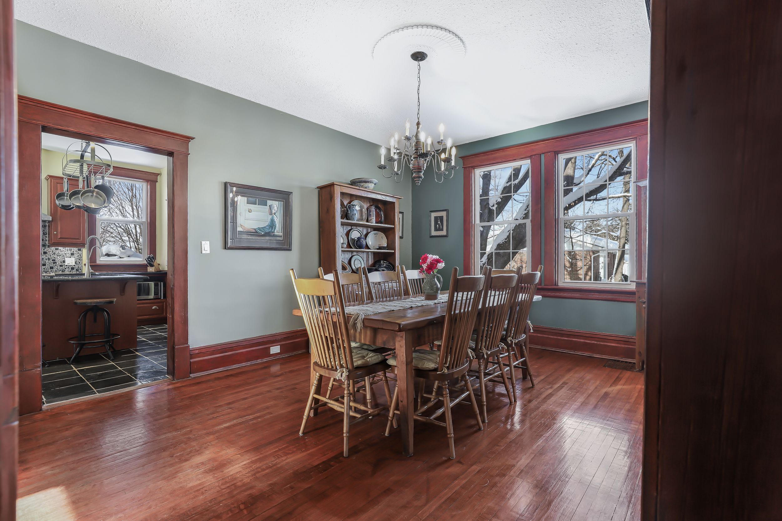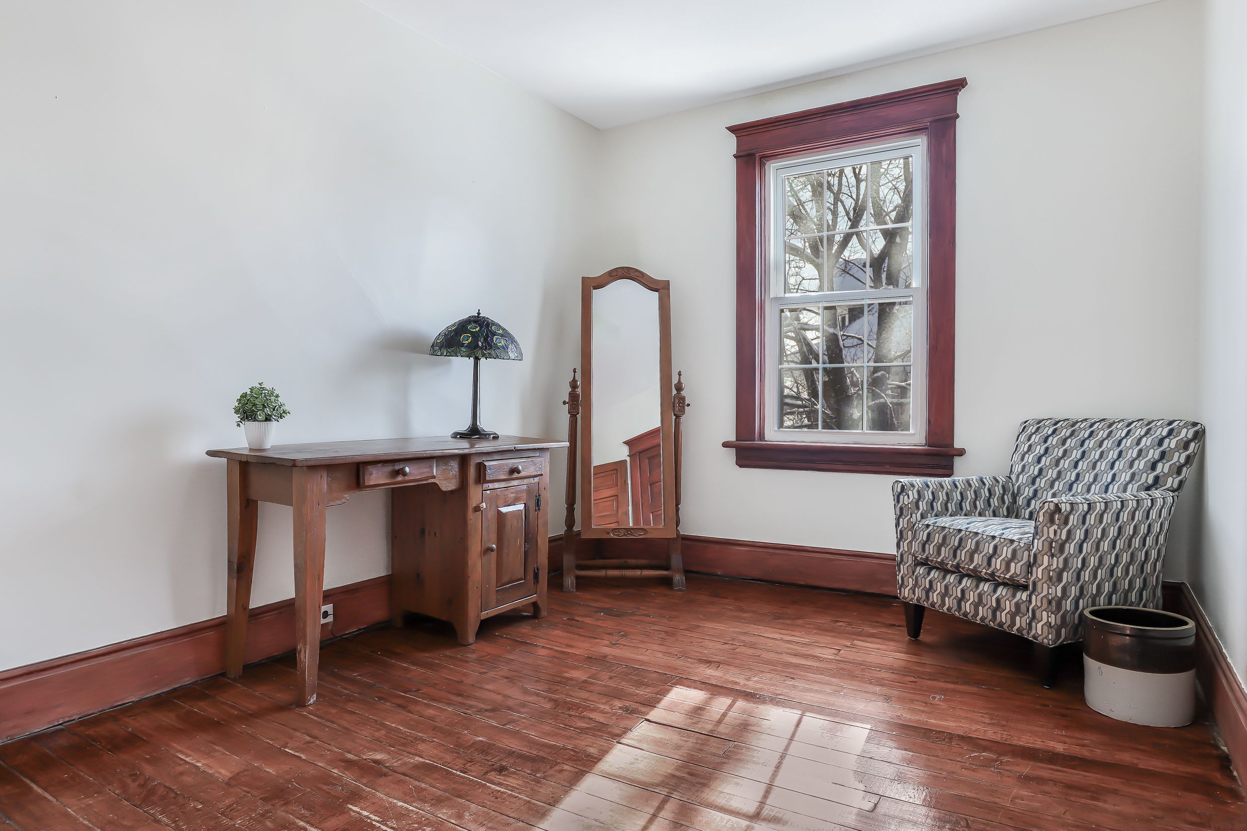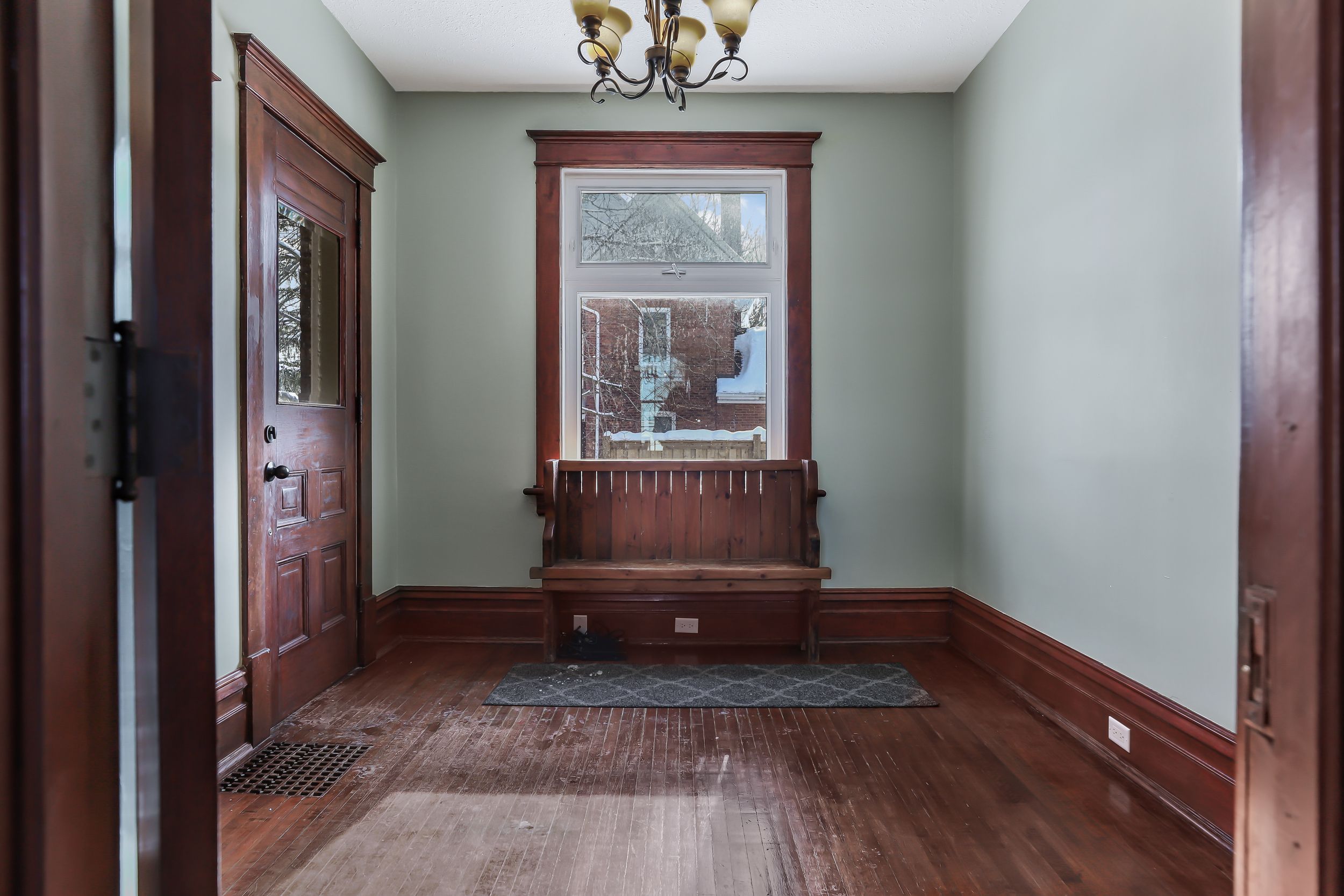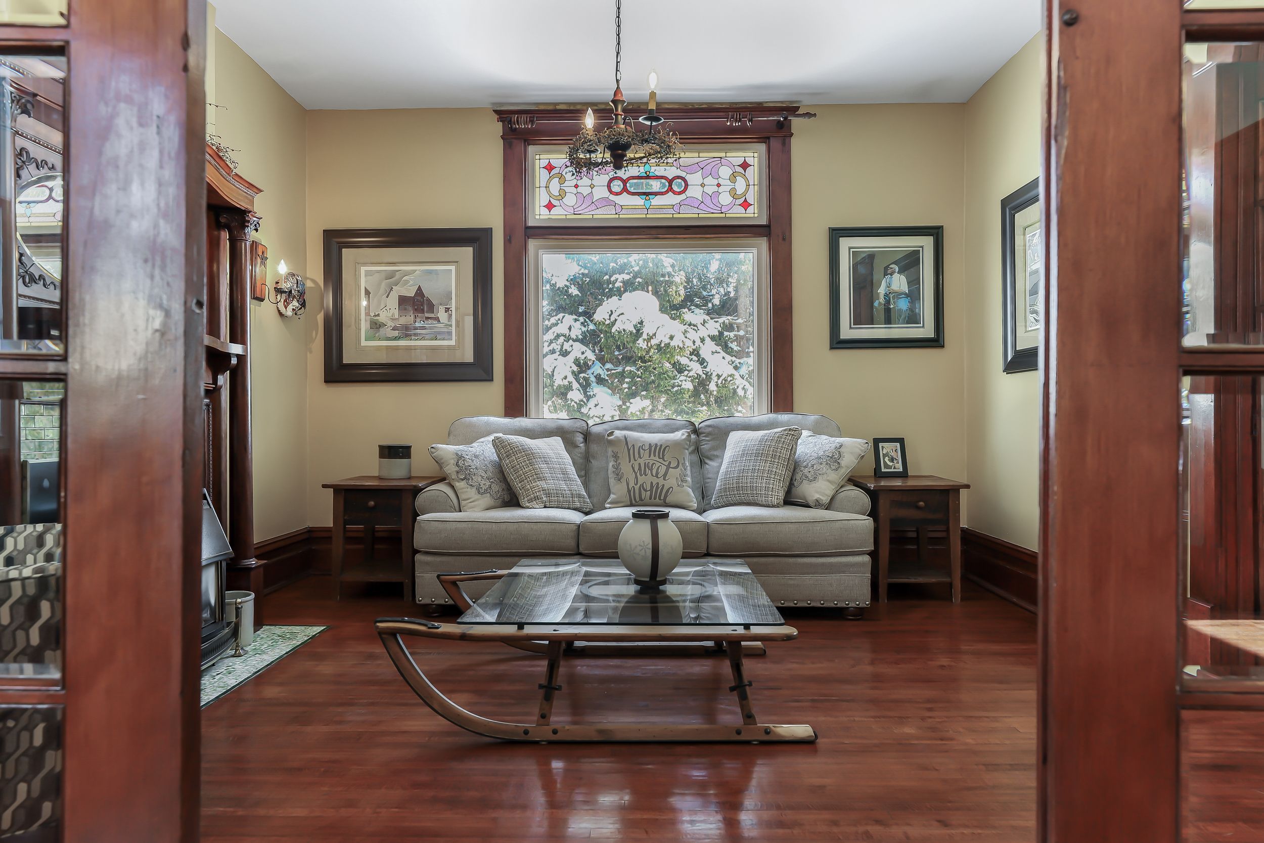 • Spacious interior with historic details like hardwood floors and stained glass.