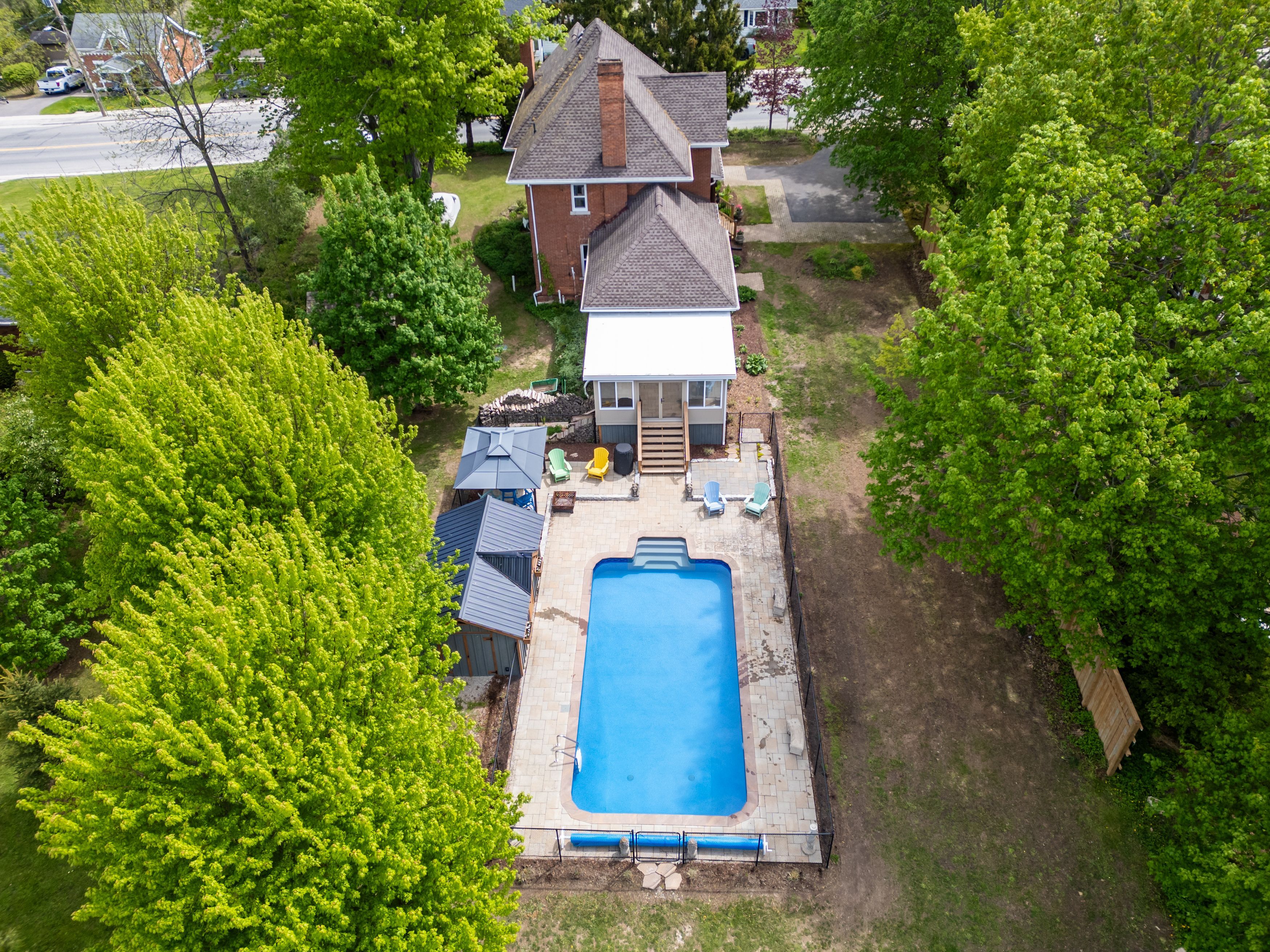 This victorian estate is a timeless masterpiece. Storied to once be home to a local doctor, this chatsworth treasure seamlessly blends old-world charm with modern comforts on a private double-wide lot. The stunning double-brick exterior, wraparound veranda, and grand 42-inch solid wood front door make a striking first impression. Inside, intricate woodwork, original hardwood floors, stained glass and transom windows, a juliet balcony, wide entryways, and soaring ceilings elevate the grandeur. Meticulously preserved, this home showcases the craftsmanship of its era while incorporating thoughtful updates for contemporary living. The formal dining room is perfect for entertaining, while the cozy living room, with its historic fireplace and natural gas insert, invites relaxation. A decorative staircase leads to the second floor, where three spacious bedrooms feature oversized windows and doors. This level also includes a dedicated laundry room and a modern 3-piece bath with an extra-large stand-up shower. The third-floor suite is a private retreat, lined with warm cedar plank walls and insulated with roxul for year-round comfort. A 2-piece bath completes this tranquil escape. Descending the historic butlers staircase, you arrive in the beautifully updated kitchen. Cherry cabinetry, a centerpiece island, stainless steel appliances, and a striking black slate natural stone floor make this space both functional and stylish. A conveniently located half bath adds to its practicality. Seamlessly connected to two inviting entertaining areas, this kitchen is the heart of the home. On one side, a formal dining area sets the stage for intimate gatherings, while the other opens into a cozy living room with a gas fireplace. Beyond, the four-season sunroom is a showpiece flooded with natural light and offering direct access to the backyard oasis. Completed in 2023, the in-ground pool is a true highlight, surrounded by interlocking stone, a fire pit, and a mennonite-style pool house.