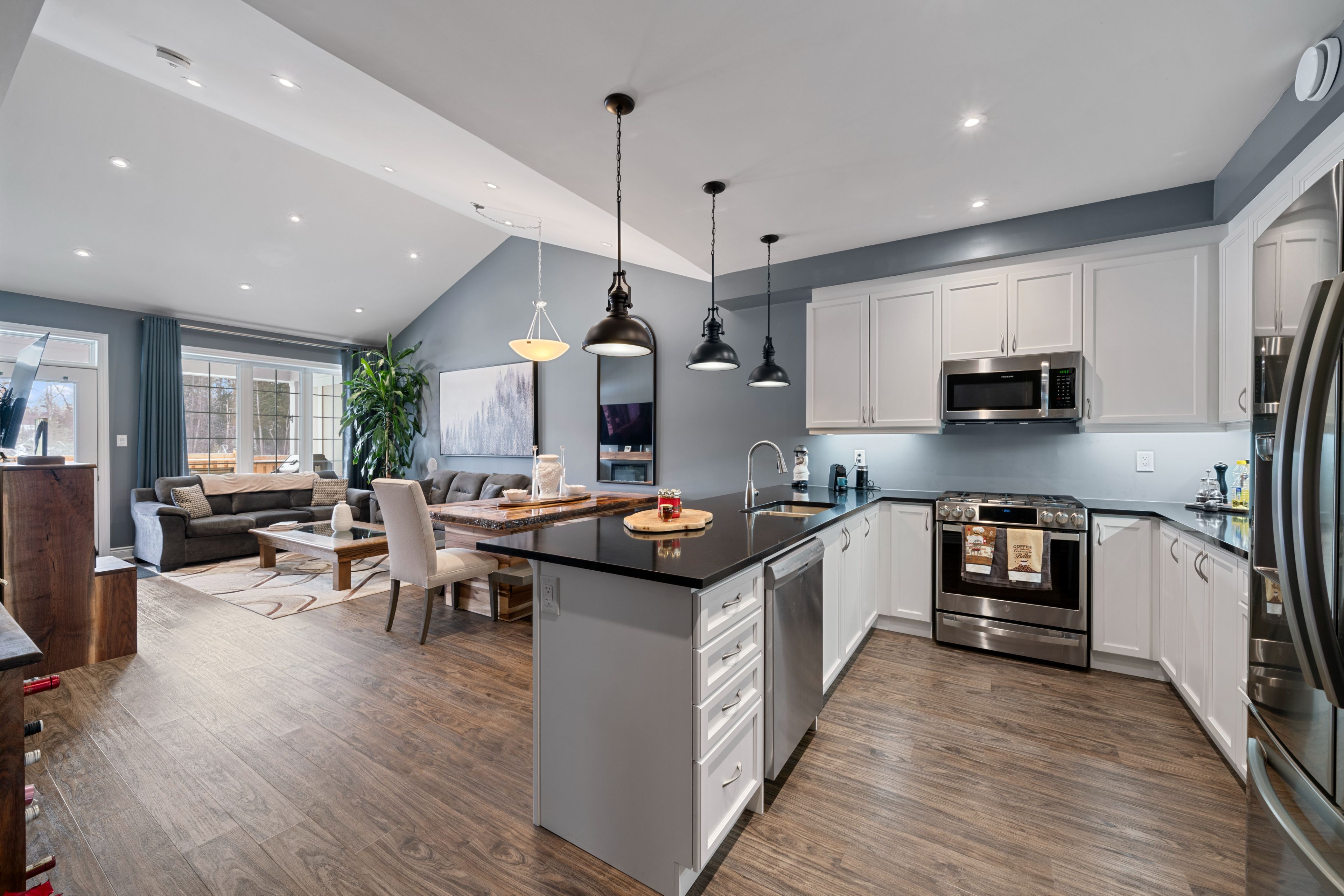 • Open concept kitchen with quartz counters and ample storage space.
