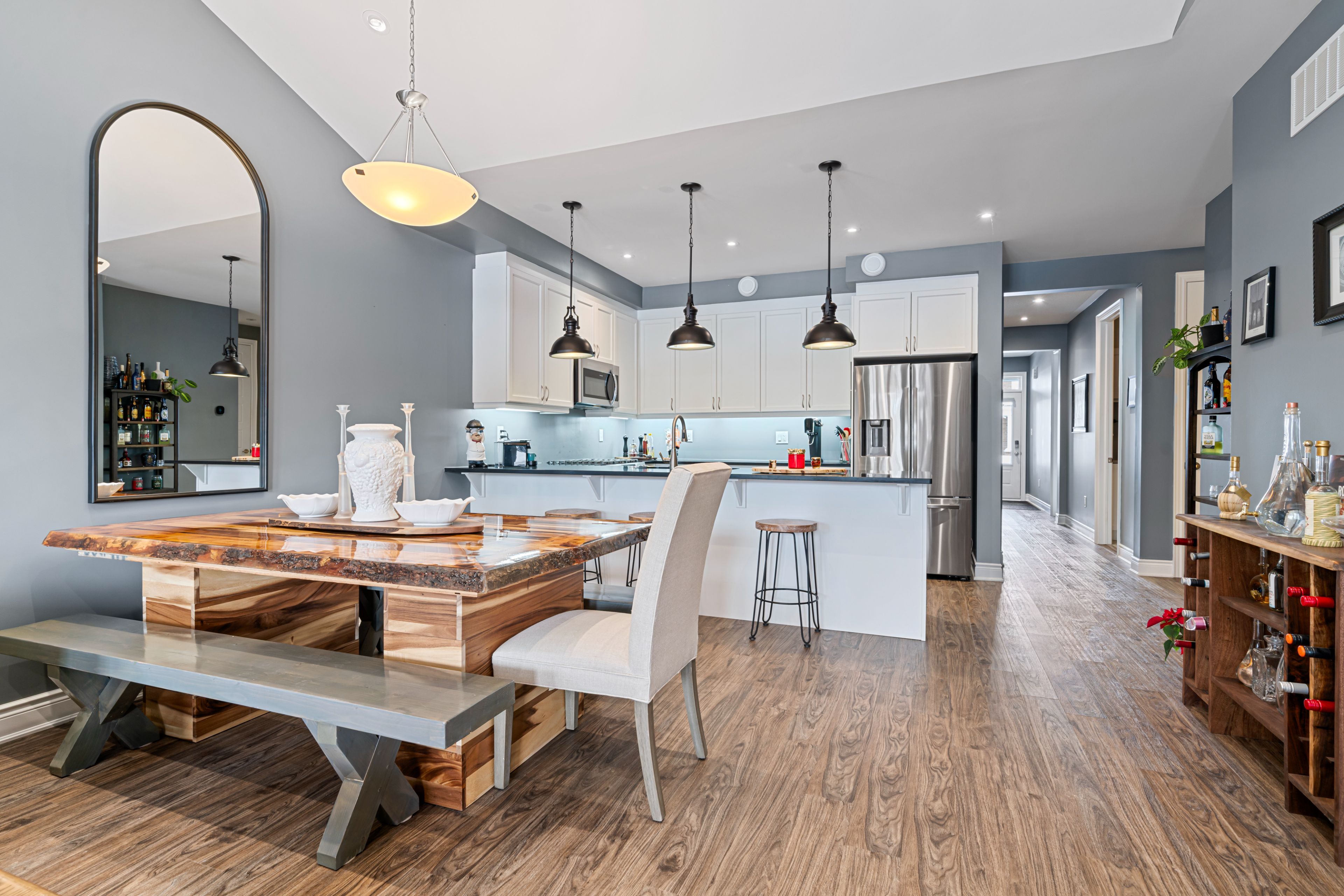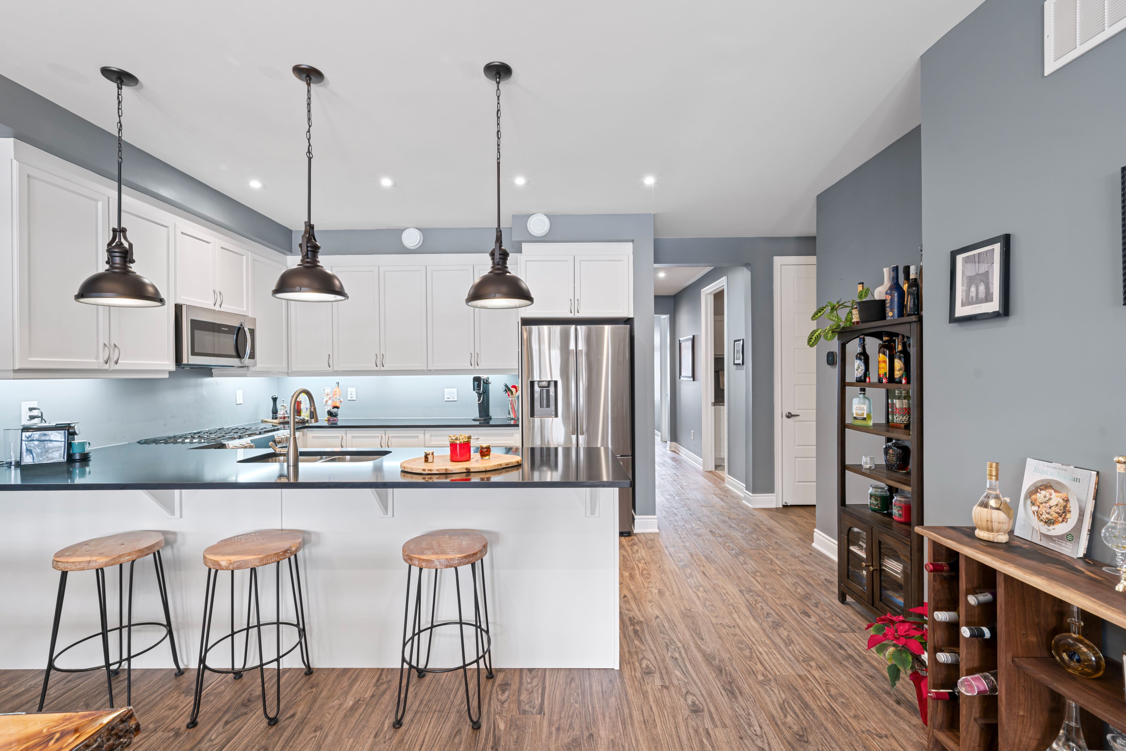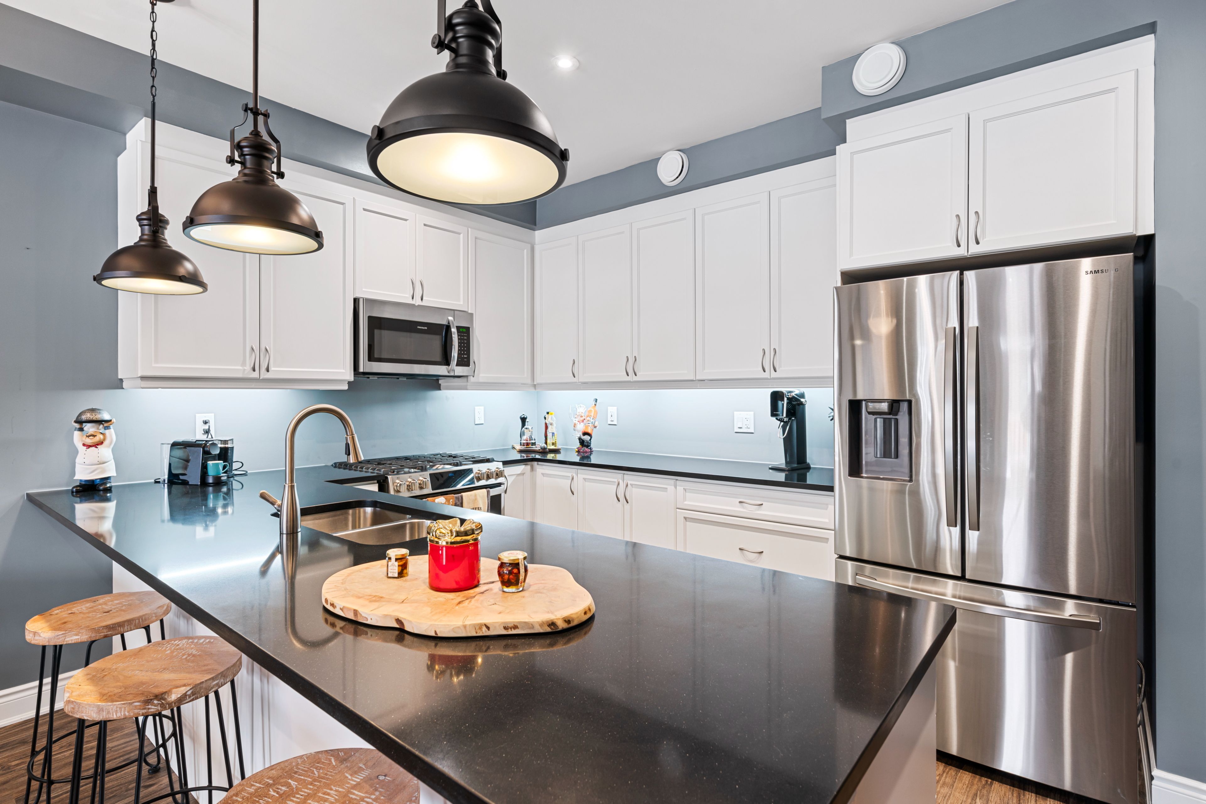 • Chef's kitchen features quartz counters, ample storage, and stylish finishes.