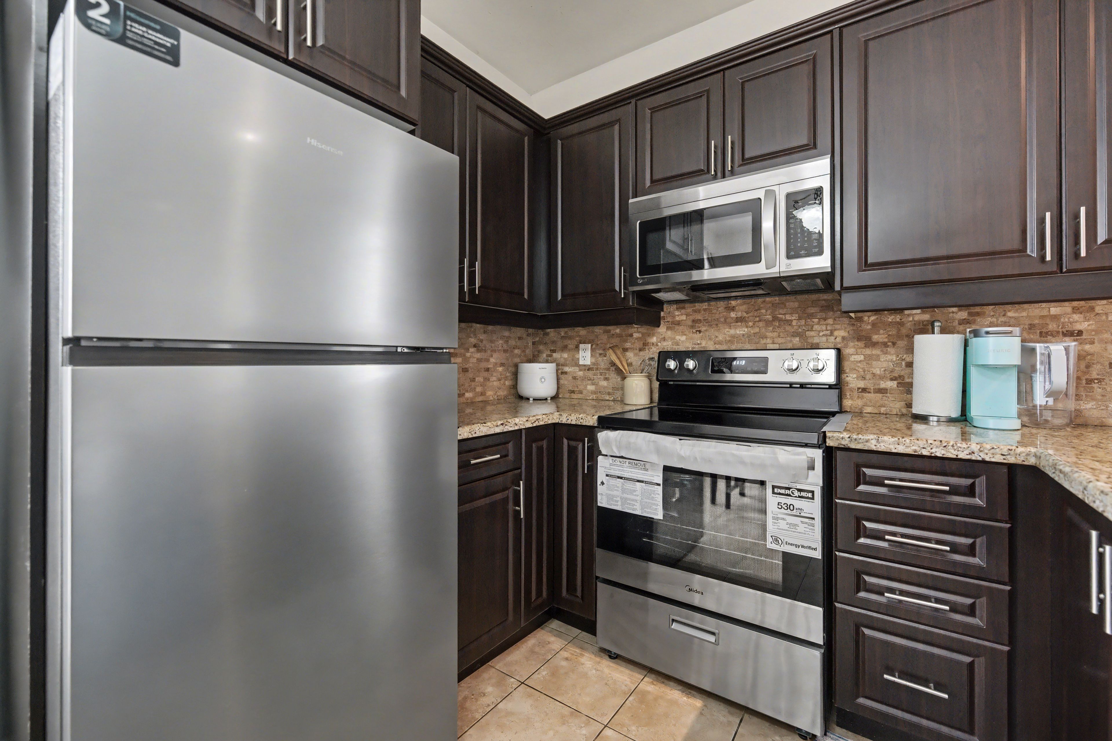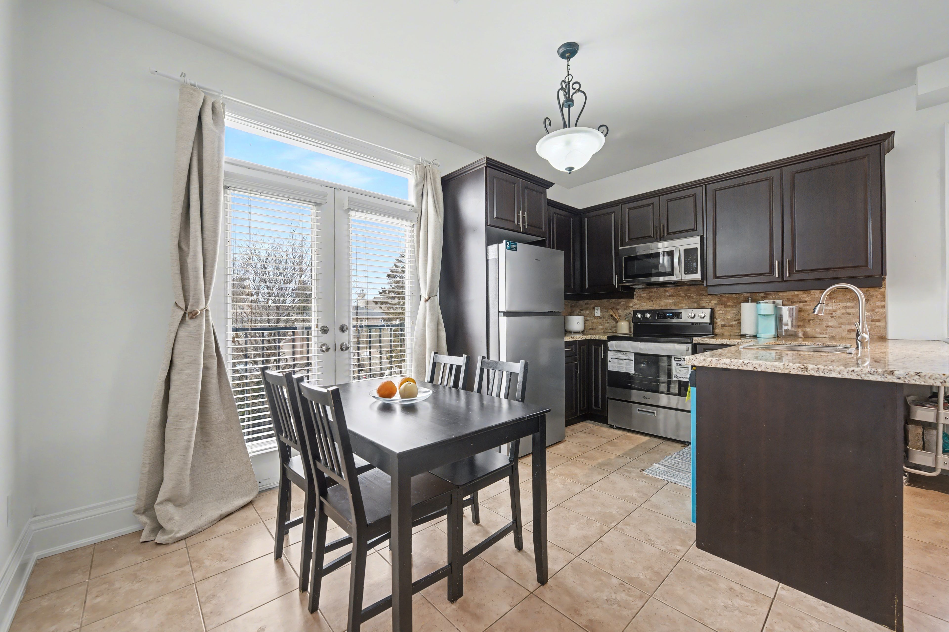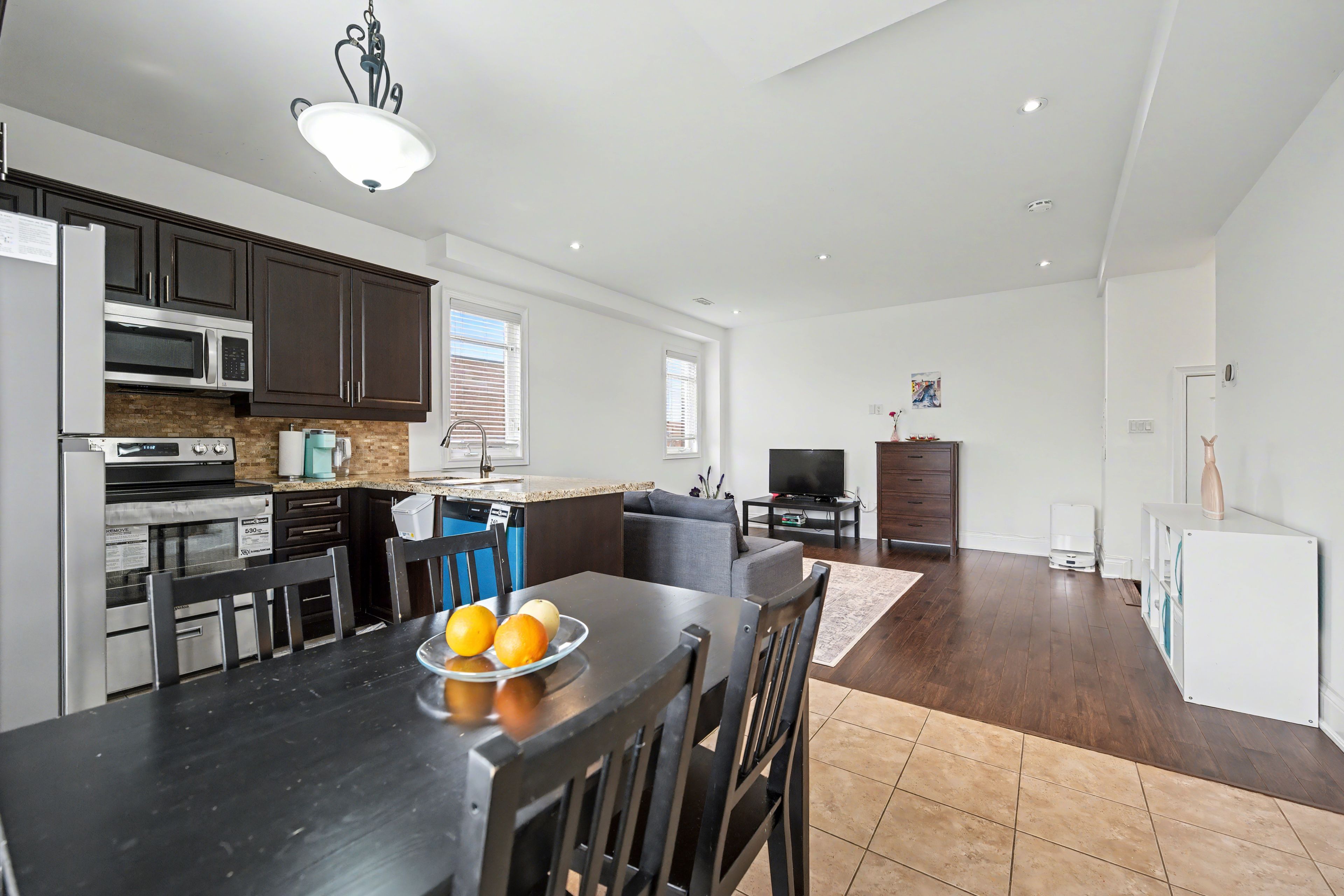 • Open concept kitchen equipped with stainless steel appliances and breakfast bar.