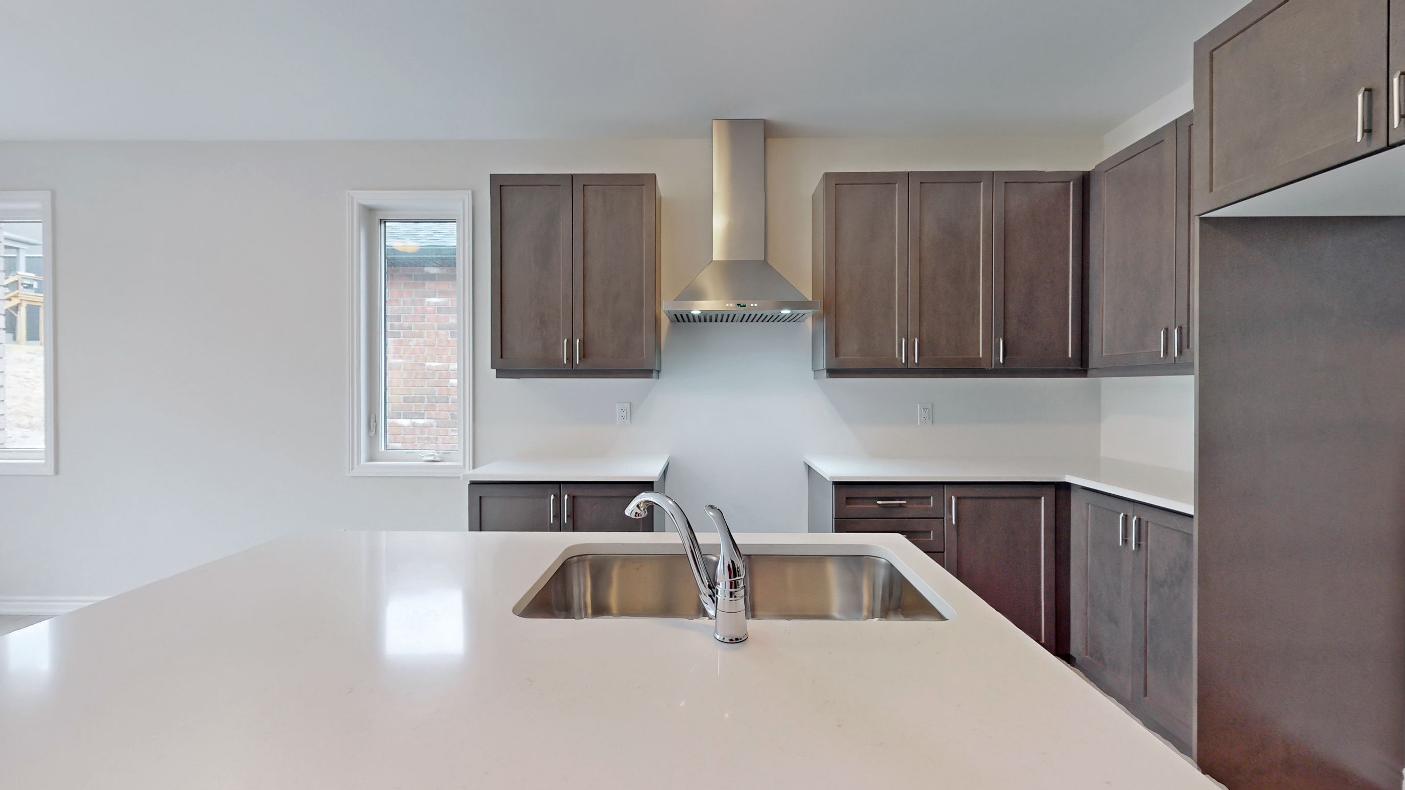 • Upgraded kitchen features modern cabinetry and sleek hood range.