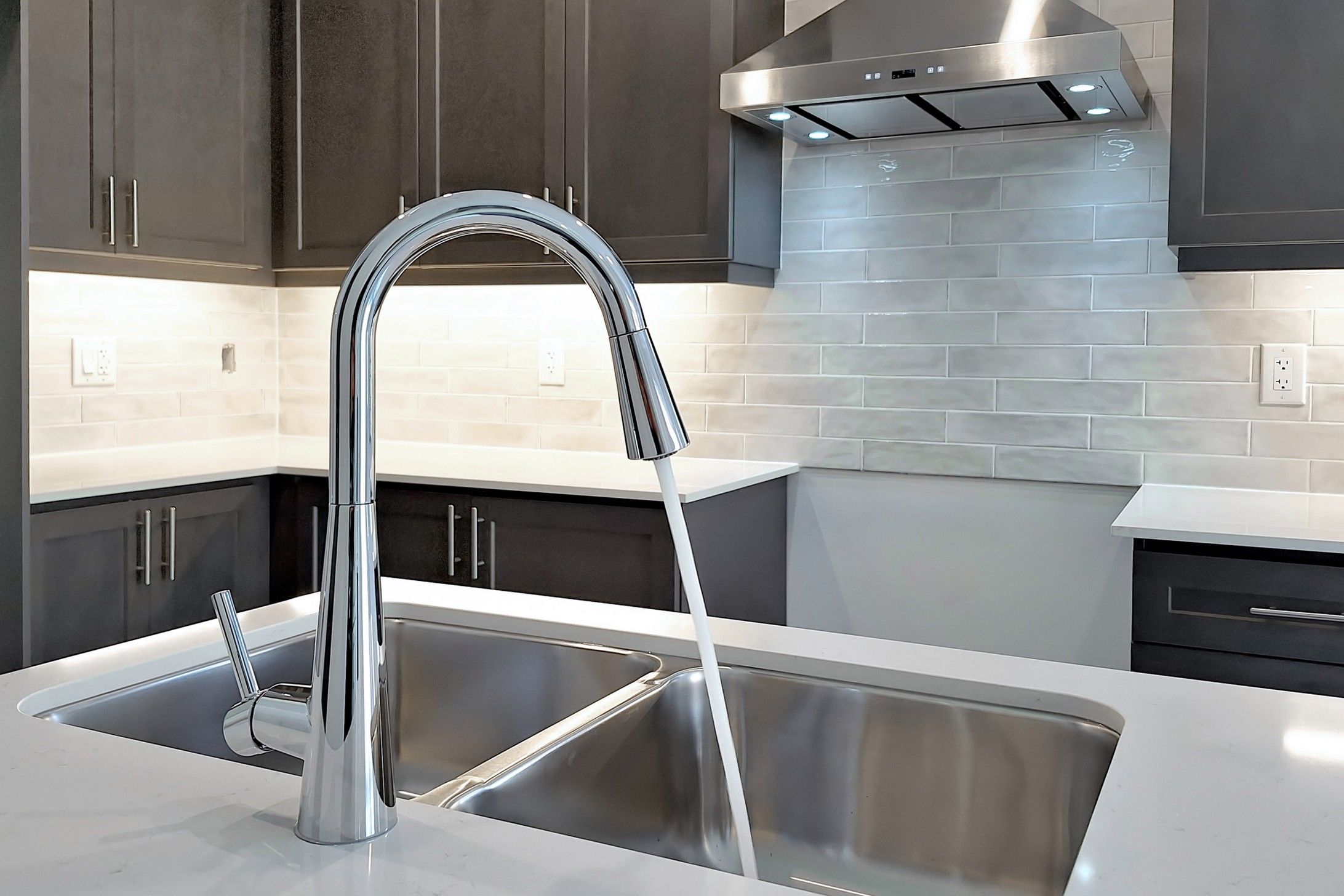 • Stylish kitchen features upgraded cabinetry and chimney-style range hood.