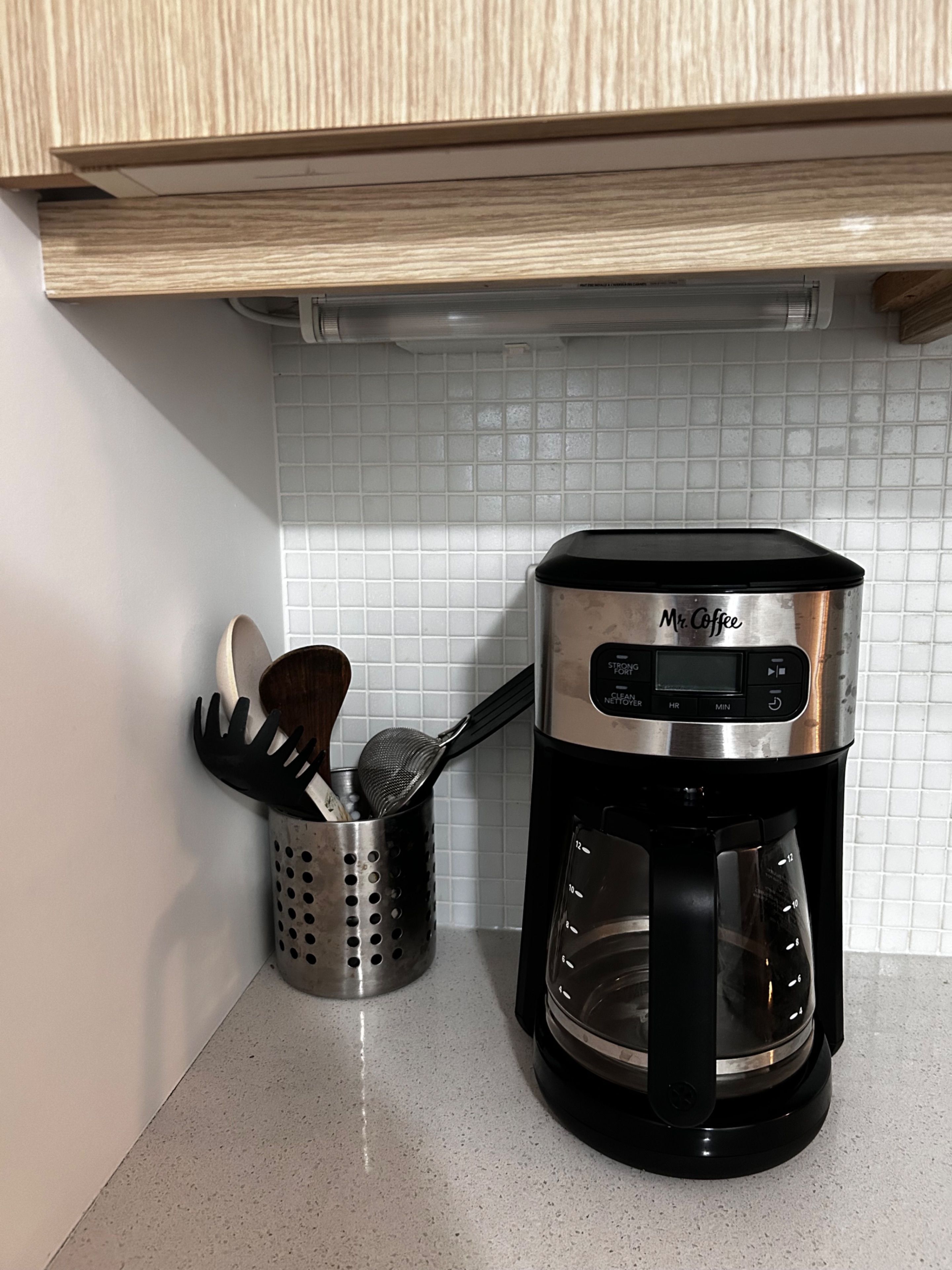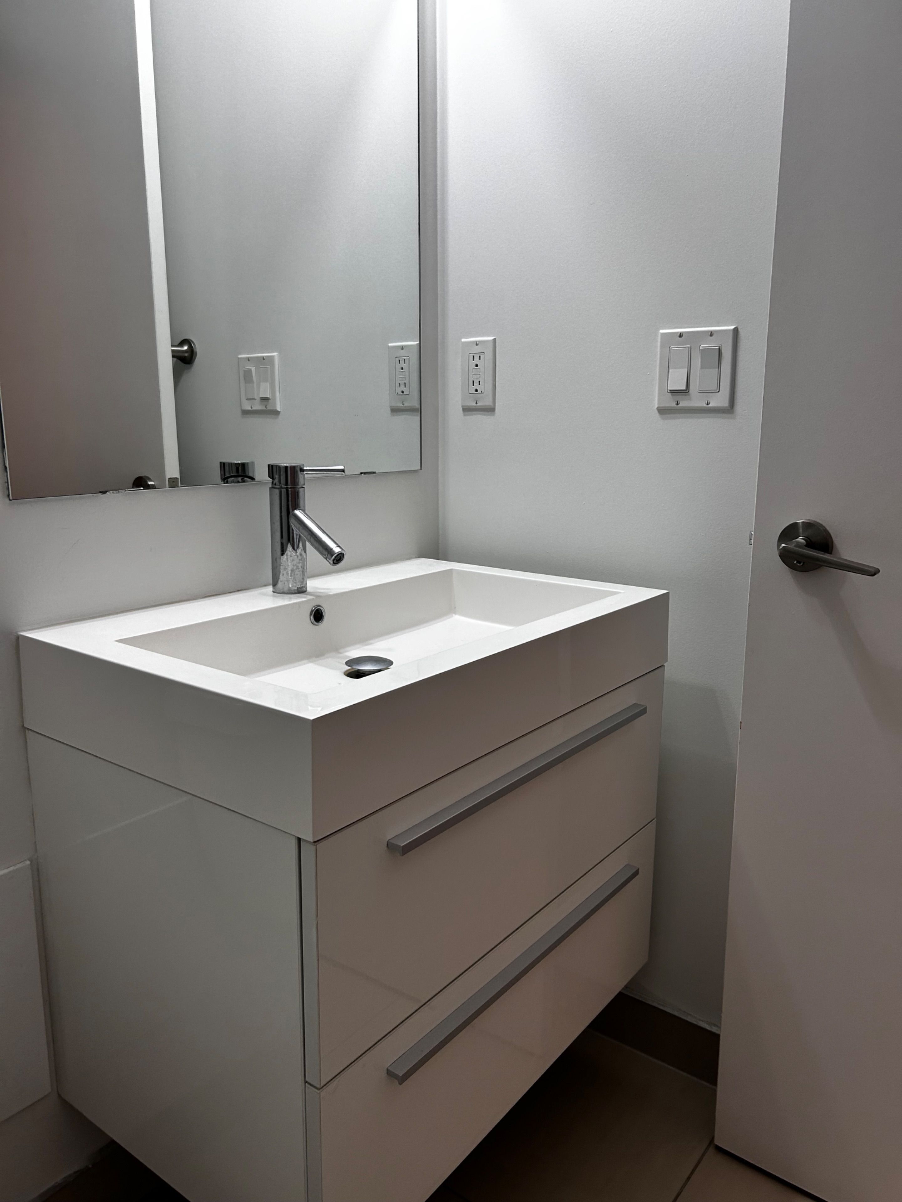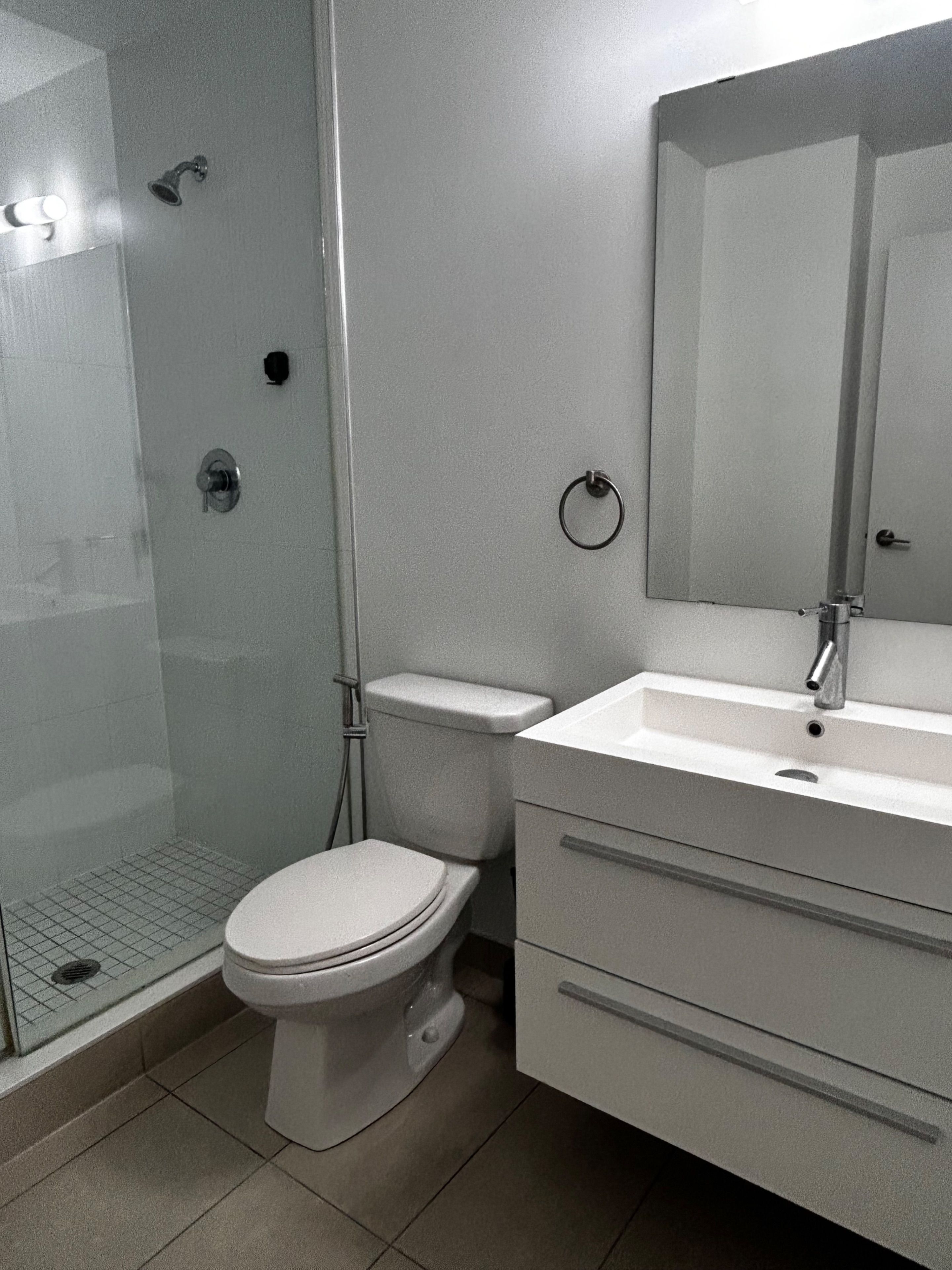 • Modern finishes include quartz countertops and laminate flooring.