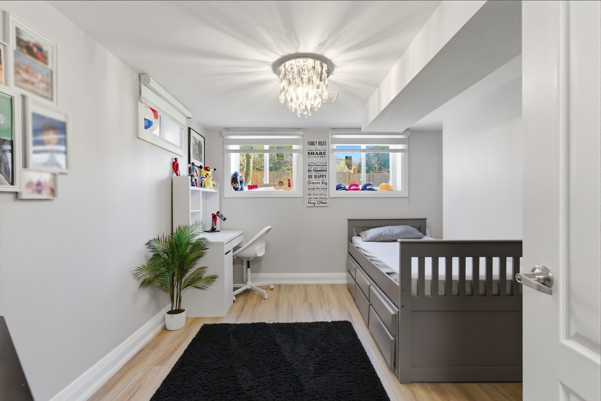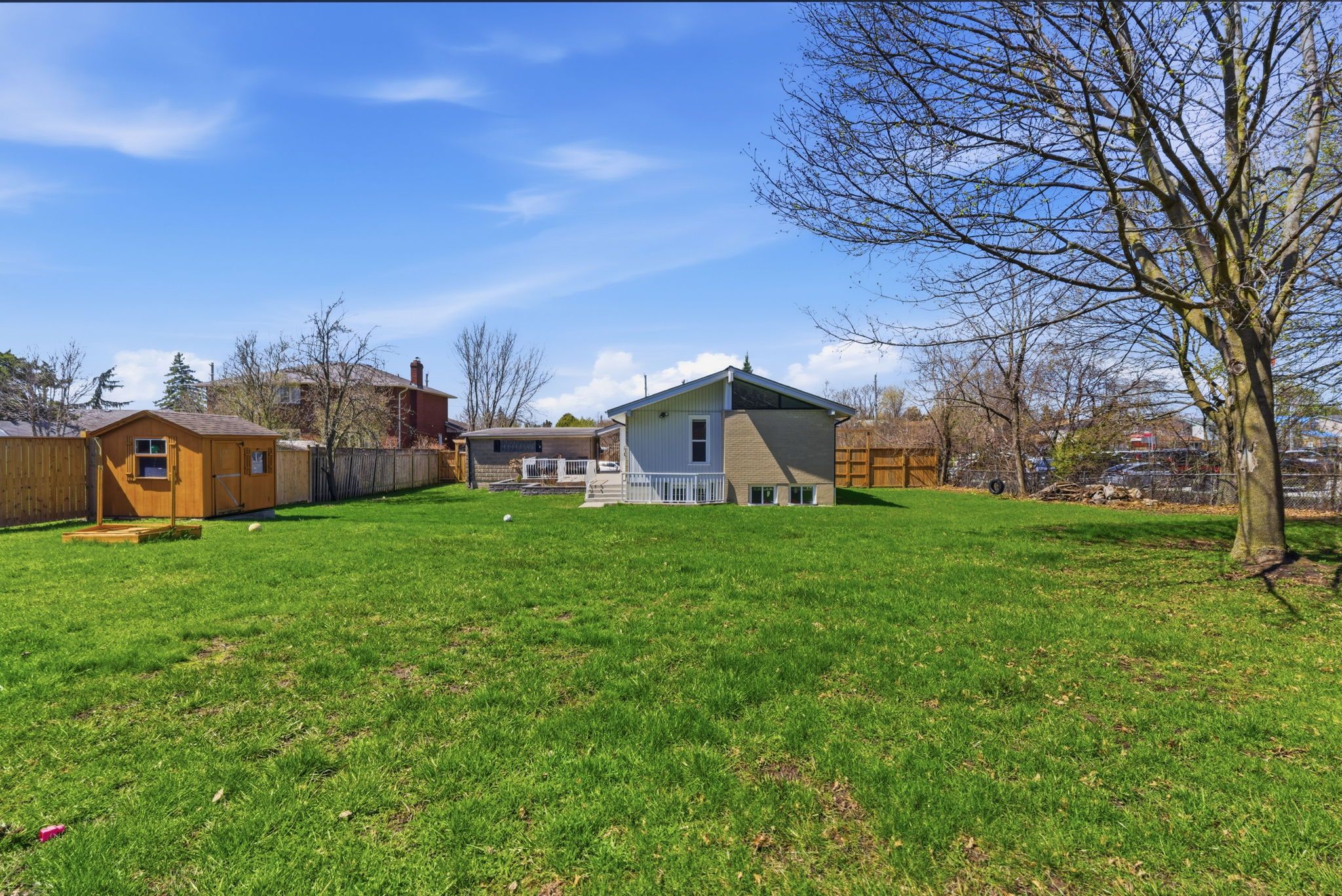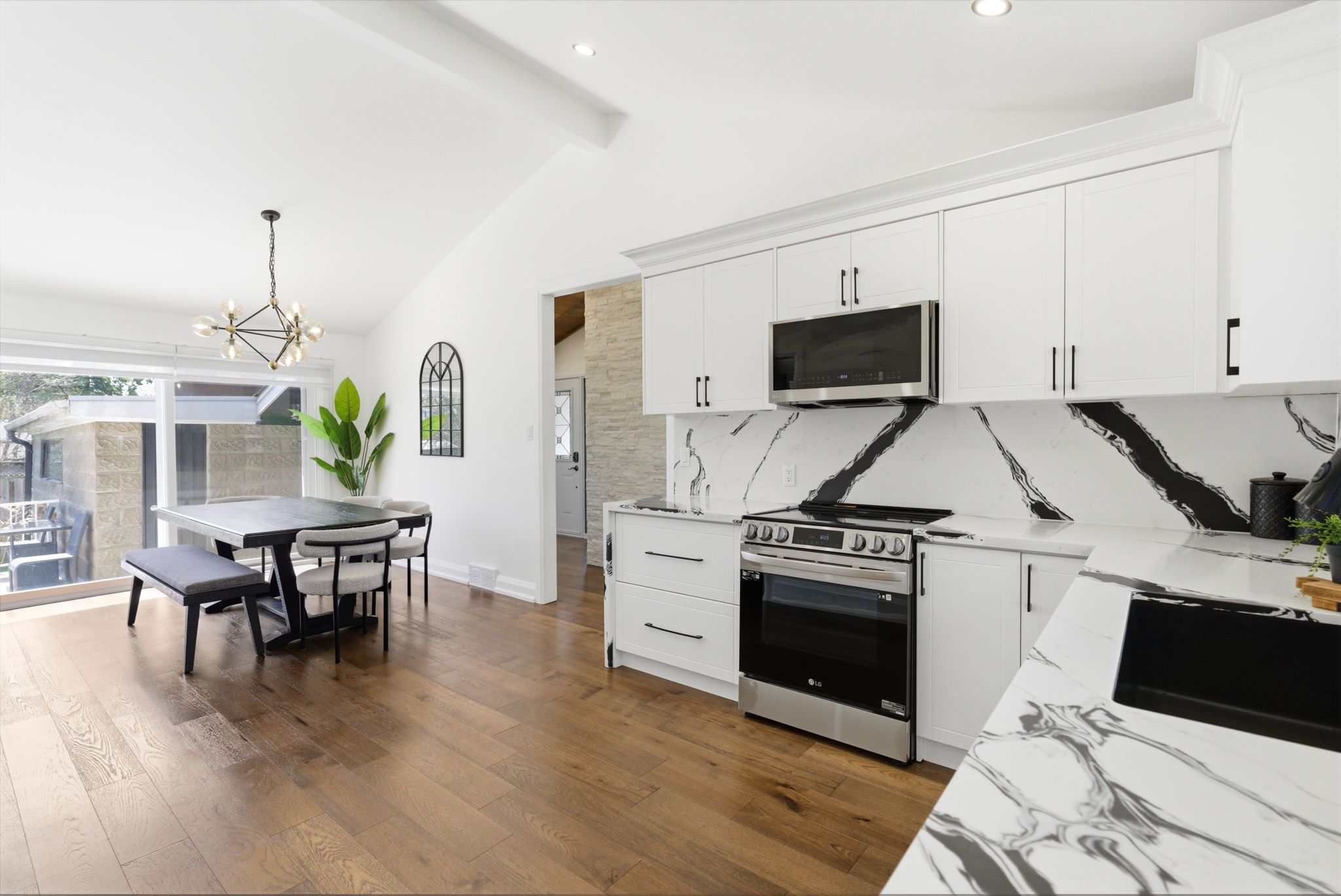 Spacious, fully renovated contemporary bungalow featuring soaring vaulted ceilings, set on an impressive 100 x 230 ft. Lot. Beautifully renovated kitchen features all the bells and whistles with 2 walk-outs to the yard. The primary bedroom offers a beautifully updated 4-piece ensuite and wall-to-wall built-in cabinetry. Two additional bedrooms and a stylish 3-piece bathroom complete the main level. Double car detached garage. Extensive updates include shingles (2025) and doors, fence, windows, the kitchen, flooring, all bathrooms, and air conditioning (2023) and window coverings are included. The renovated basement adds valuable living space, featuring a bedroom with lookout windows, a recreation room with a walk-up to the yard, a 2-piece bathroom, and ample storage. Ideal setup for a potential in-law suite.