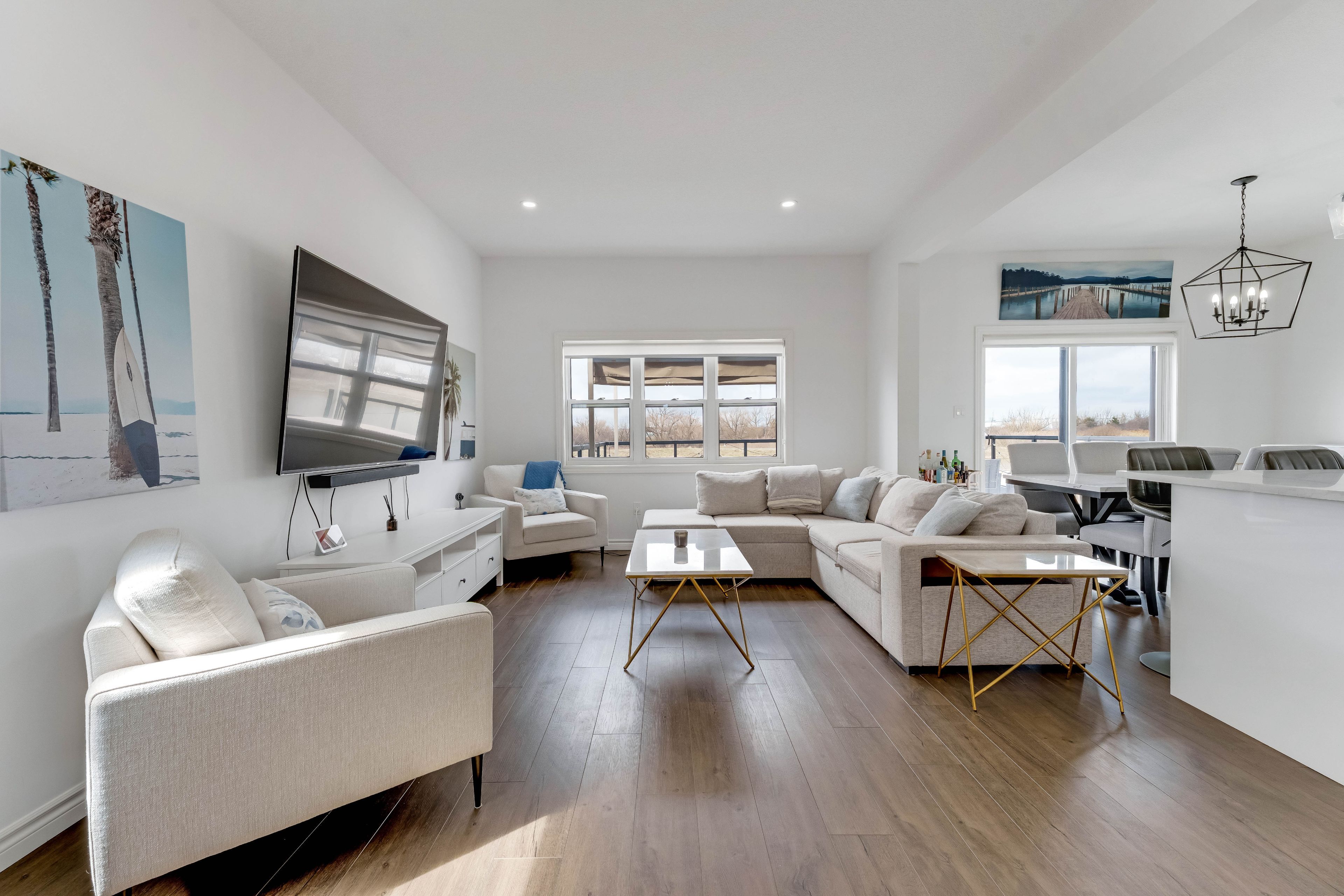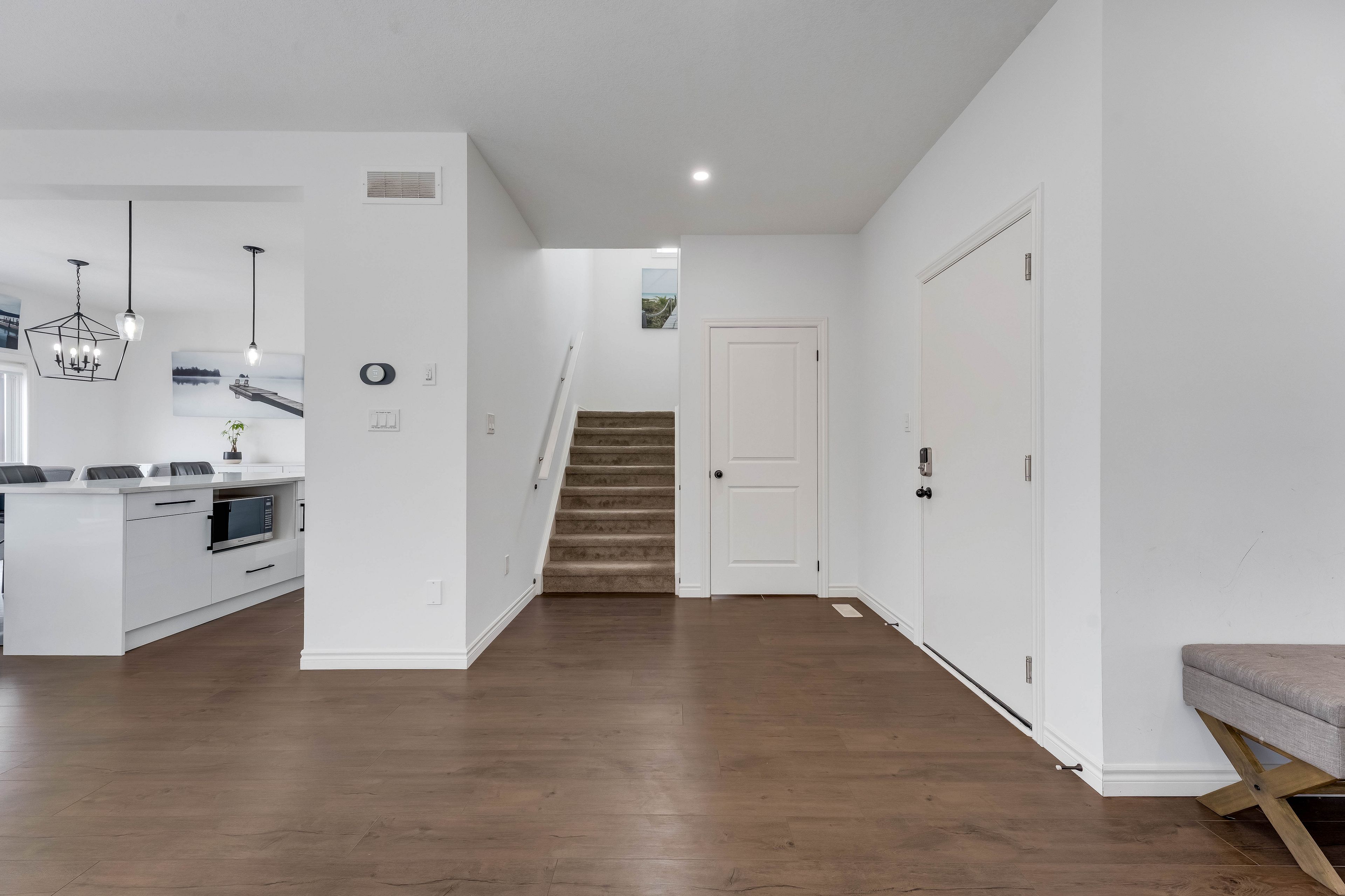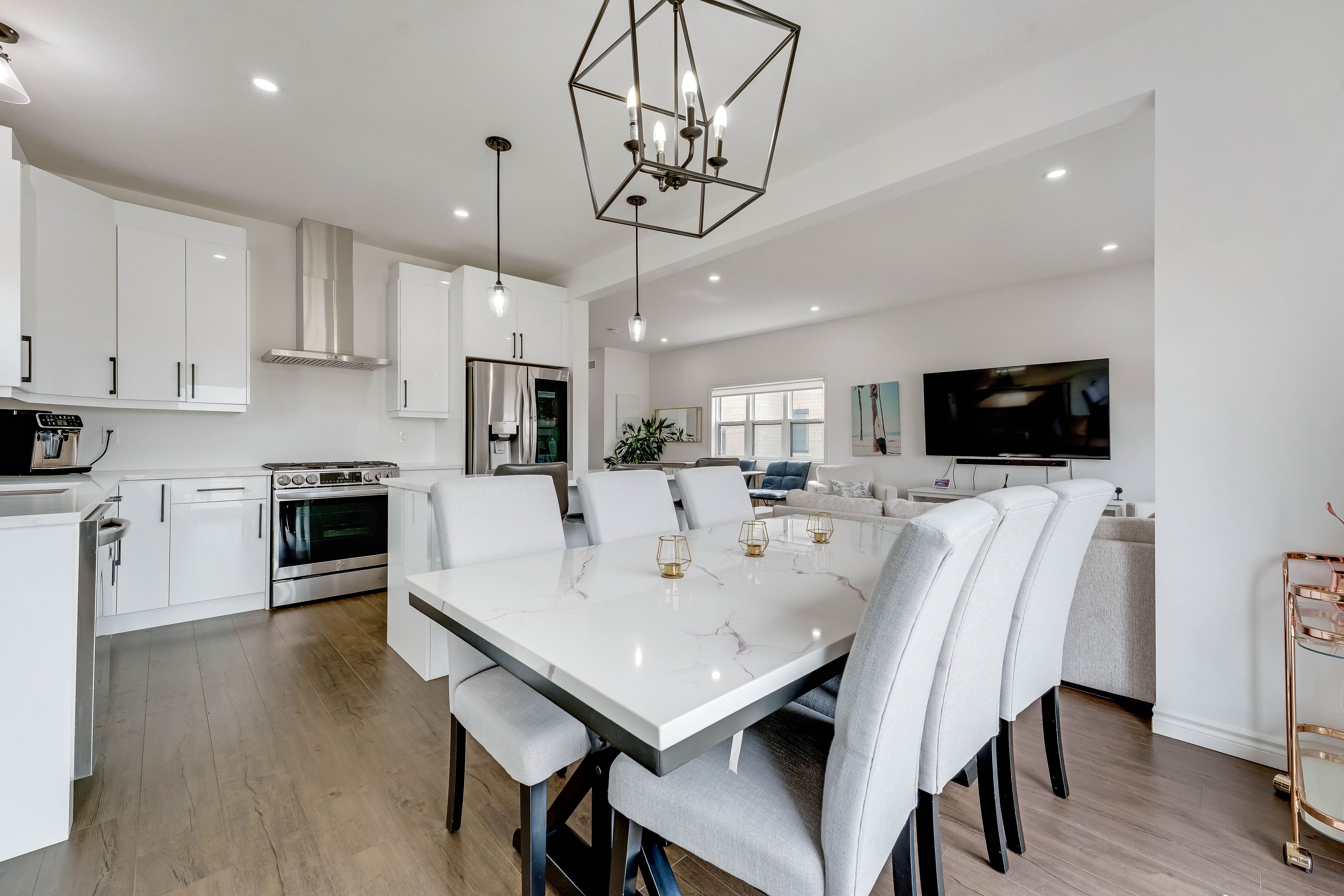 • Open-concept main floor with high ceilings and hardwood flooring.