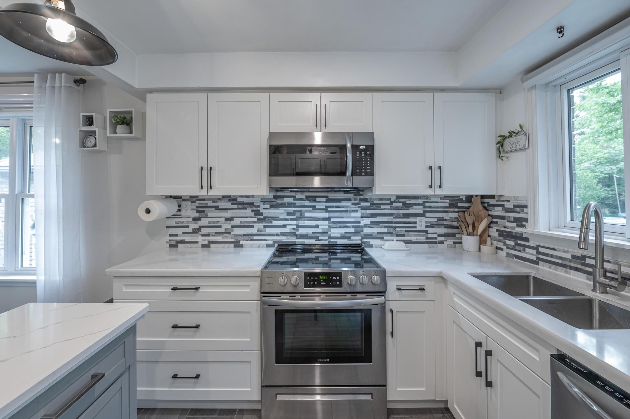 • Renovated main floor with open-concept kitchen and modern appliances.