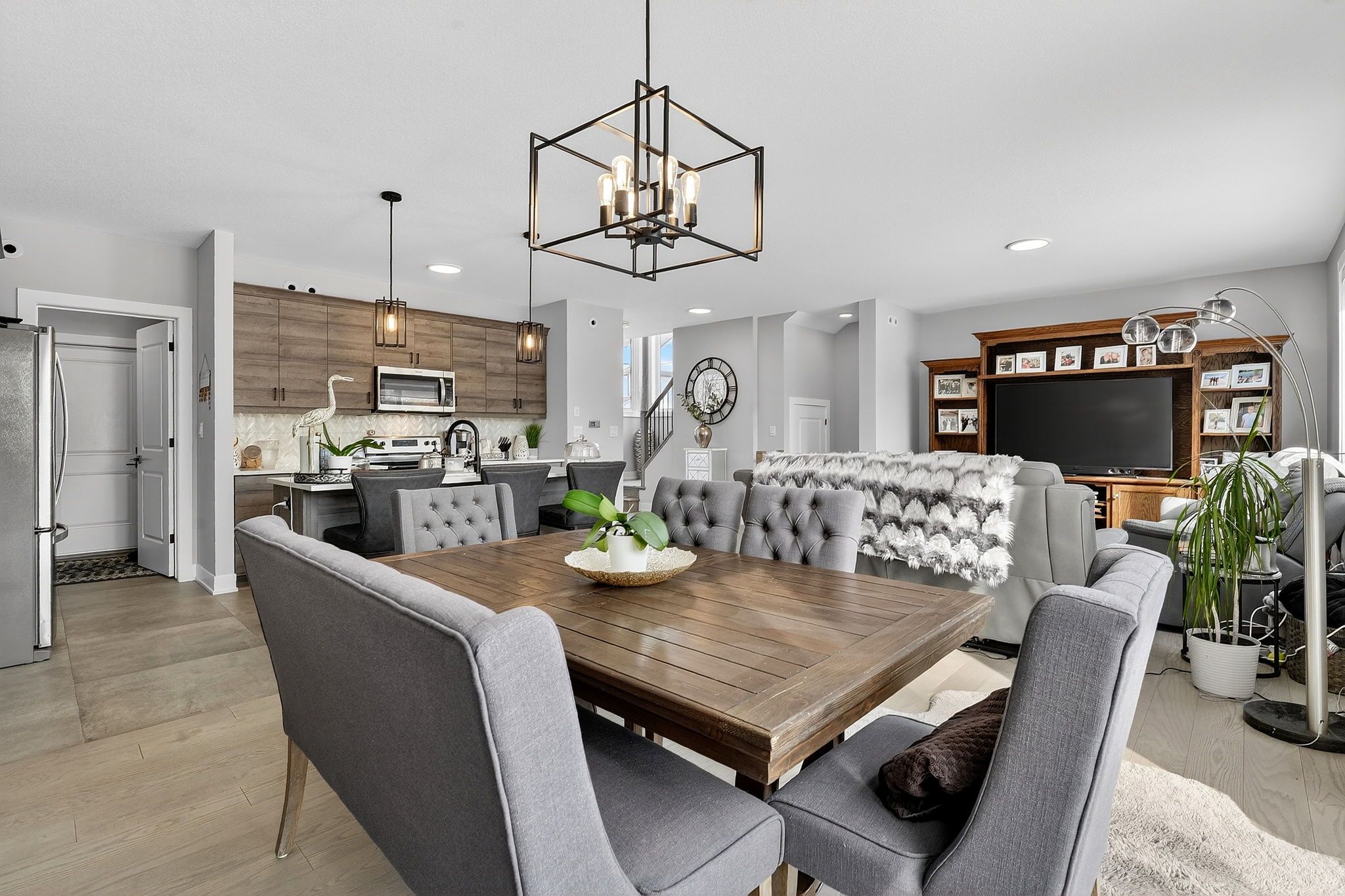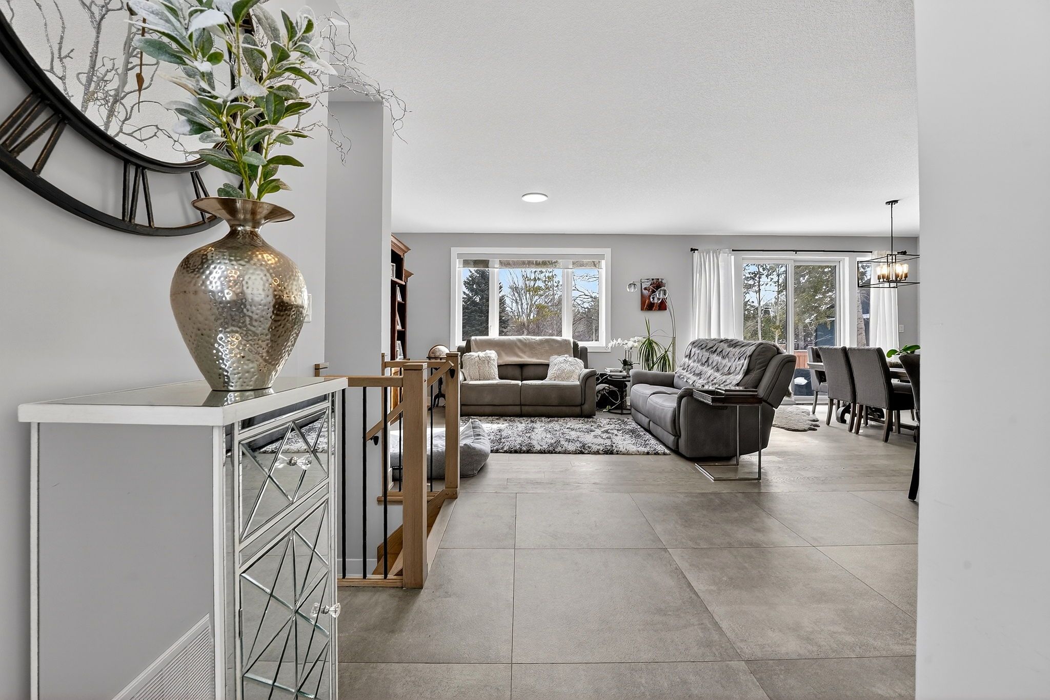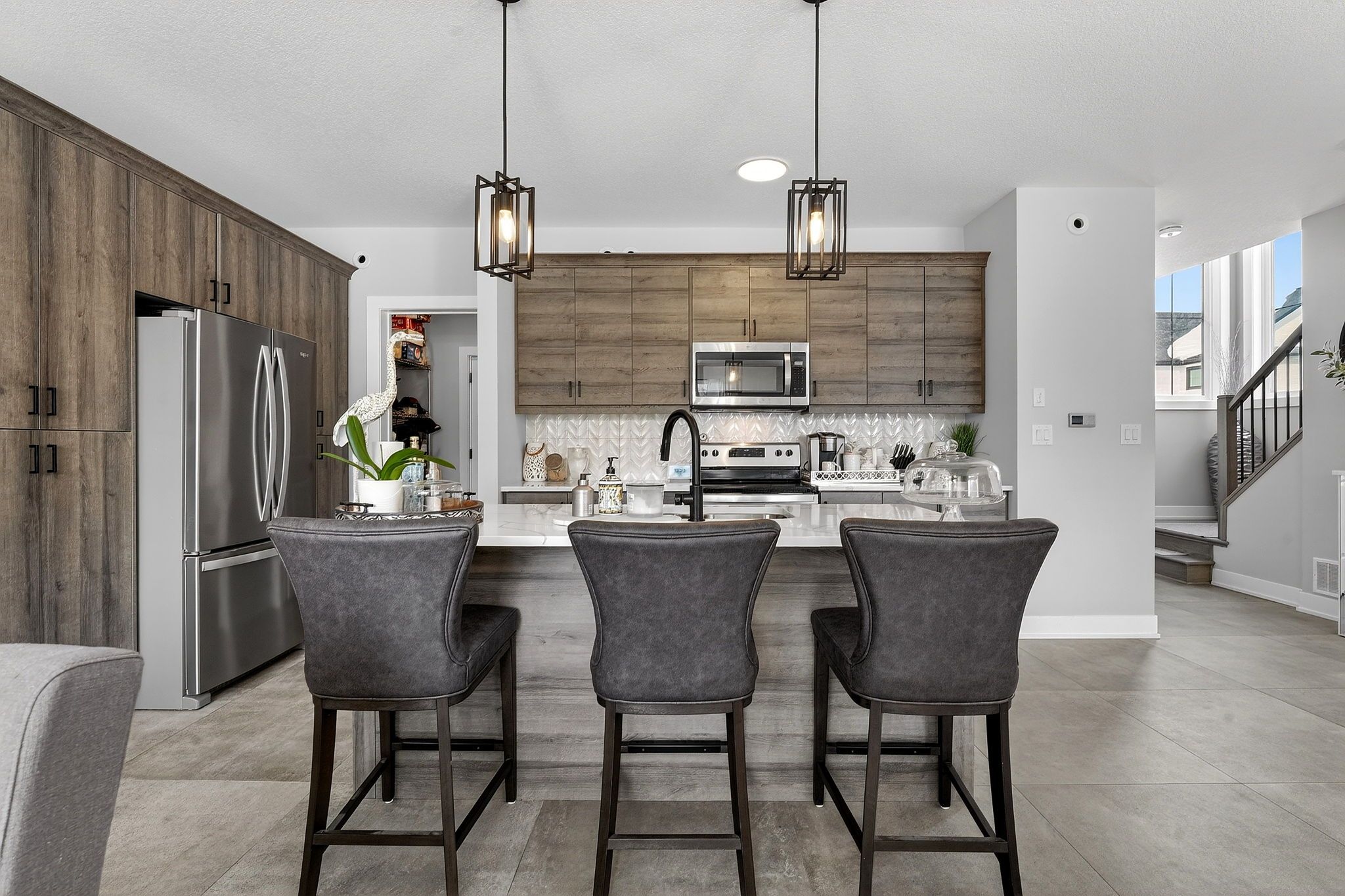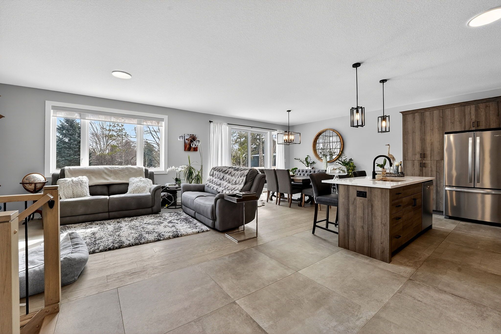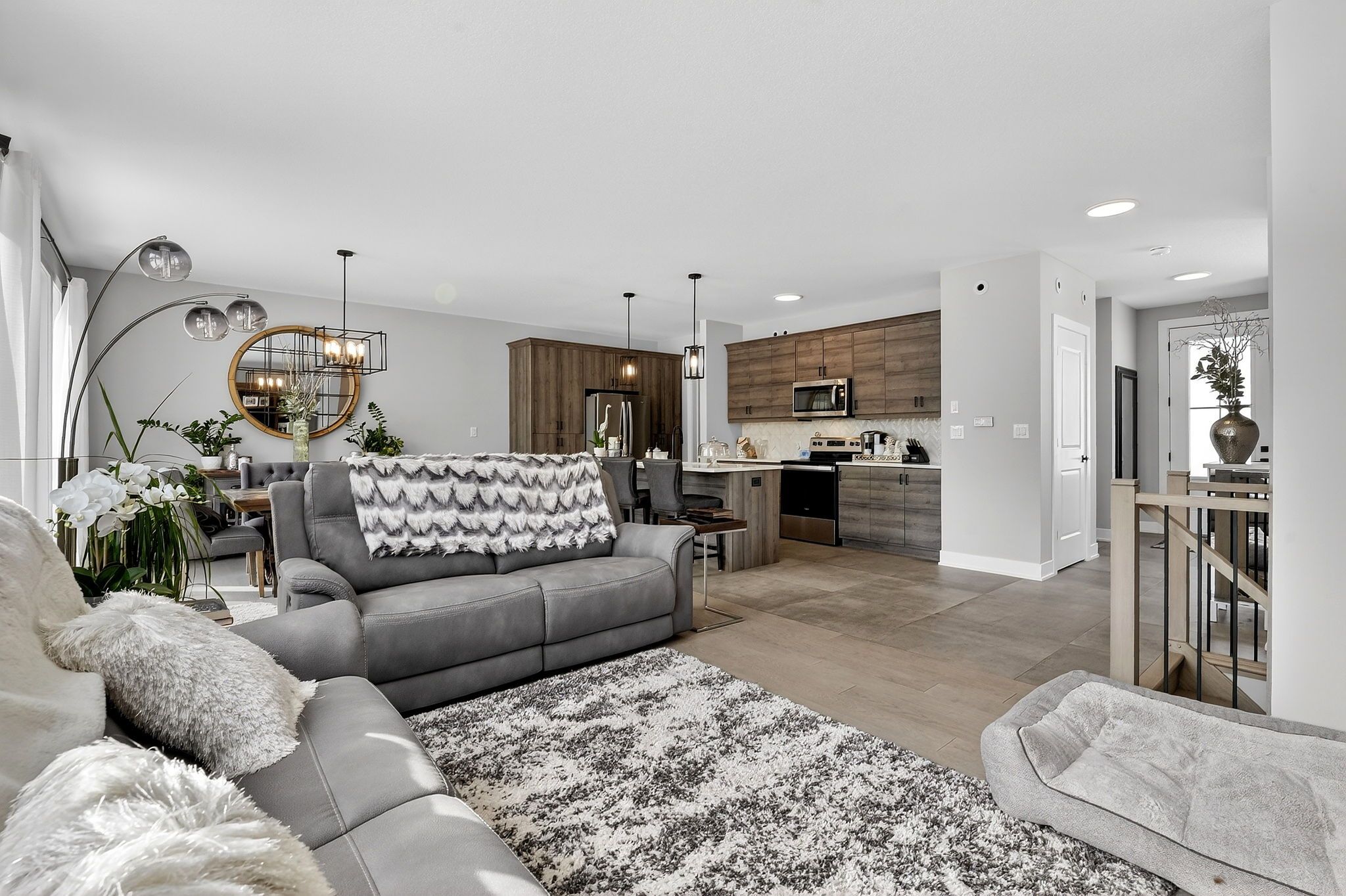 • Open-concept main level with a stylish kitchen and quartz countertops.