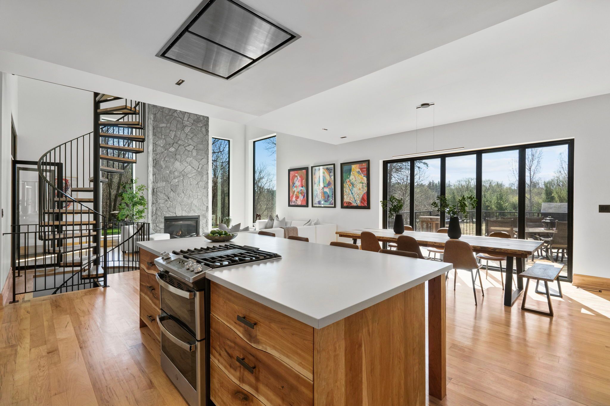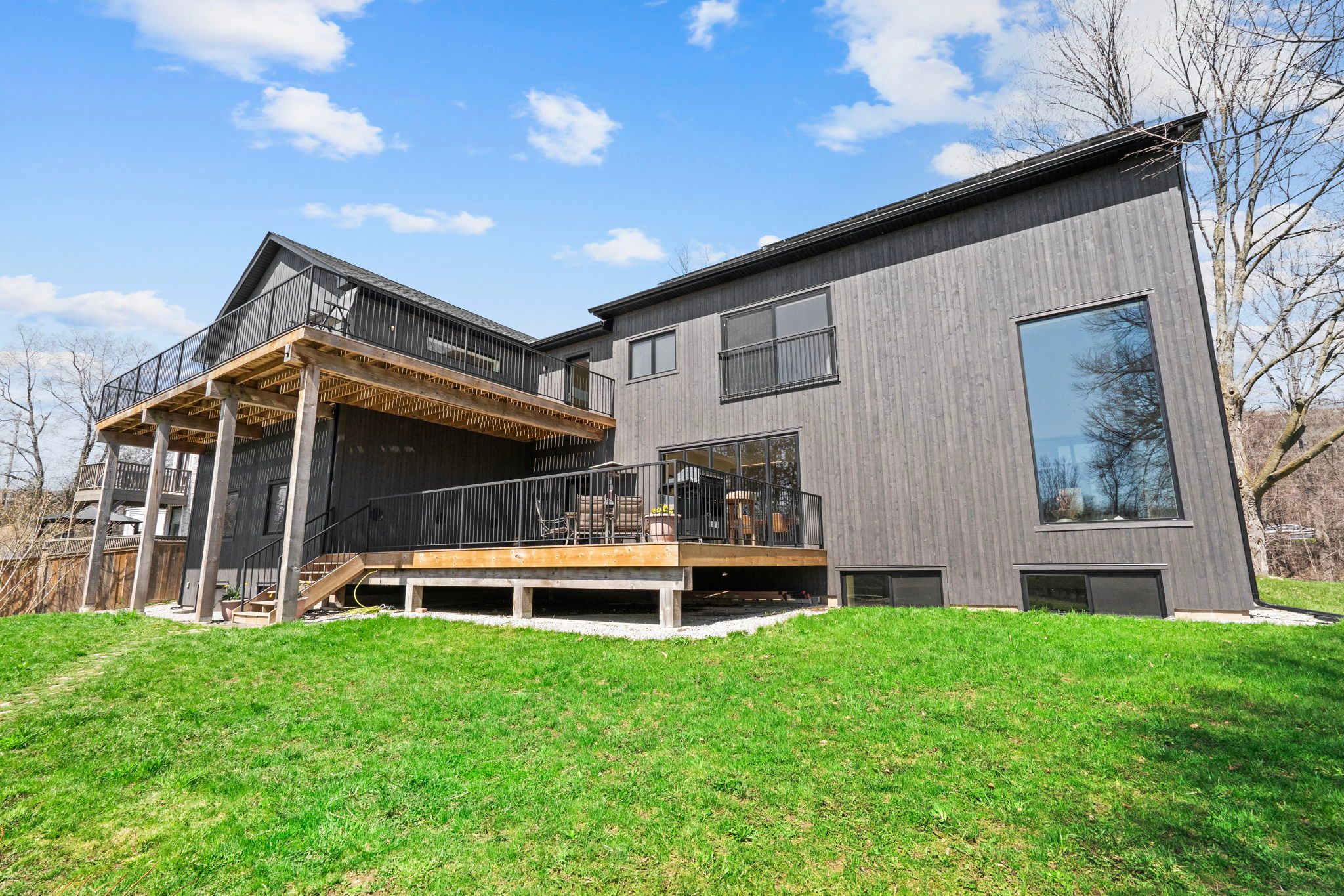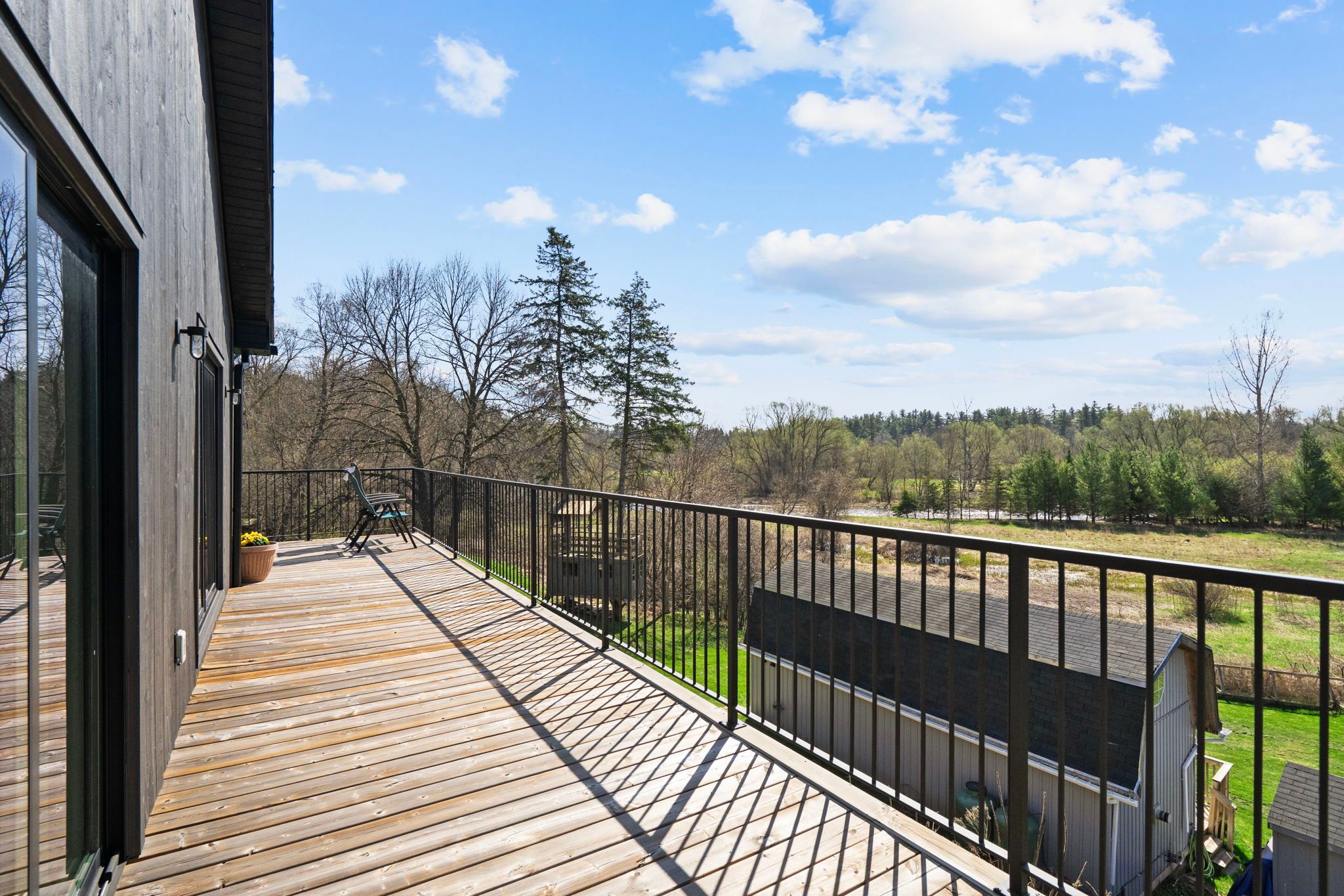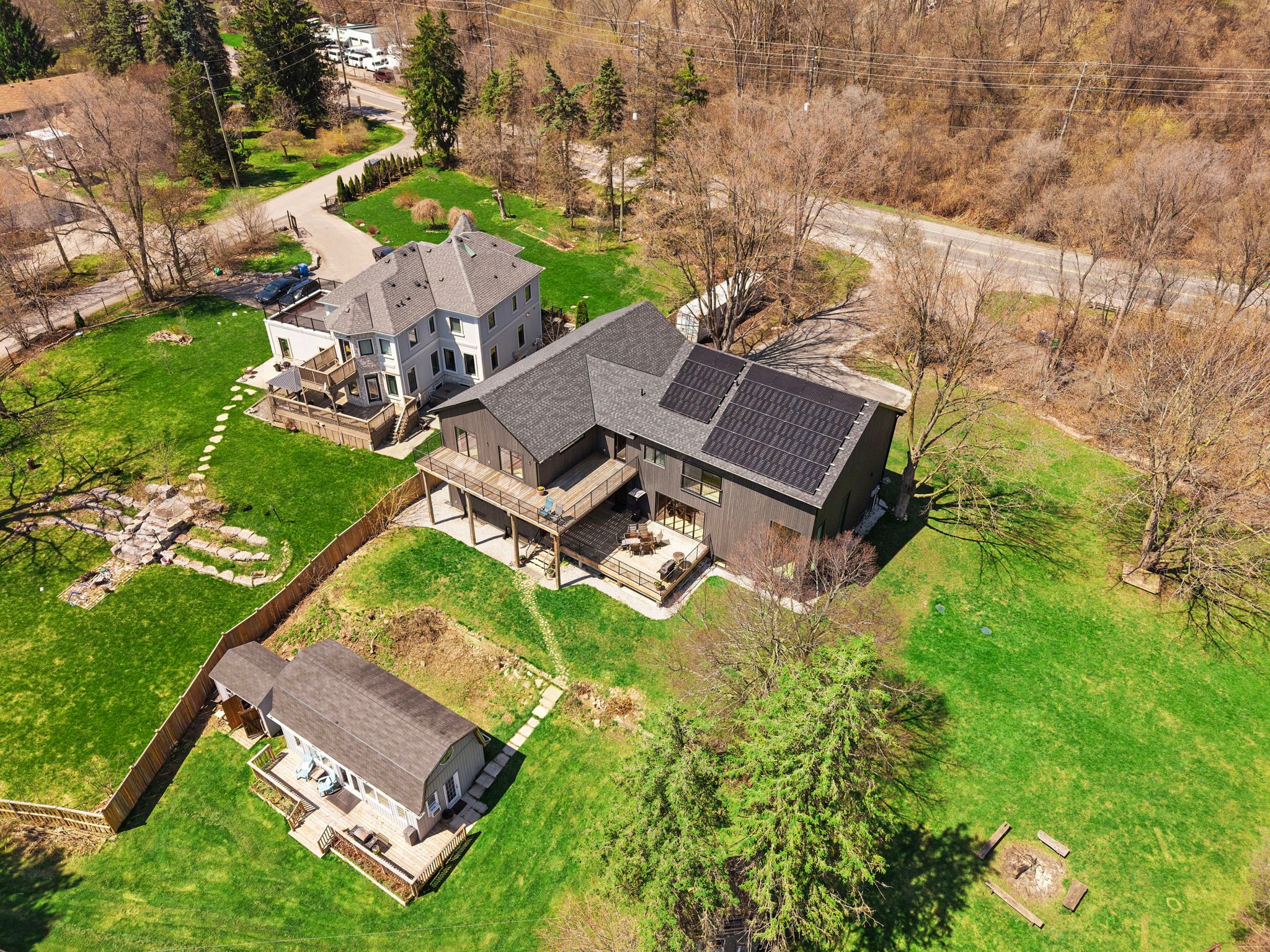 Where the credit runs quiet there are homes, and then there are statements. This modern chalet, perched above the credit river, belongs firmly in the latter category - a 5,500 + square foot artist's vision rendered in wood, stone, glass, and intention. You feel it the moment you cross the threshold. A grand foyer opens to soaring 20 + foot ceilings, staggering windows, and a towering column of stone anchoring an oversized fireplace that commands the room. Warm, polished maple floor carries you forward into a gallery-caliber center-plan main floor where every detail is purposeful - the custom wood island, the flush vent hood, the understated kitchen that knows exactly how powerful it is. At the heart of it all, a two-level spiral staircase threads three floors together with the kind of architectural drama that earns its place. A proper library steadies the mind nearby. A separate family entrance, mudroom, and cavernous garage-studio (with its own powder rm) anchor the home in real, livable, business for self functionality. Upstairs, four vaulted bedrooms and laundry - the principal suite framing river and escarpment views through glass, wrapped in custom millwork and a spa-caliber bath. Two mirrored bedrooms divide a family bath between them. Beyond the 2nd-level foyer: a versatile studio suite - finished, luminous, and ready to become whatever you require (including a secondary suite) . The lower level pours with natural light across a grand family room, a theatre, two-plus-one bedrooms, and two full baths. Beneath the suspended slab garage - a rec room that redefines the term gym. Step outside. A raised terrace. A lush yard above the river and open pastures. An orchard. A play structure with zip line. Room for a pool, a garage, or something you haven't imagined yet. And quietly set apart "the barn" a complete studio home serving as guest suite, income property, or personal sanctuary. This is not a listing. It is a life, fully built. ***video is a must watch!