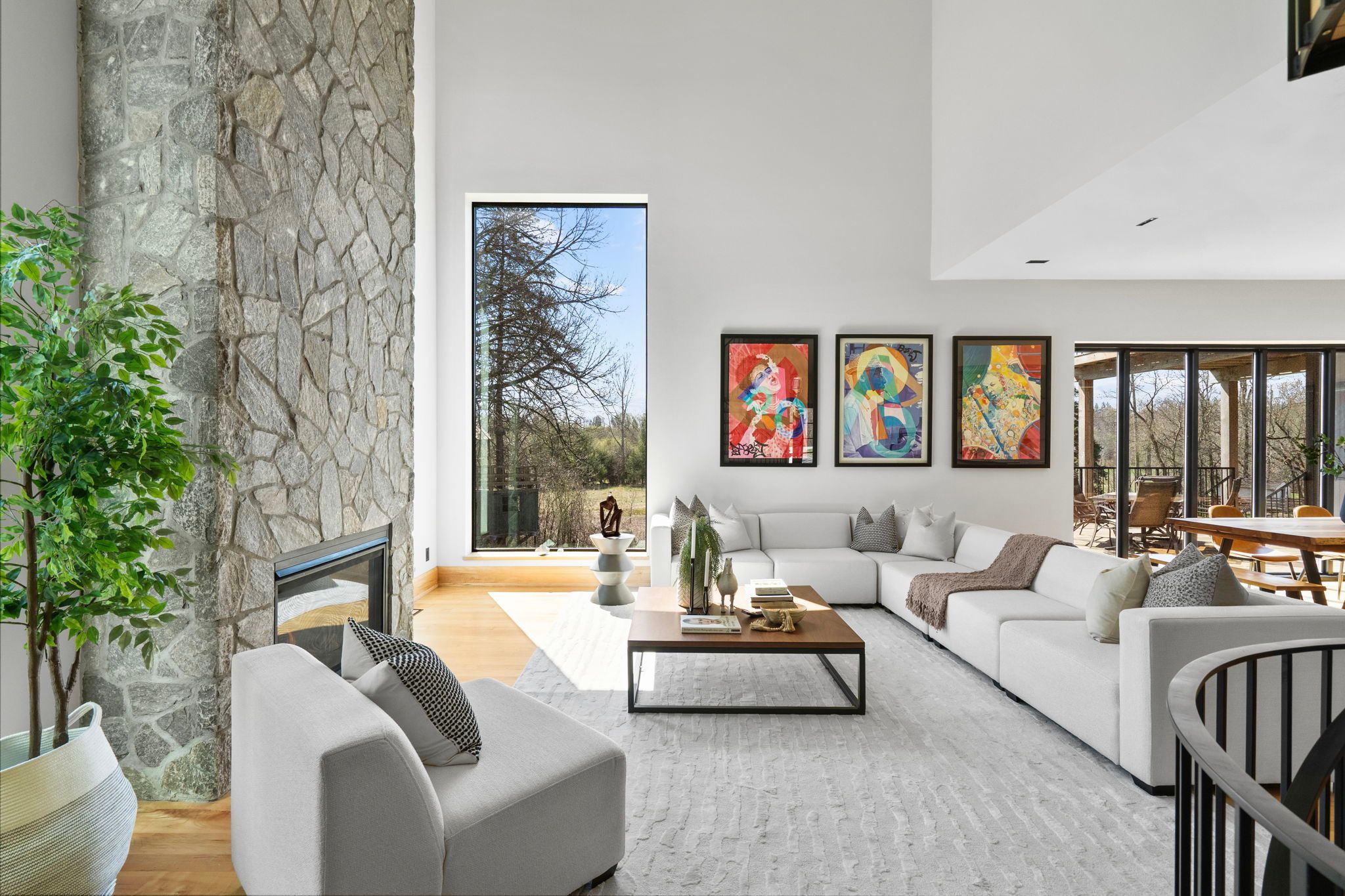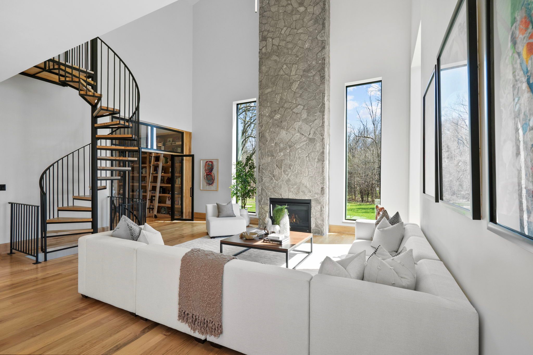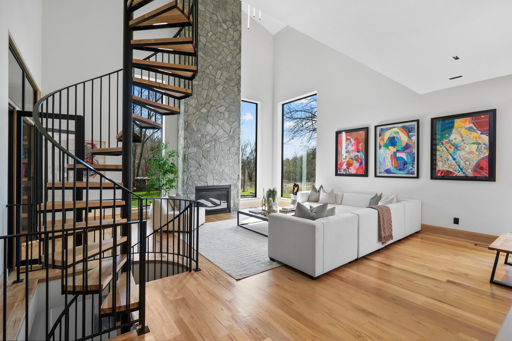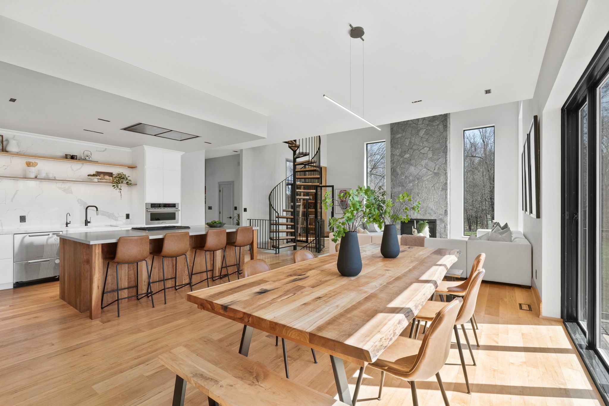 Where the credit runs quiet there are homes, and then there are statements. This modern chalet, perched above the credit river, belongs firmly in the latter category - a 5,500 + square foot artist's vision rendered in wood, stone, glass, and intention. You feel it the moment you cross the threshold. A grand foyer opens to soaring 20 + foot ceilings, staggering windows, and a towering column of stone anchoring an oversized fireplace that commands the room. Warm, polished maple floor carries you forward into a gallery-caliber center-plan main floor where every detail is purposeful - the custom wood island, the flush vent hood, the understated kitchen that knows exactly how powerful it is. At the heart of it all, a two-level spiral staircase threads three floors together with the kind of architectural drama that earns its place. A proper library steadies the mind nearby. A separate family entrance, mudroom, and cavernous garage-studio (with its own powder rm) anchor the home in real, livable, business for self functionality. Upstairs, four vaulted bedrooms and laundry - the principal suite framing river and escarpment views through glass, wrapped in custom millwork and a spa-caliber bath. Two mirrored bedrooms divide a family bath between them. Beyond the 2nd-level foyer: a versatile studio suite - finished, luminous, and ready to become whatever you require (including a secondary suite) . The lower level pours with natural light across a grand family room, a theatre, two-plus-one bedrooms, and two full baths. Beneath the suspended slab garage - a rec room that redefines the term gym. Step outside. A raised terrace. A lush yard above the river and open pastures. An orchard. A play structure with zip line. Room for a pool, a garage, or something you haven't imagined yet. And quietly set apart "the barn" a complete studio home serving as guest suite, income property, or personal sanctuary. This is not a listing. It is a life, fully built. ***video is a must watch!