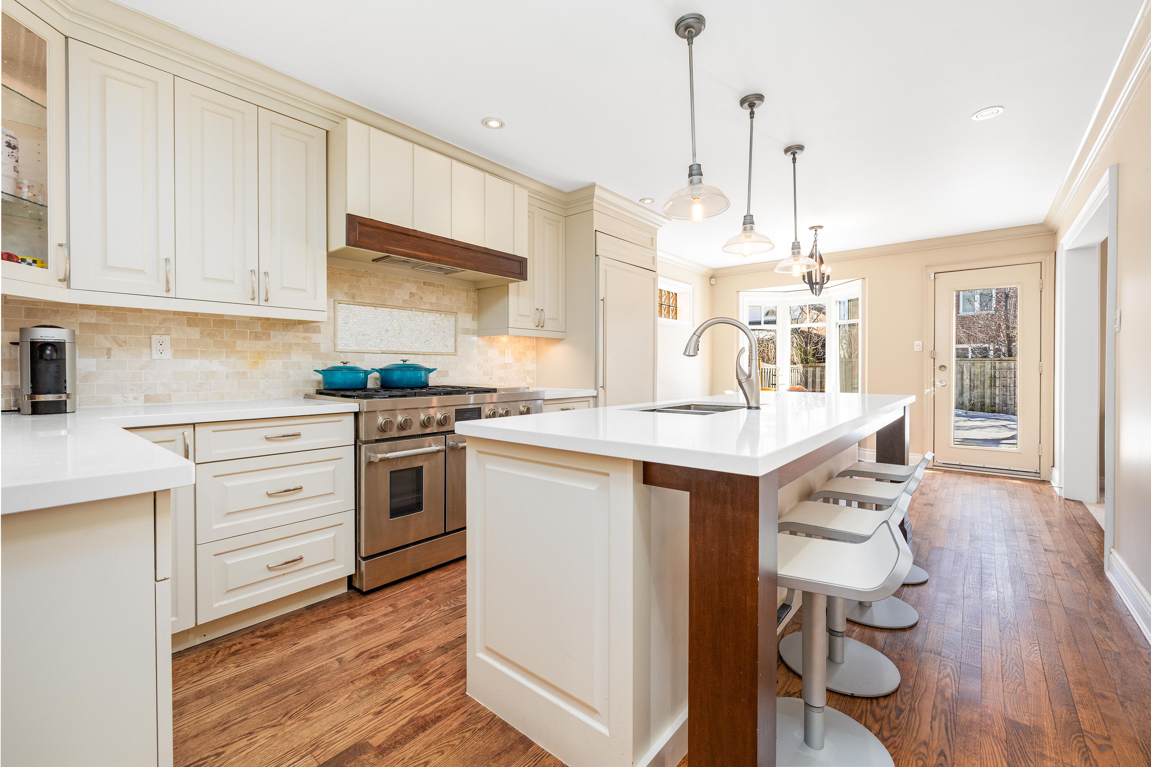 • Custom eat-in kitchen with stainless steel appliances and butler's pantry.