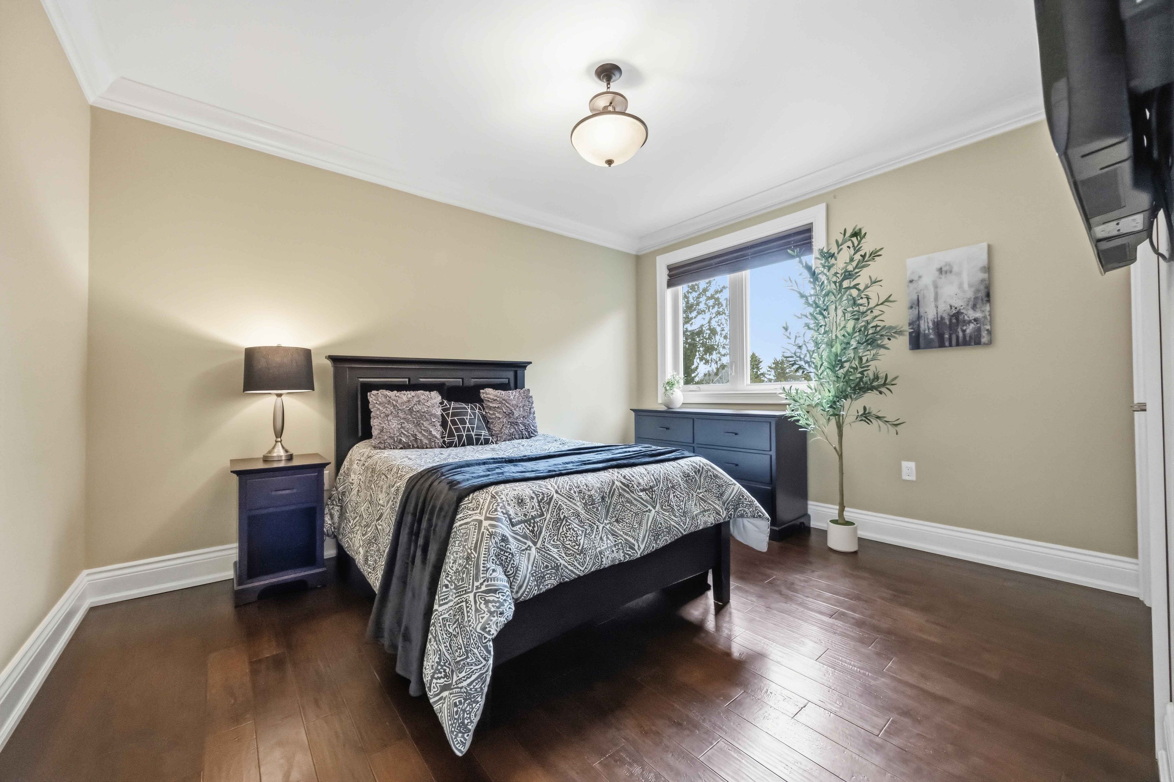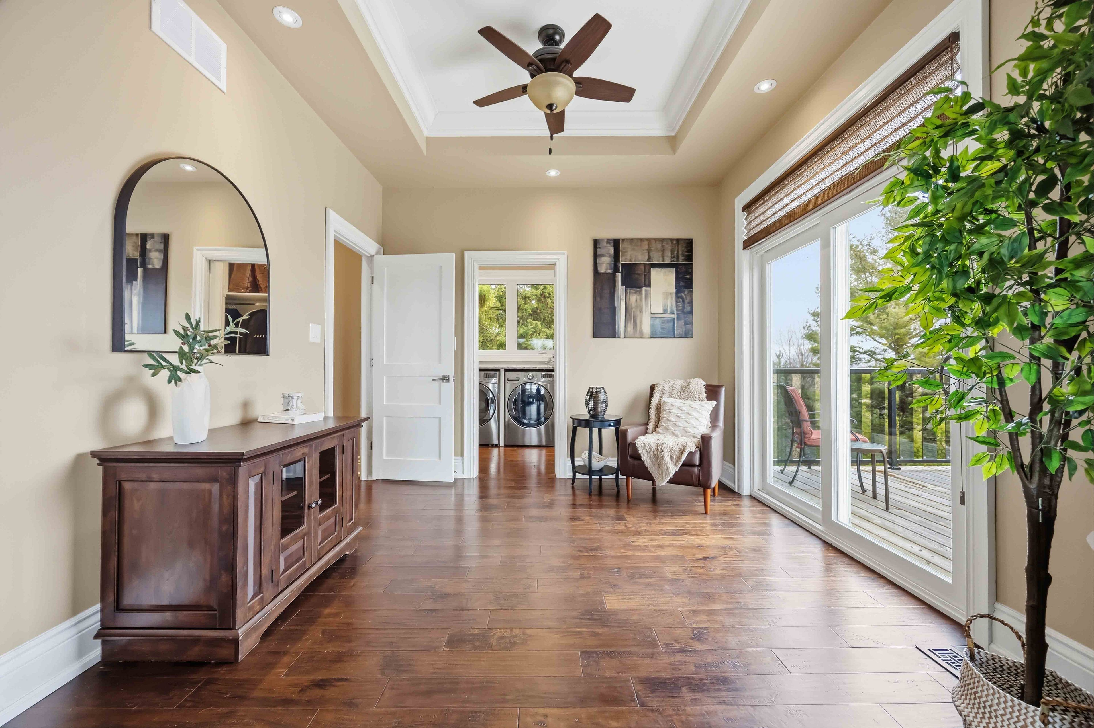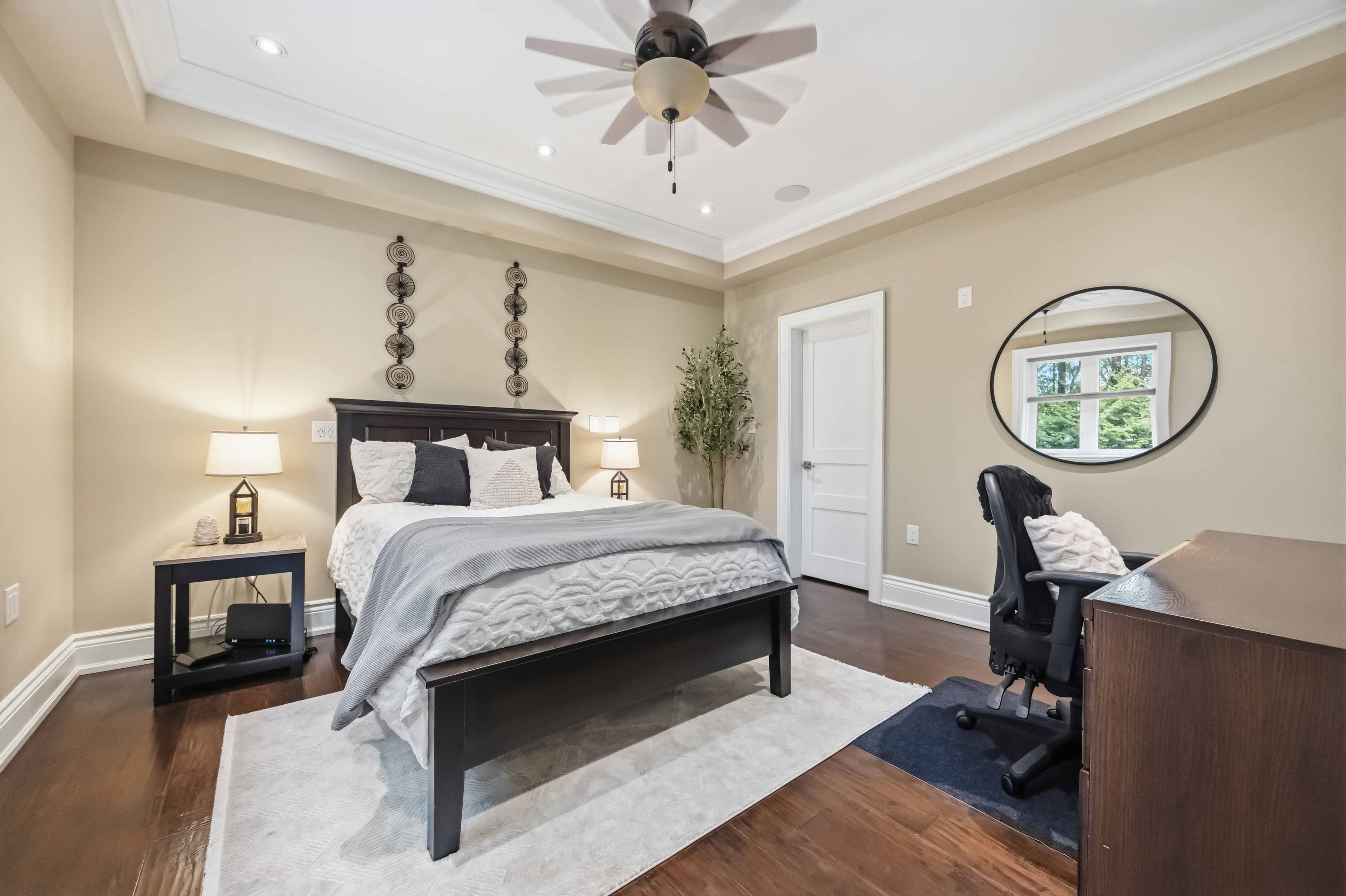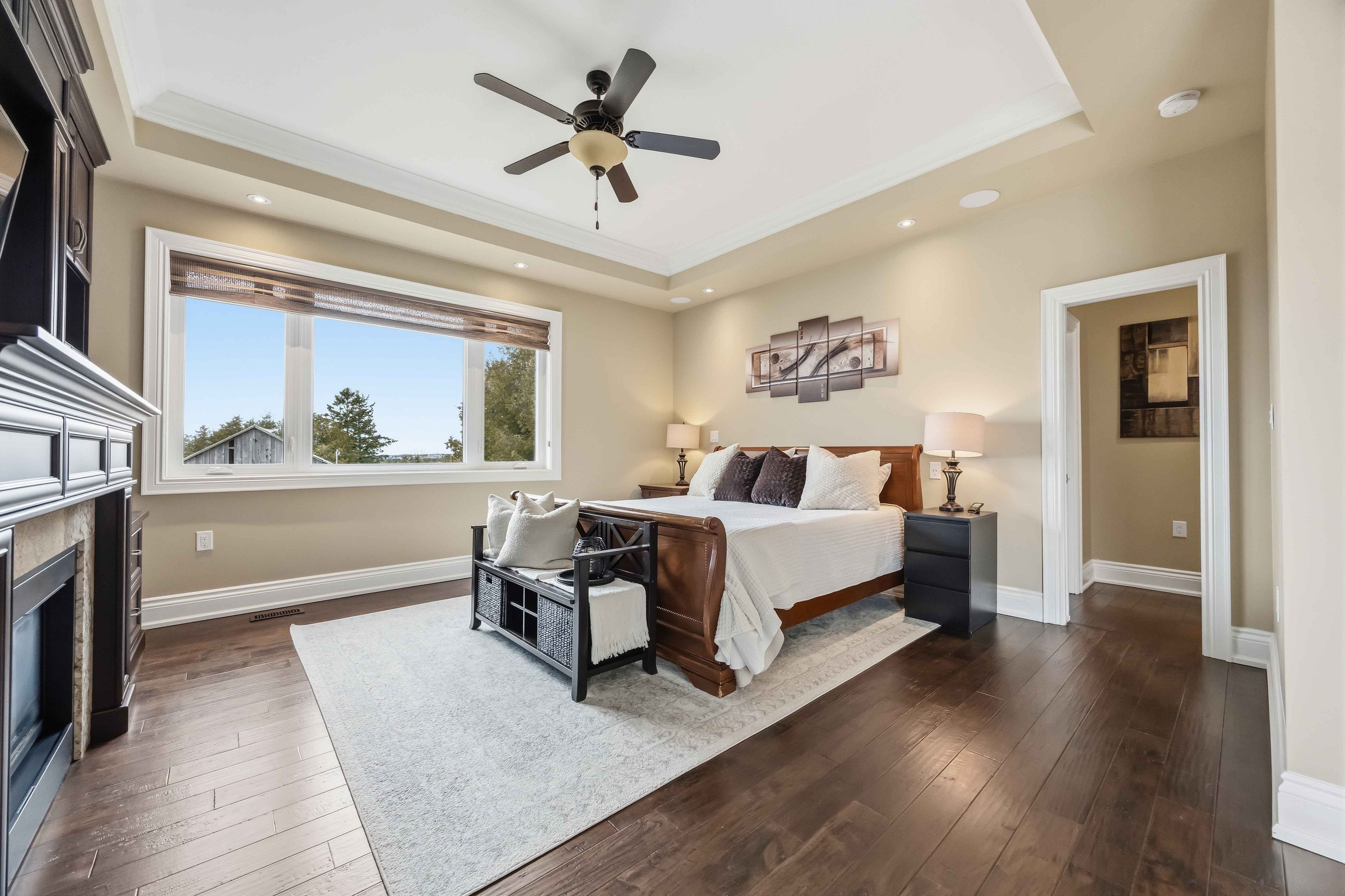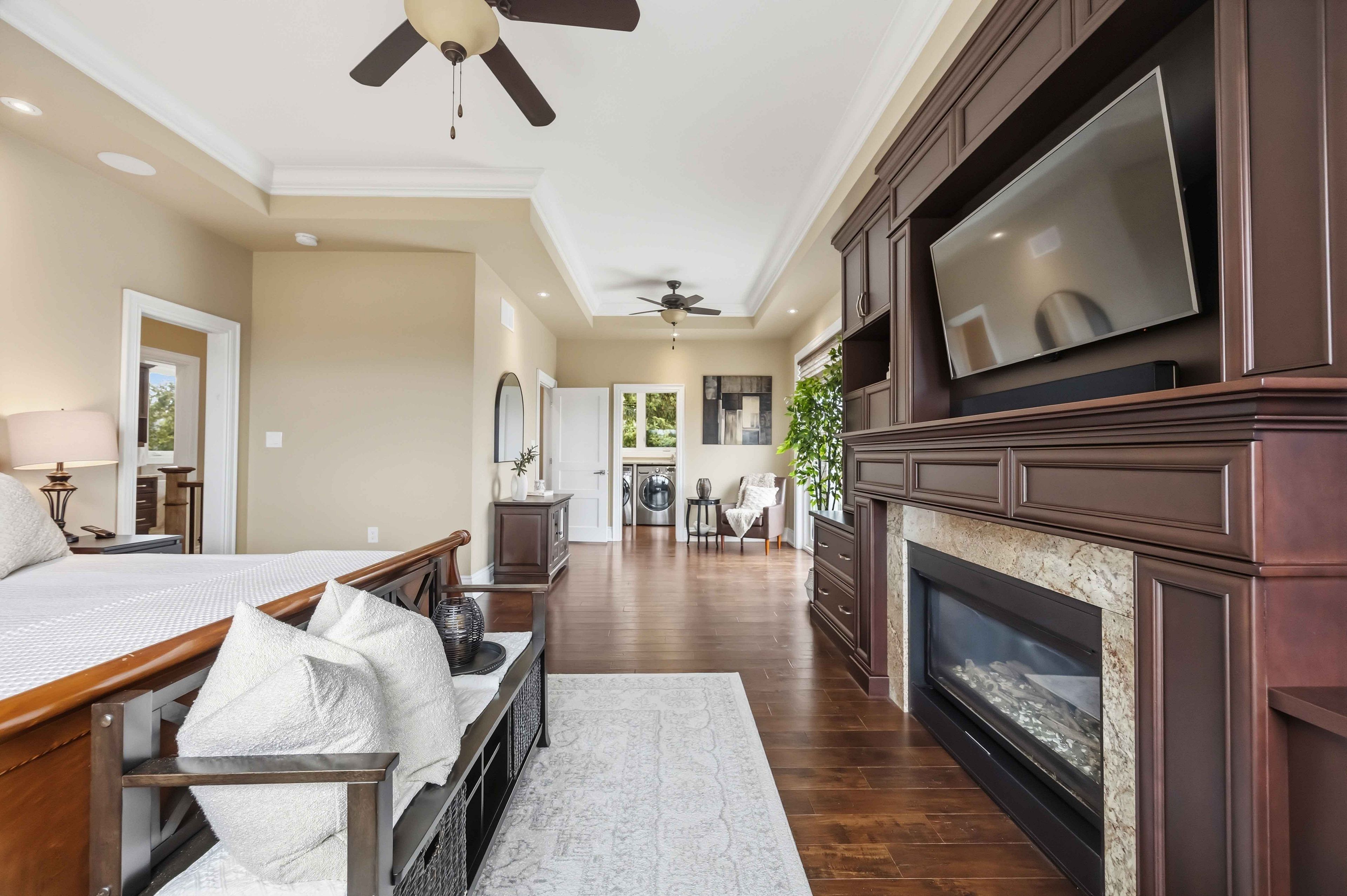 • Spacious primary bedroom with coffered ceiling, gas fireplace, and spa-like ensuite.